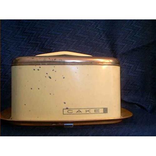 Metal cake saver is a very pretty yellow, the word "Cake" is printed on the front. Cake saver measures 5.5 inches tall. There are some scratch places on top, but very clean on the inside. Perfect for a country or retro kitchen.