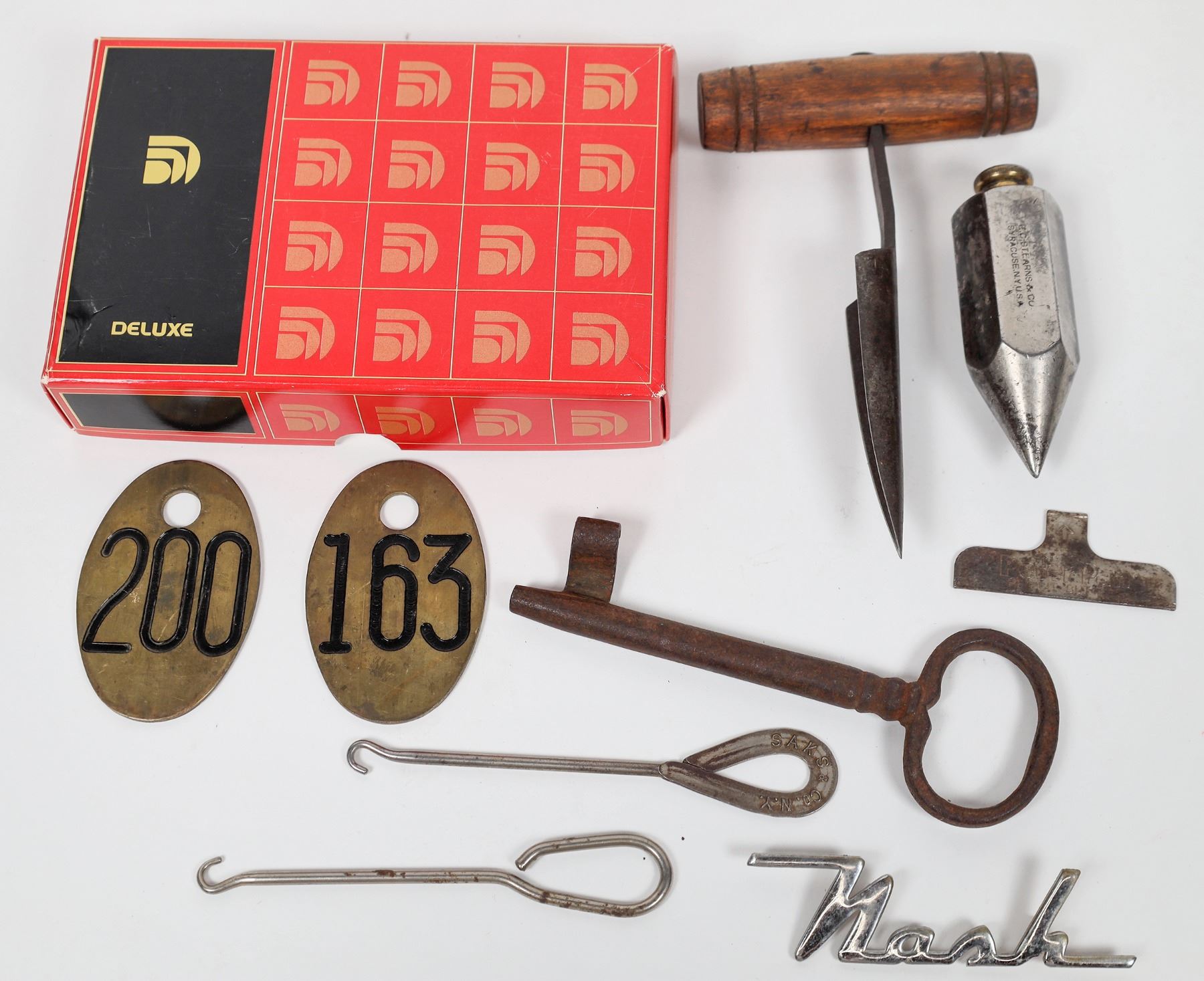 Group of miscellaneous metal collectibles. Includes a plumb bob from E.C. Stearns and Co. in Syracuse, two key tags, a key, two button hooks (one from Sacks & Co., NY), and more. Nine pieces total. Some rust.