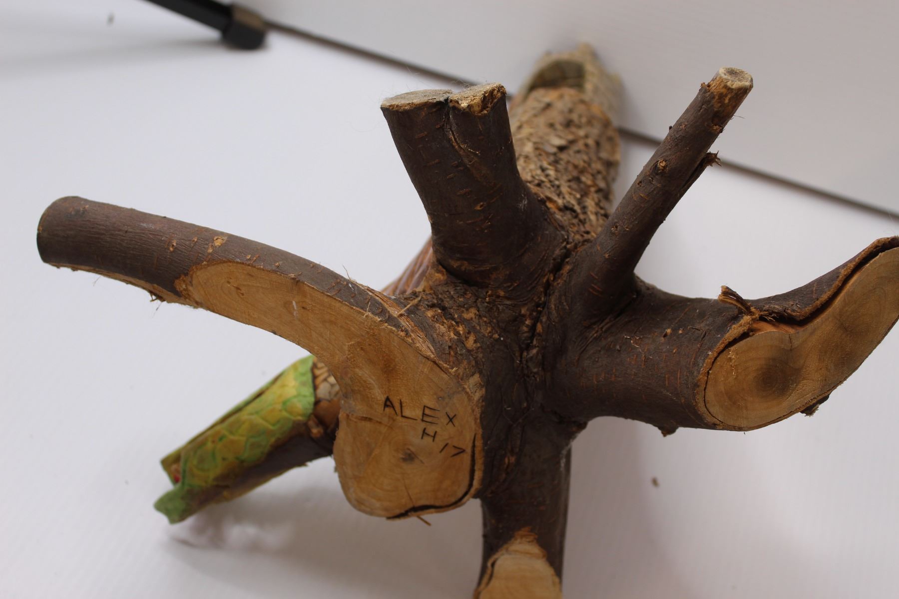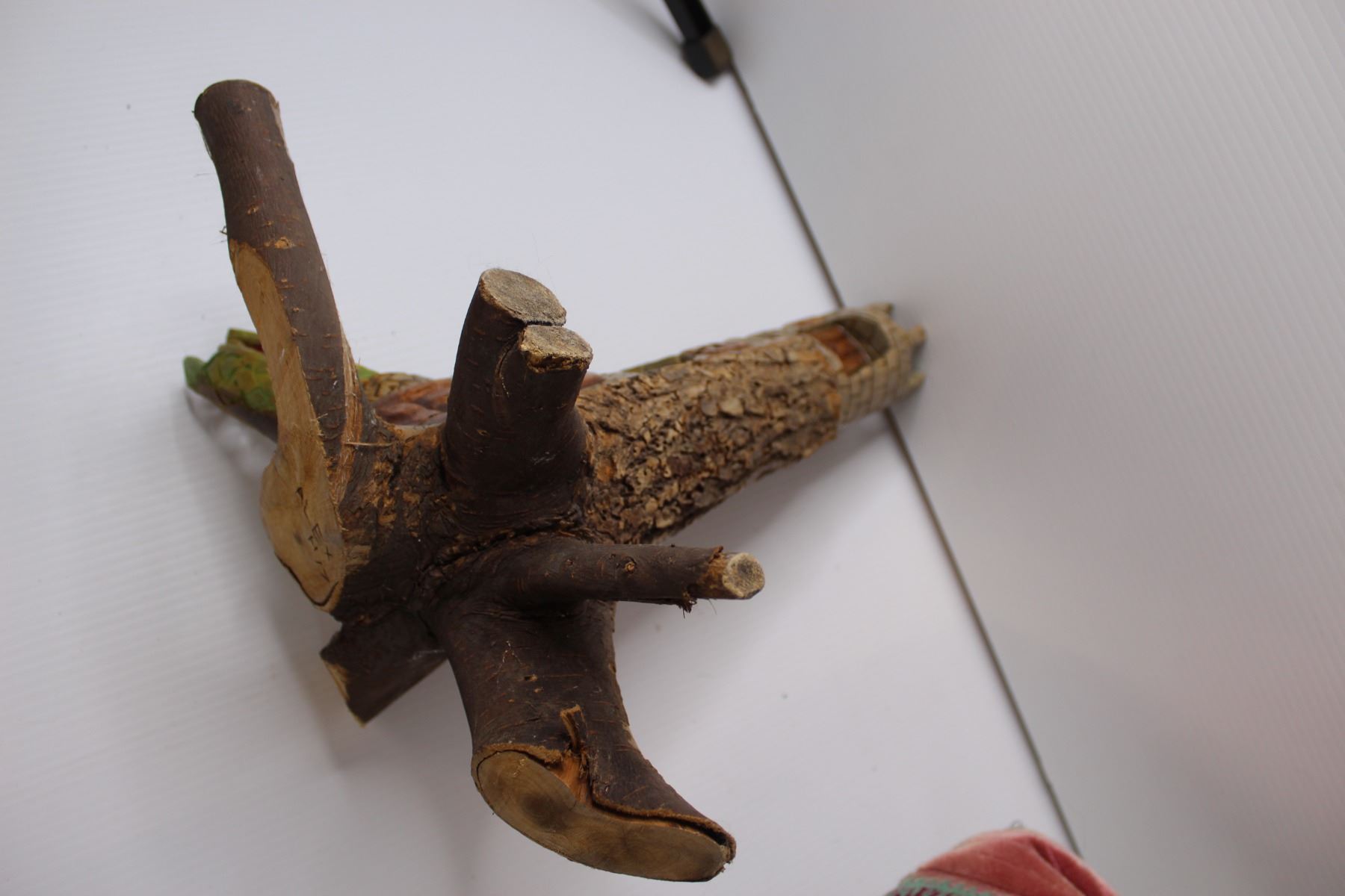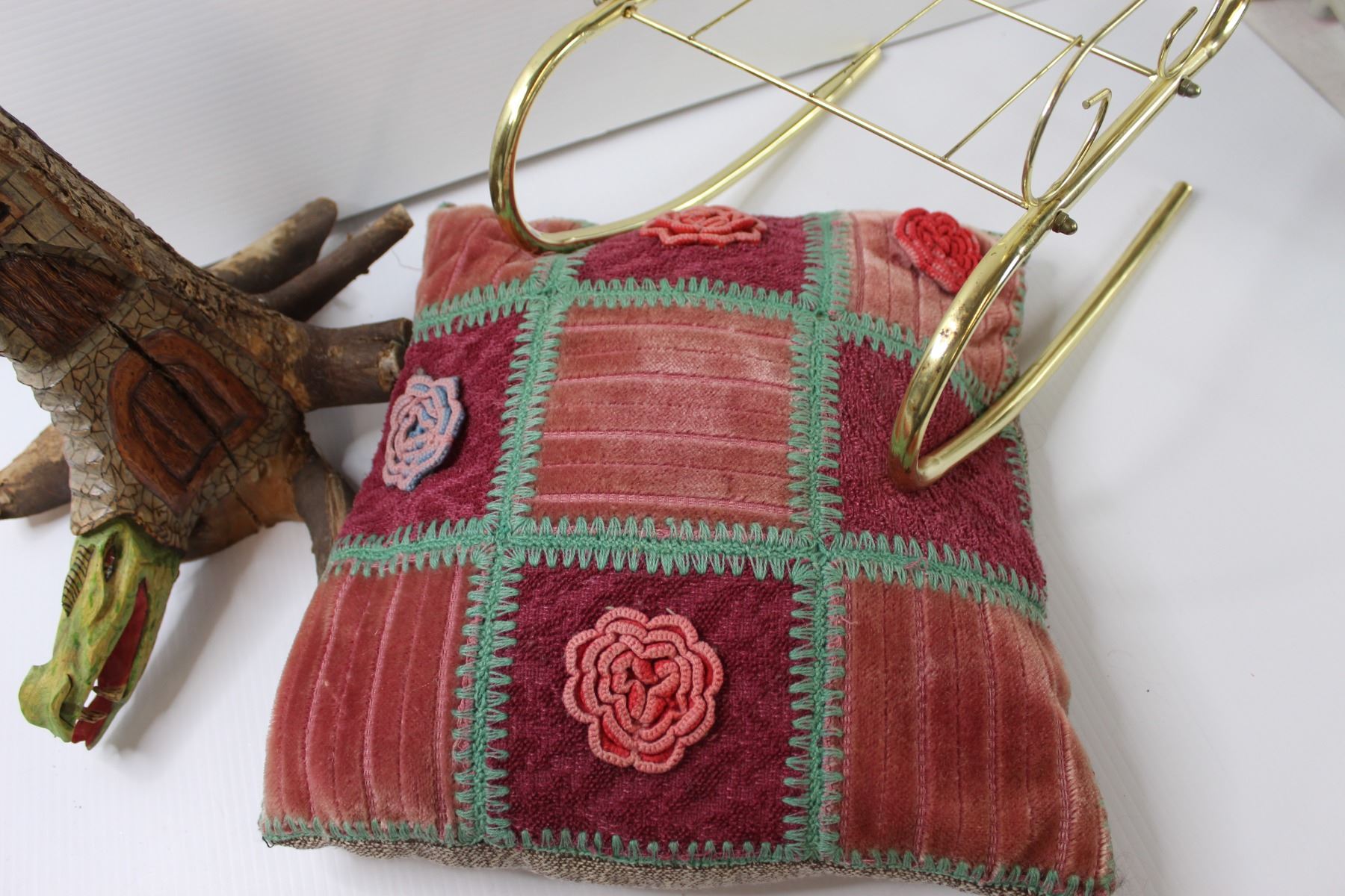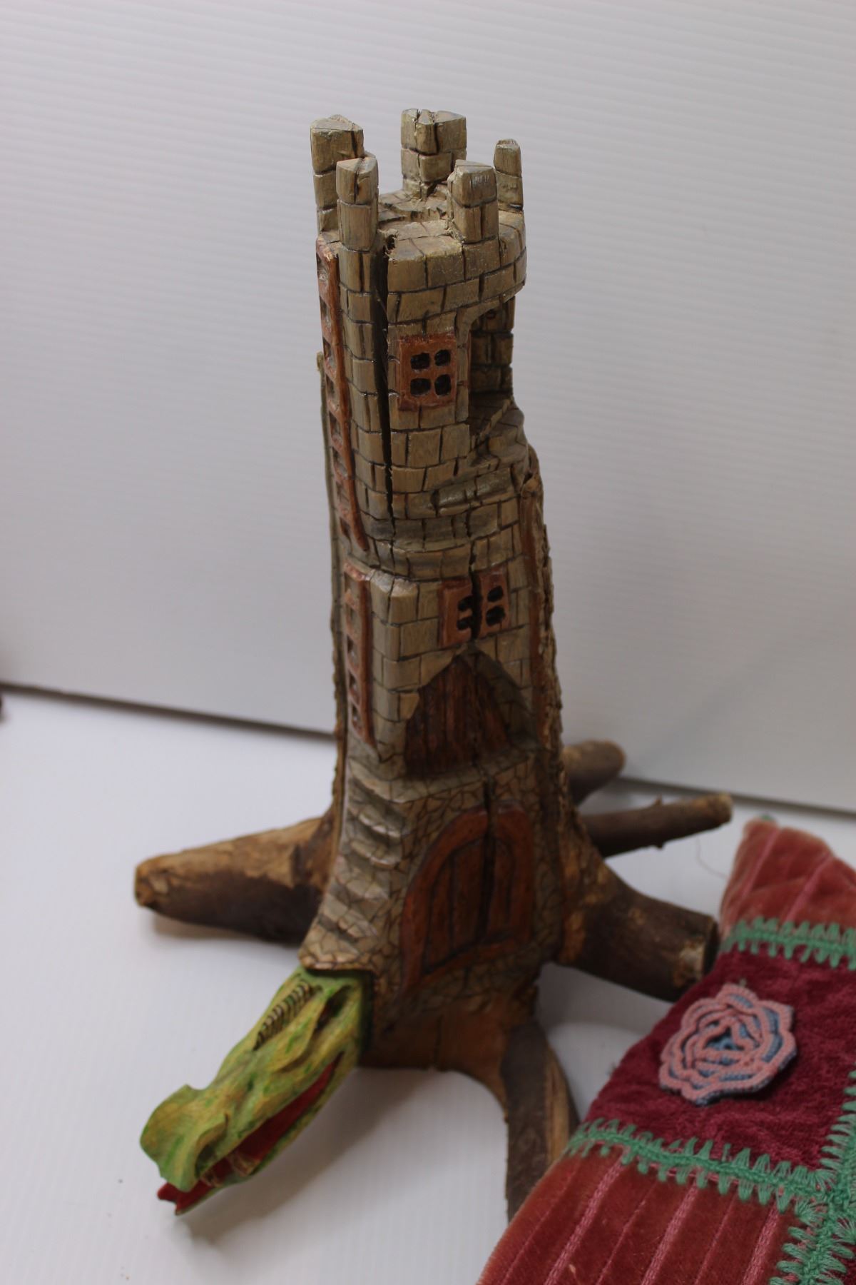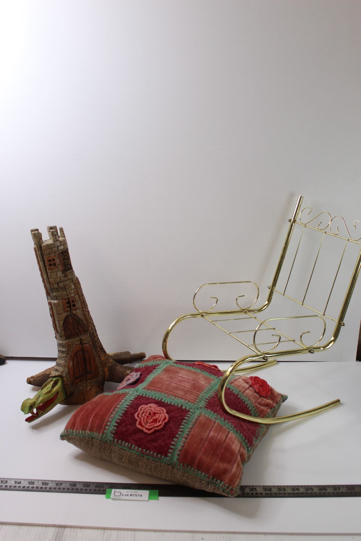 Metal Decor Rocking Chair, Rose Throw Pillow - Has Tear, Alligator Castle Statue Carved Out of Tree Stump