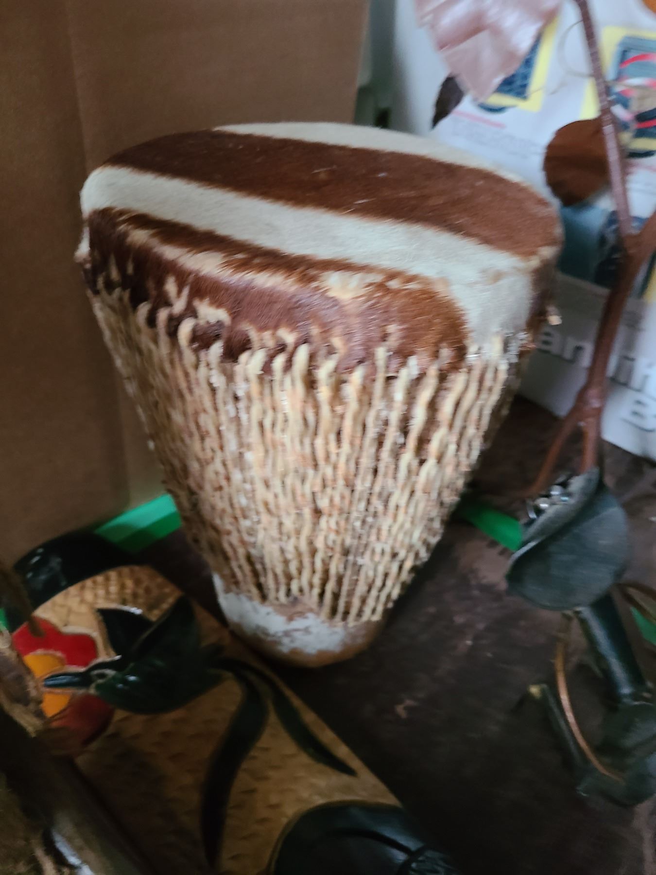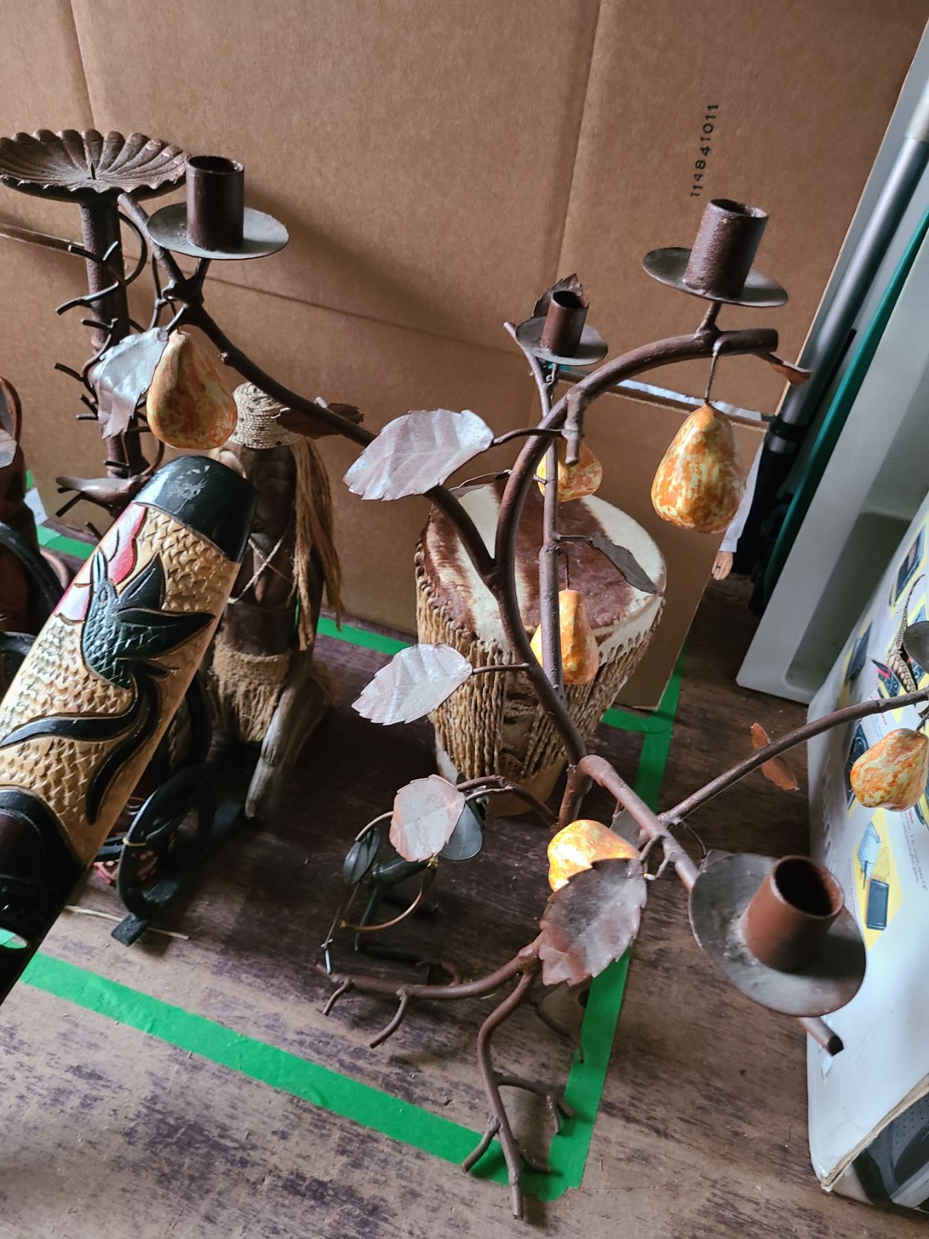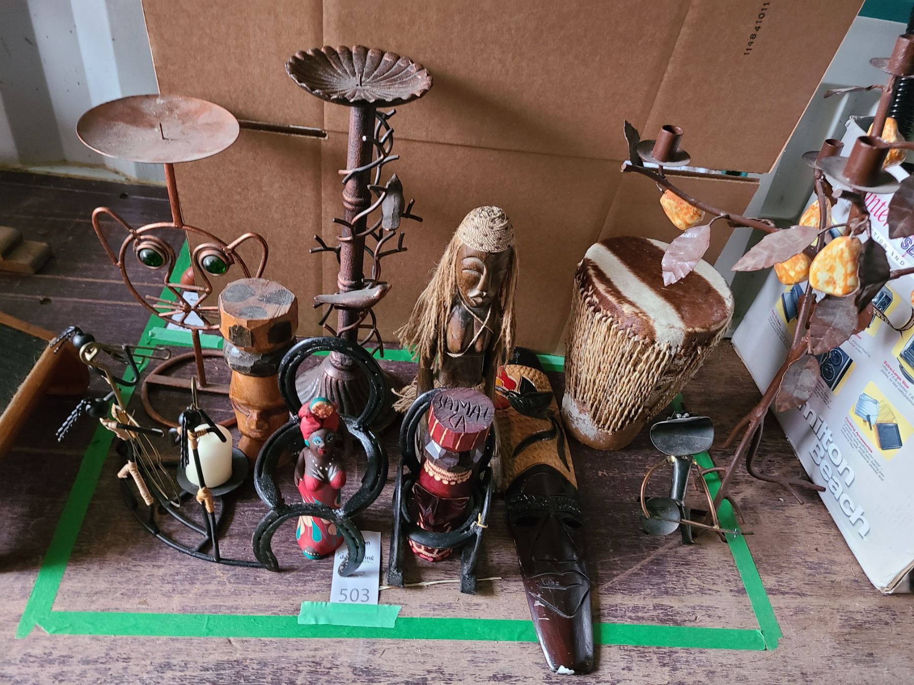 Metal African style decor including drums, candle holders and mask. Bring packing supplies. Pickup at 9 am.