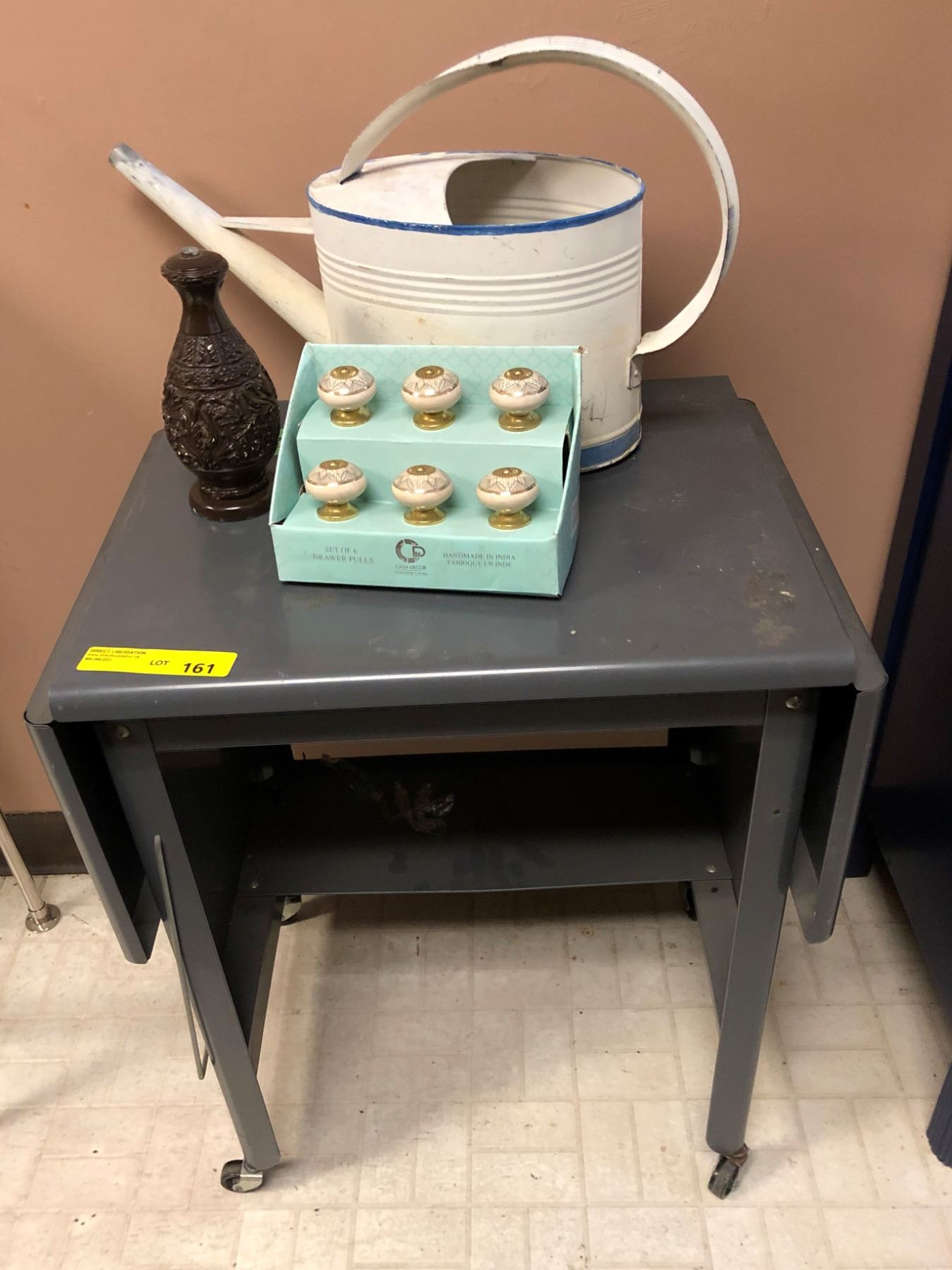 Metal Desk with 6 Drawer Pulls, and Vintage Watering Can.
