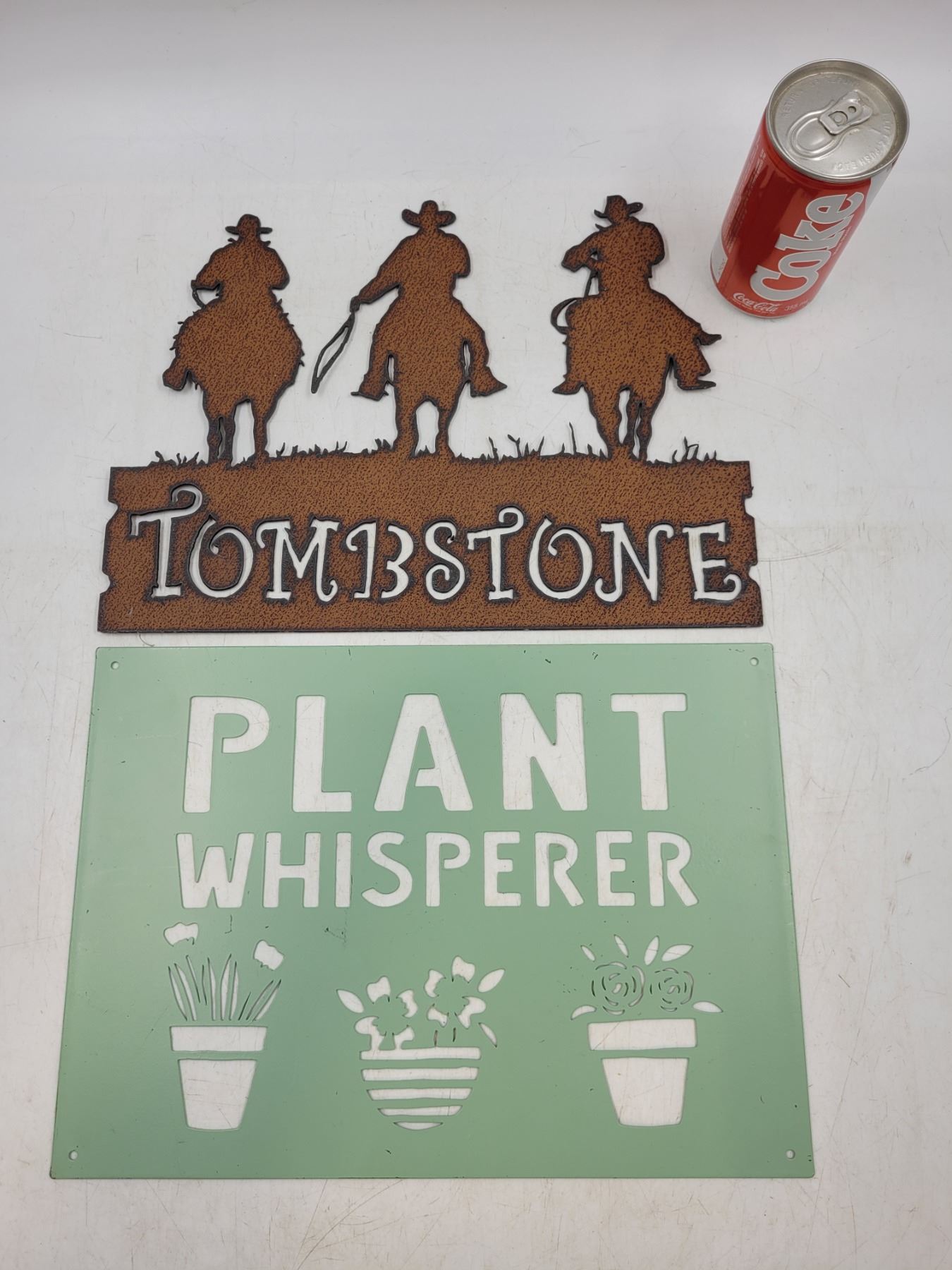 Metal Die-Cut Tombstone and Plant Whisperer Signs