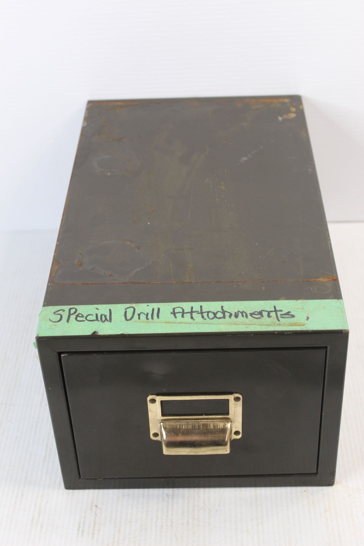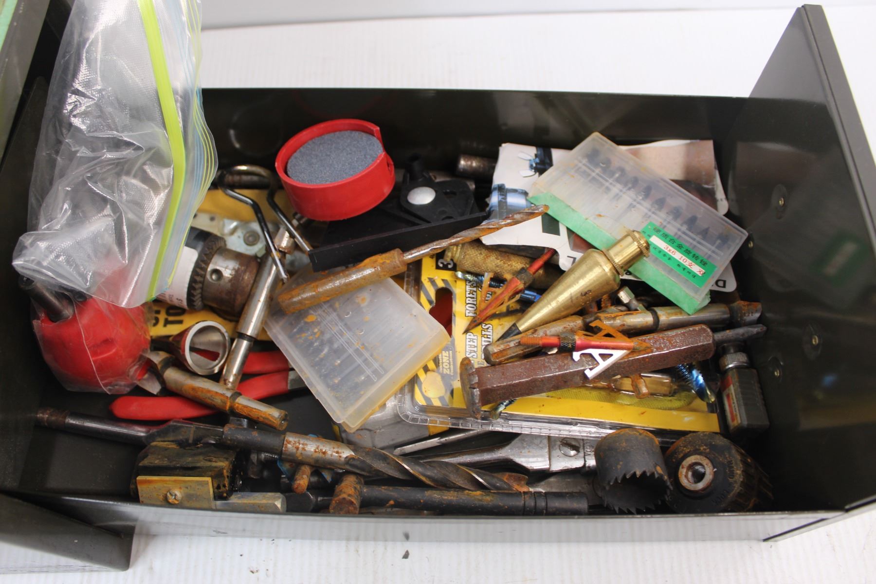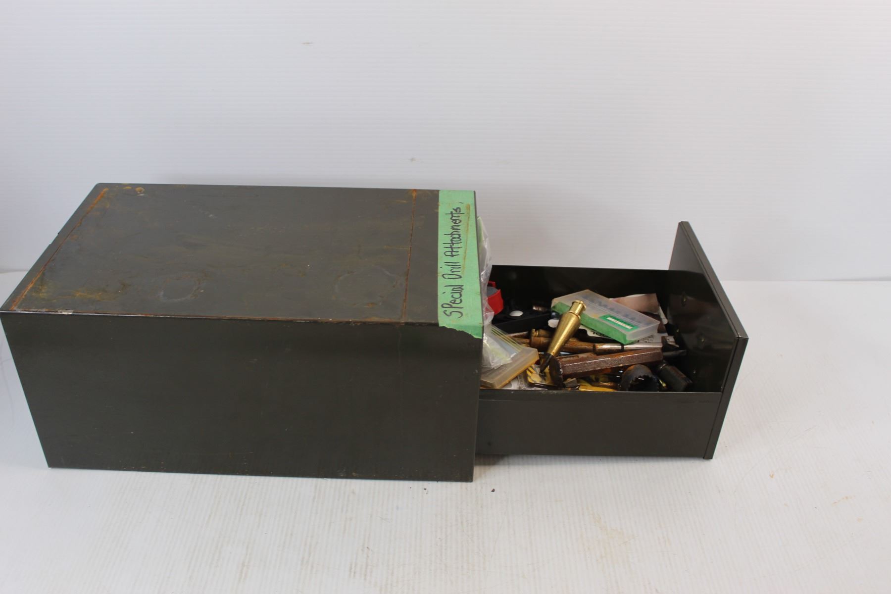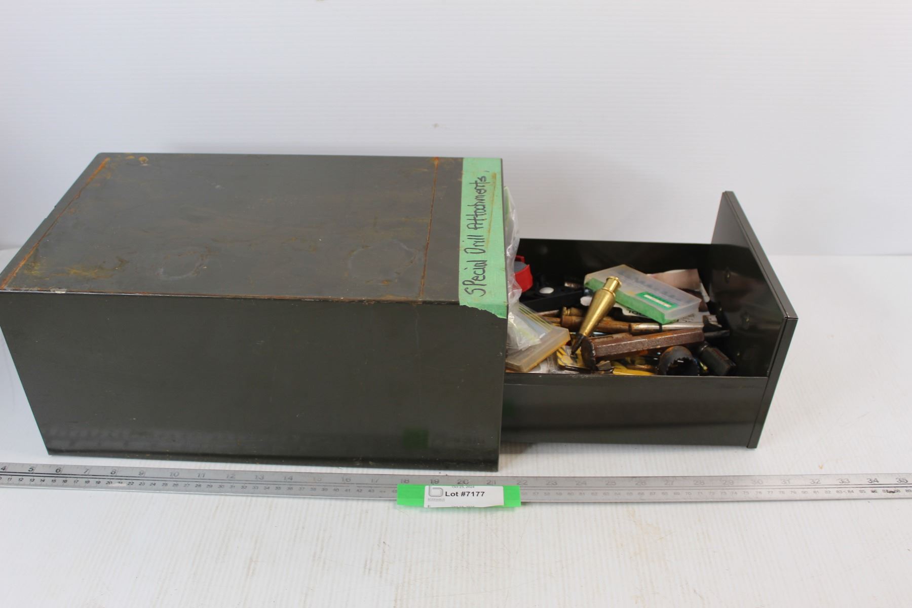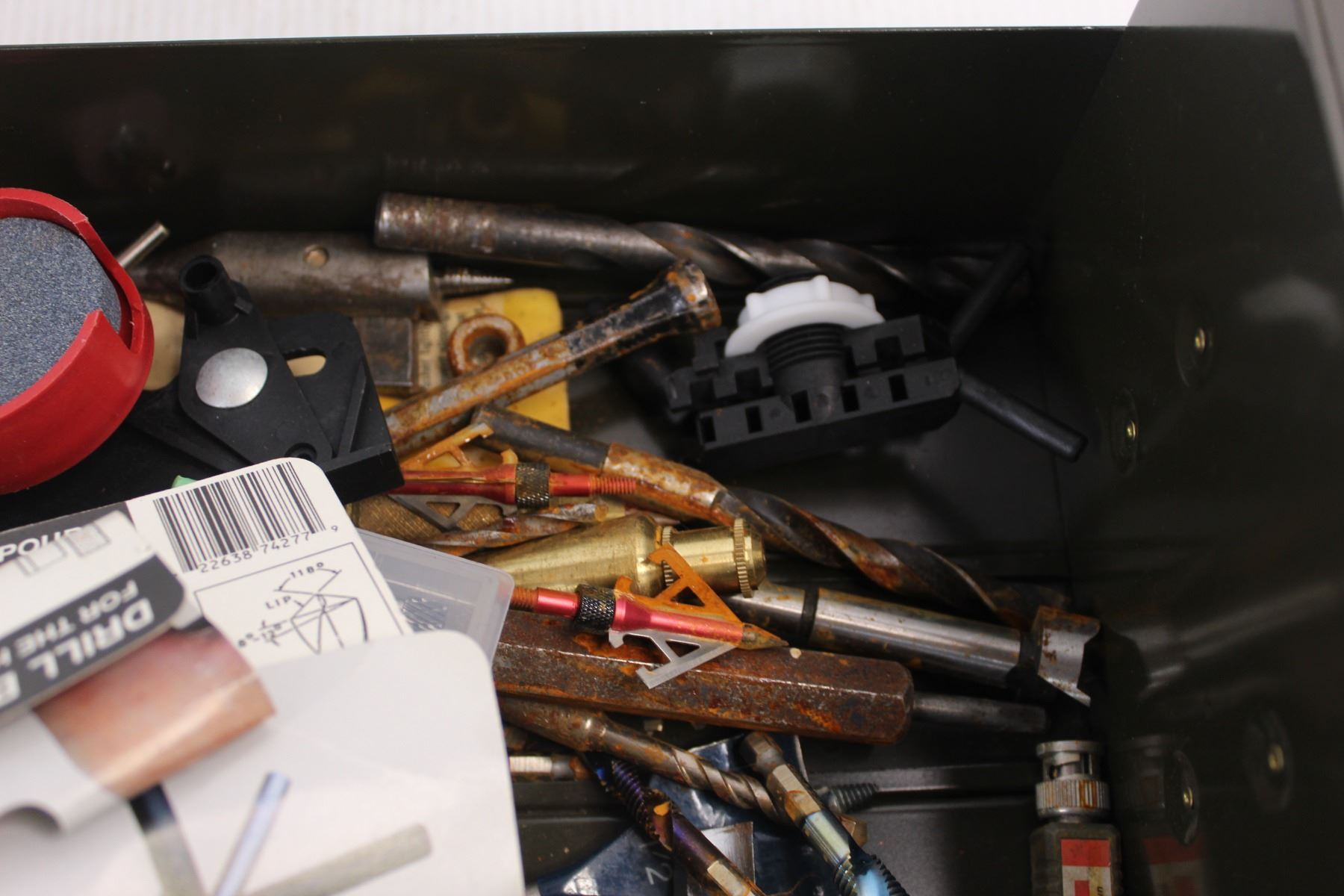 Metal Drawer Box With Various Items, Plumb Bobs, Arrow Razor Tips, Drill Bits, Misc.