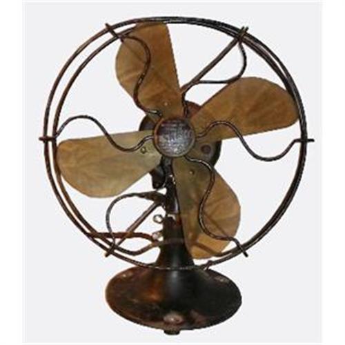 From the 1920's or 30's, this fan works great. It oscillates well and puts out a nice amount of air. The face plate says "Eskimo, Model 35." It has brass fan blades, a painted steel face, a black cast iron base and a new cord. The blades shimmer when running.