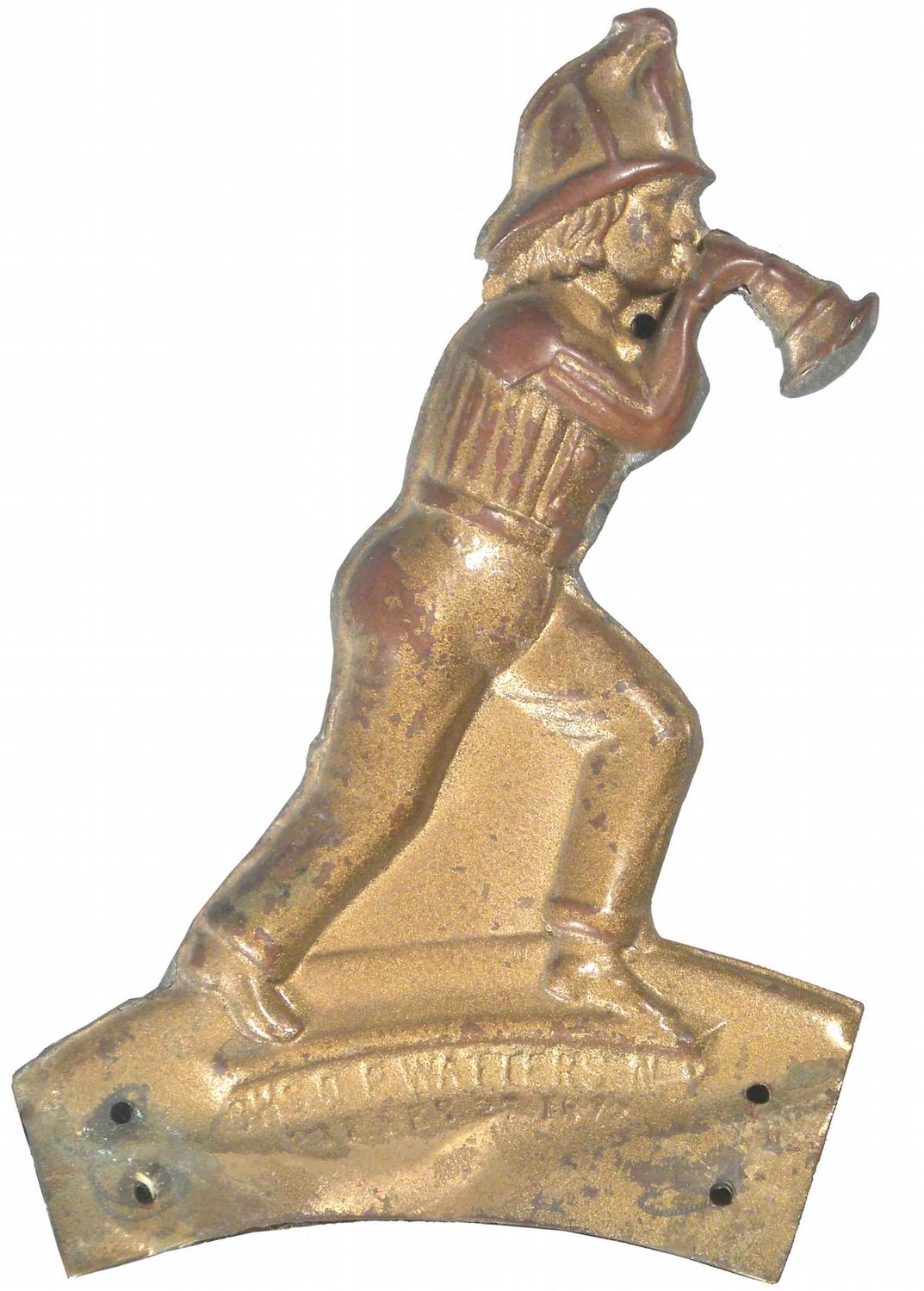Metal Front Shield Holders. Fireman blowing trumpet by CHS D.P. Watters, NY. Very good original condition.