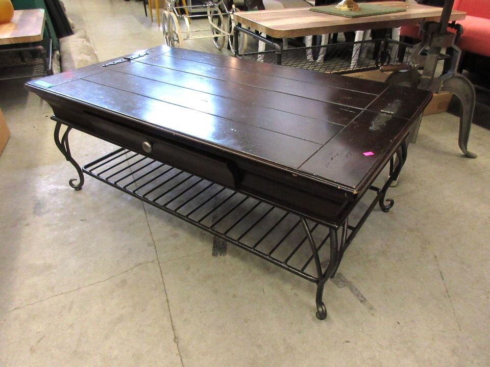 Top lifts up. Metal shelf in base. 28" x 50" x 19" tall