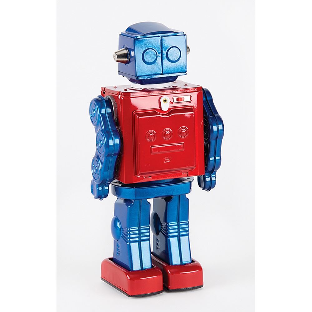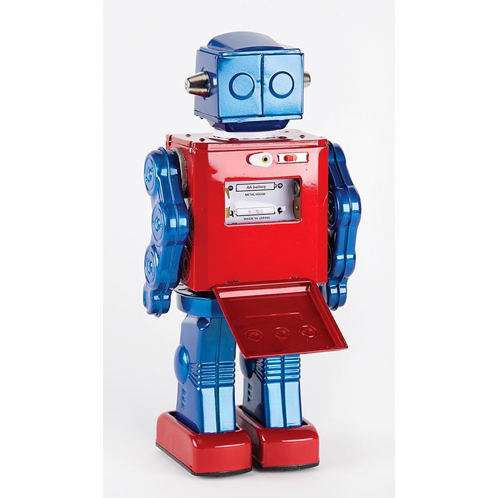 Fantastic circa 2000s battery-operated "Metal Frontier" walking tin toy robot, made in Japan by Metal House, standing at 12Àù tall. The nice retro robot has a blue-and-red body with classic lithographed designs, and chest window with pilot in the 'cockpit.' After the robot takes a few steps, it pauses, two doors flip open to reveal the pilot's guns, and they fire with flashing lights and sounds as the robot's torso spins. Includes its original box.