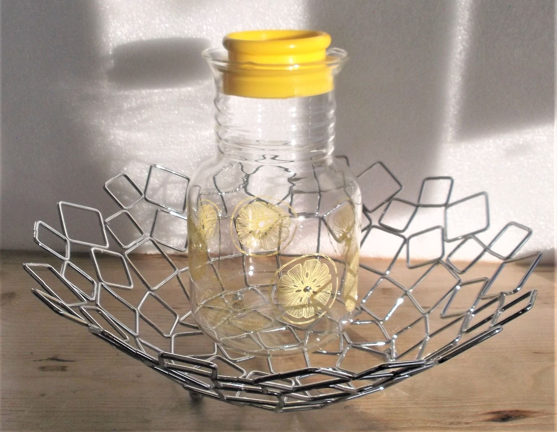 Metal Fruit Bowl and Pyrex Lemonade Pitcher