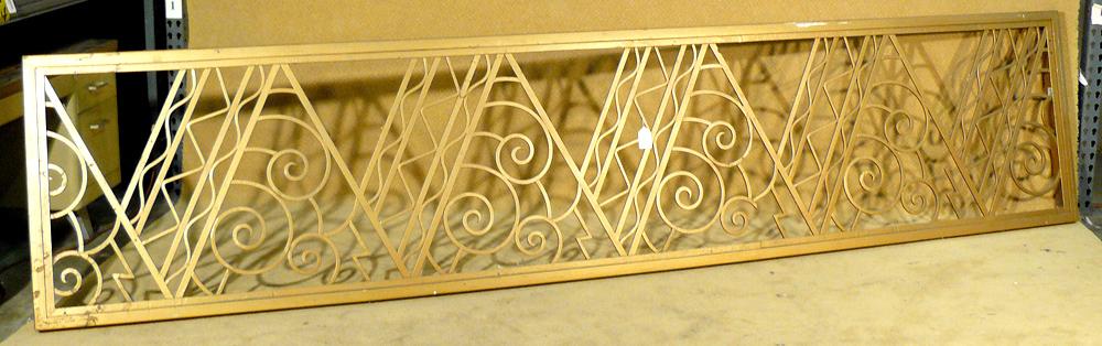 Iron grating railing with wooden frame and highly ornate designs. 151"X 33 1/2" X 3 1/2"