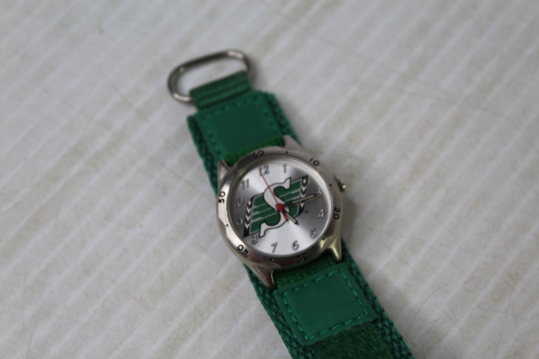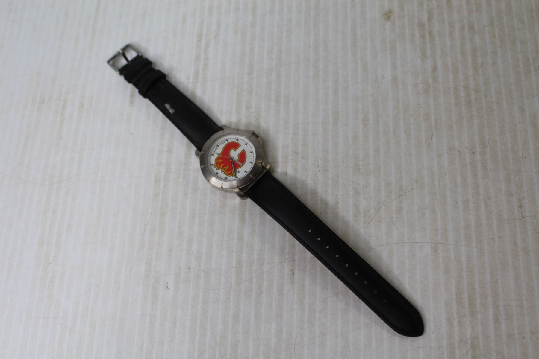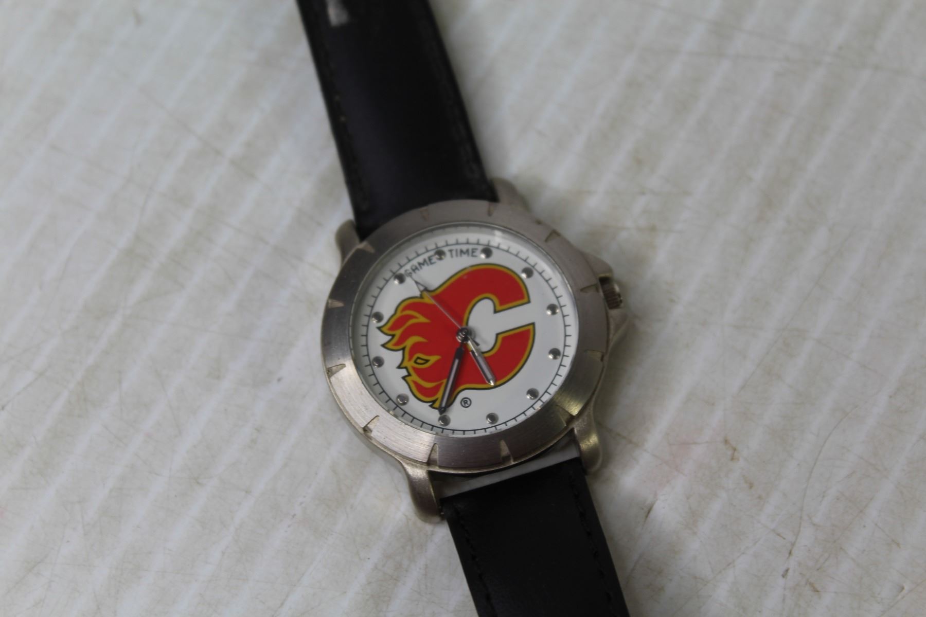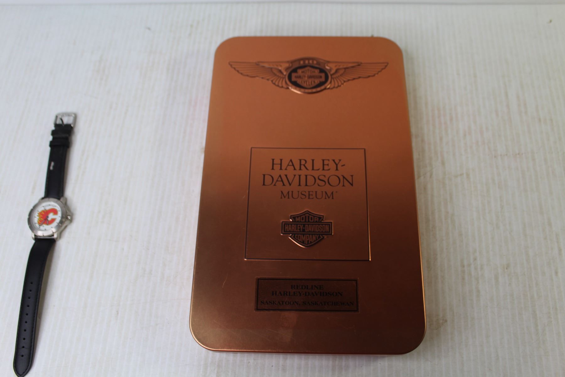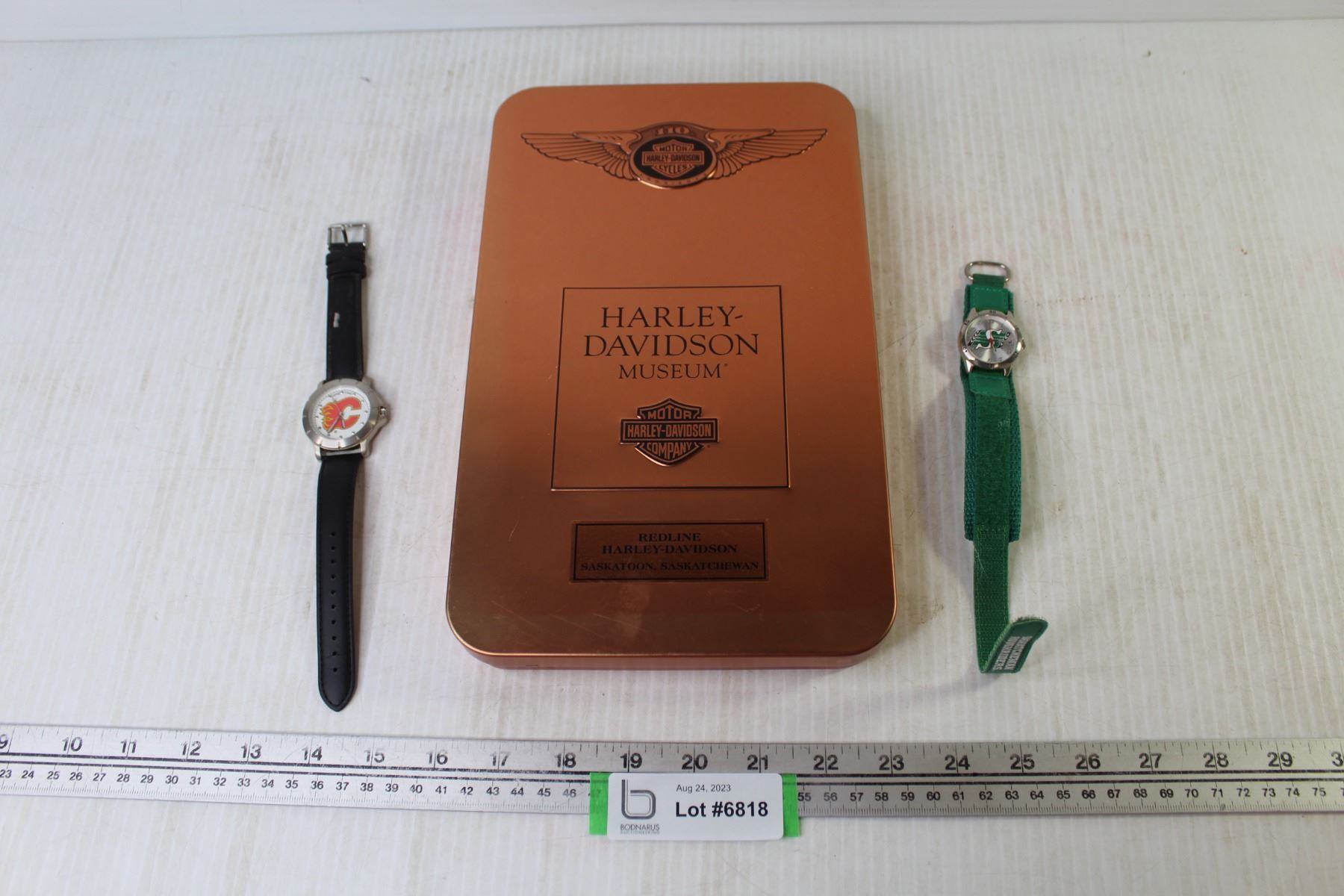 Metal Harley Case (empty) - Saskatchewan Riders Watch (not running) - Calgary Flames Watch (not running)