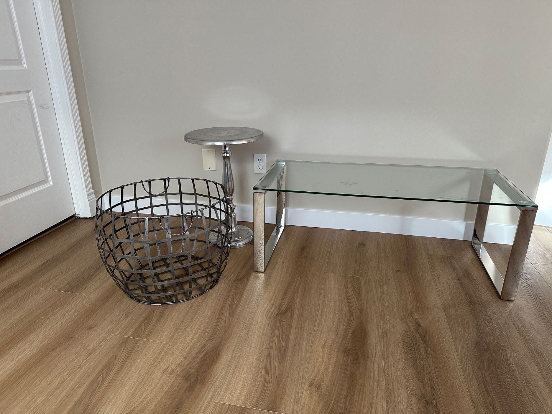 Includes coffee table 41.5" wide x 19.5" deep x 16" tall - Metal End Table/Plant Stand 22.5" tall - Metal Wire blanket basket 15.5" tall x 19.5" diameter