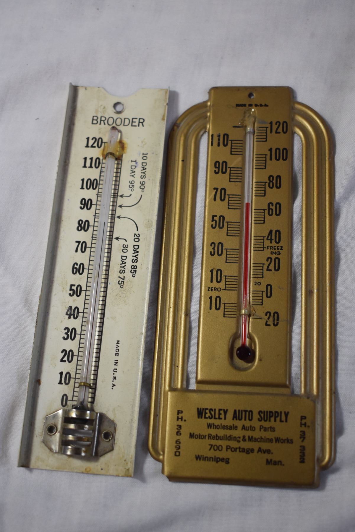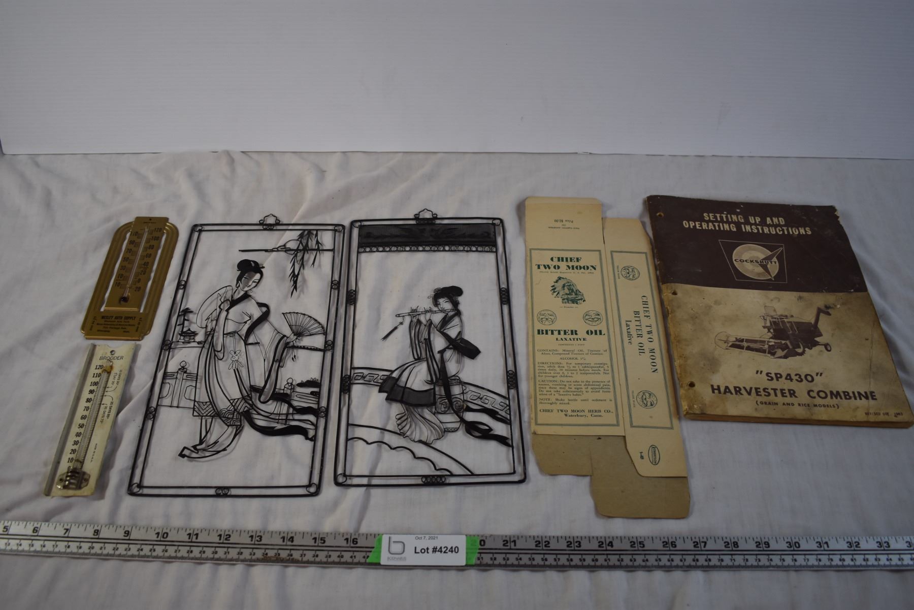 Metal Japanese Art Pieces, Cockshutt Combine Manual, Thermometers, and Misc