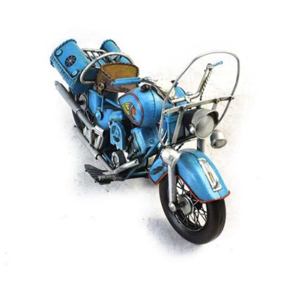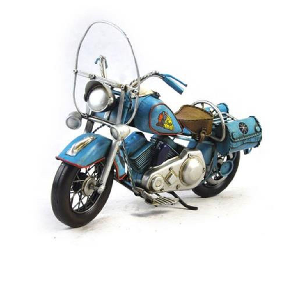 Beautifully handmade and so each piece is a unique collectible and show piece for your home. Decoration parts comes with stickers to match your scene, Plastic die cast metal, Ultra precision design with some moving parts where applicable, Decoration parts decals accurately reproduced. Decorate for any table, desk, or shelf in sporty fashion with Our Rustic Iron Indian Bike Bike Sculpture. Featuring a rustic iron frame, this charming vintage Motorcycle includes detailed craftsmanship. The silver and Blue metal seat and handlebars are finished in natural colors. Size: 7X12X7 Inches. Weight: 10 LBS.