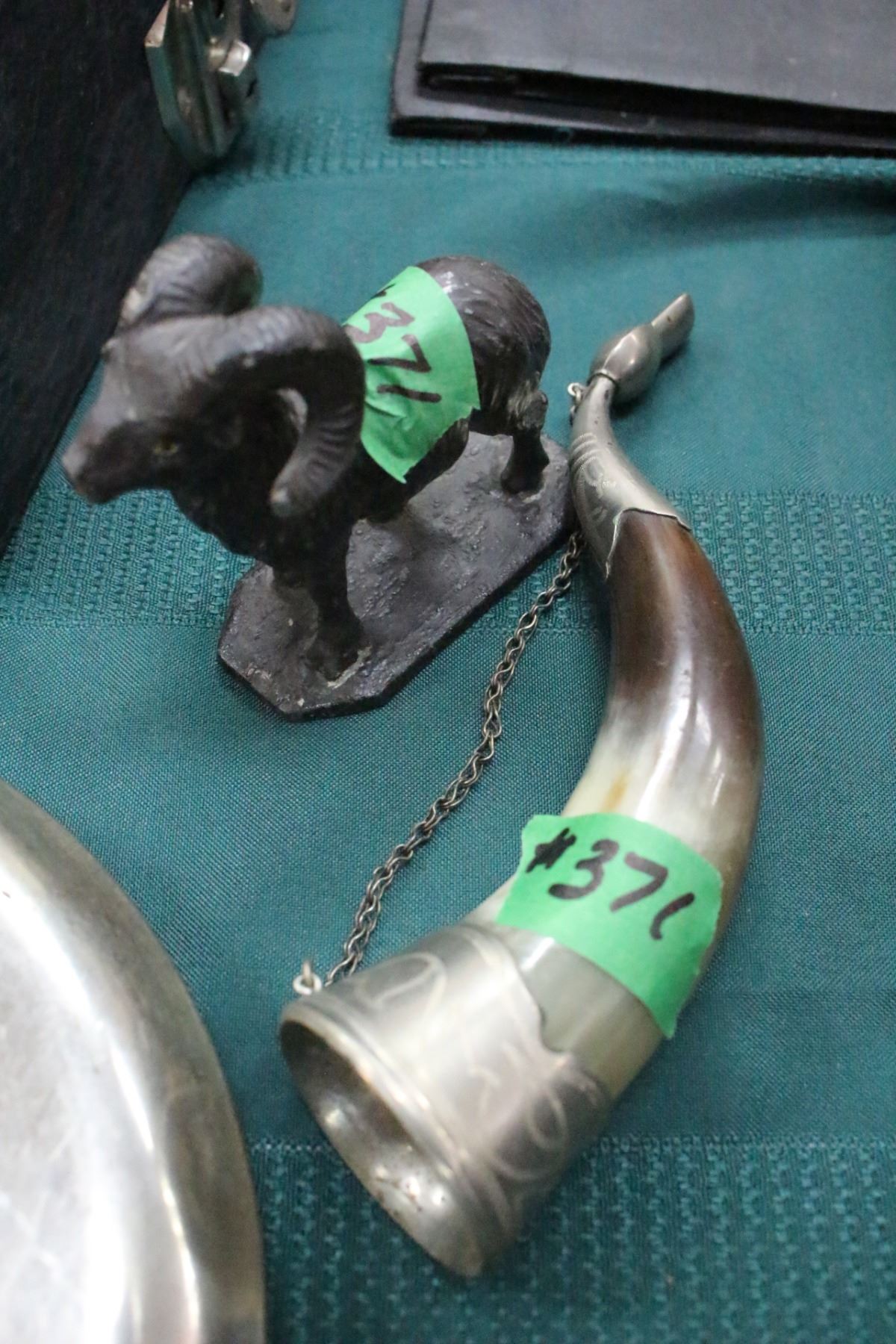 Metal Mountain Sheep Ornament & an Ornate Silver Trimmed Horn