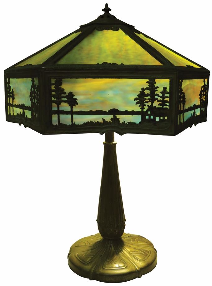 Metal Overlay Slag Glass Table Lamp. Bronze colored overlay, hexagon shade with cabin and lake motif. Green multi and blue multi slag glass panels. 23 inches tall, shade 15 3/4 inches wide.