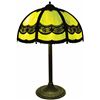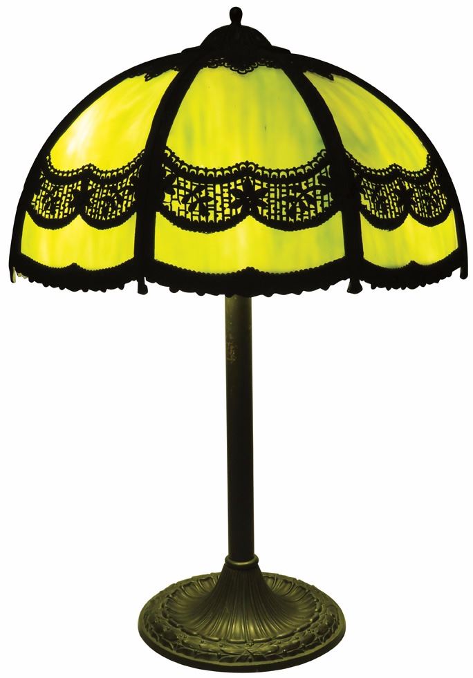 Metal Overlay Slag Glass Table Lamp. Dark bronze colored overlay, drape and lace motif. Green and white slag glass. 23 inches tall, shade 15 1/2 inch diameter.
