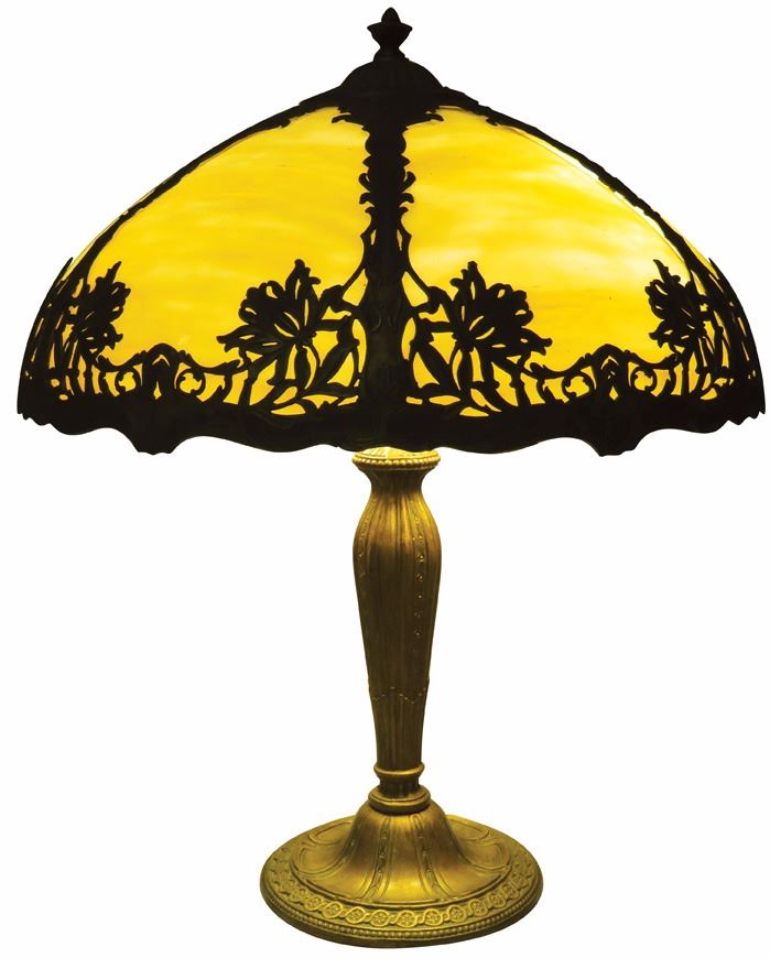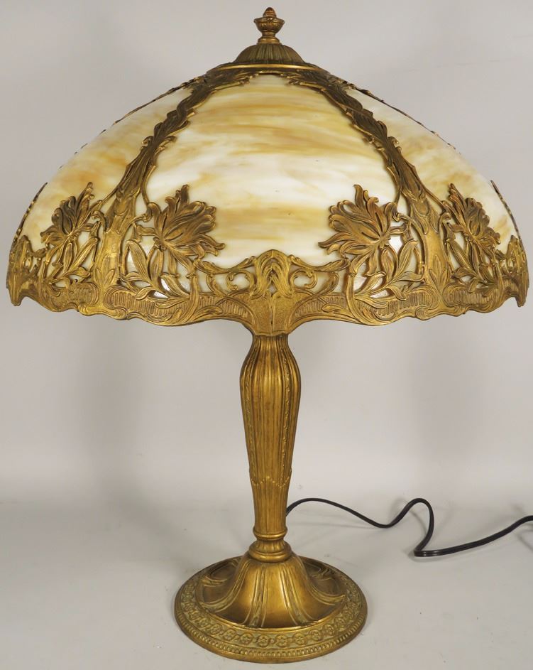 Metal Overlay Slag Glass Table Lamp. Brass colored overlay with light amber and white slag glass. 22 inches tall, shade 18 1/2 inch diameter.