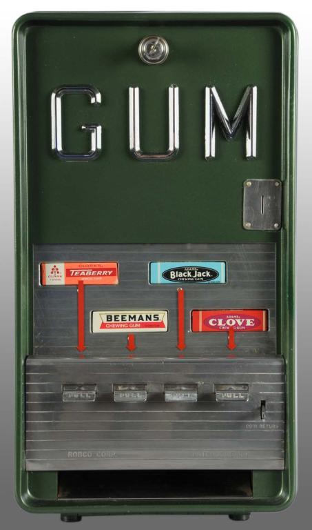 Unused, mint metal cabinet machine with four display packs for Teaberry, Blackjack, Clove and Beeman’s gum. Price per pack was ten cents. Key is included. Gum Ball Machine Condition (9.5, Near Mint). Size 20 - 1/2" x 11".