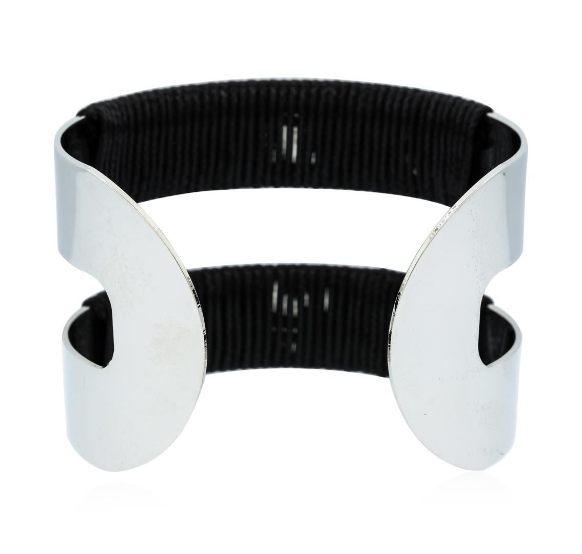High end designer jewelry. Metal Strand Leather Cuff Bracelet - Rhodium Plated. Rhodium Plated Metal. Black/ Silver. Adjustable.