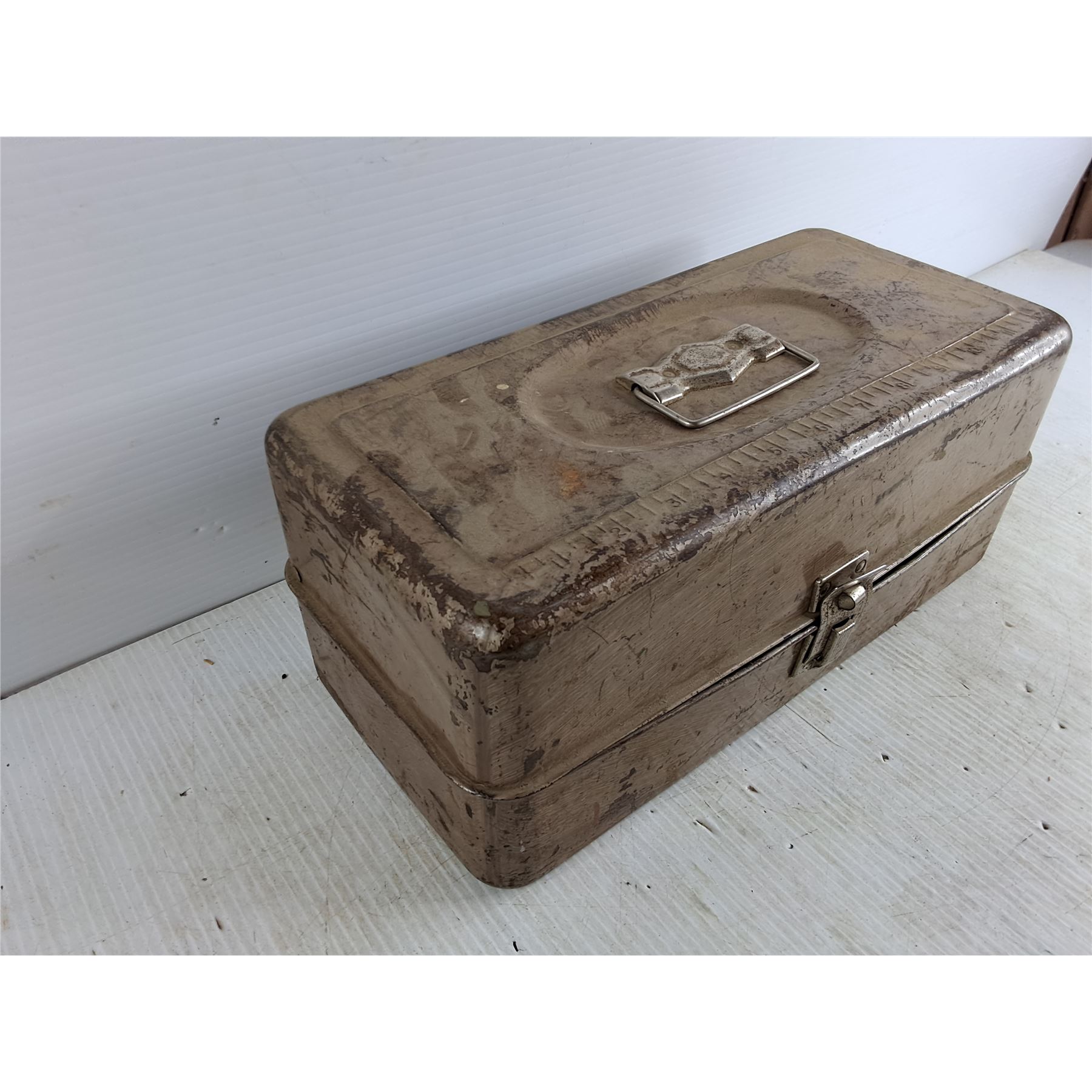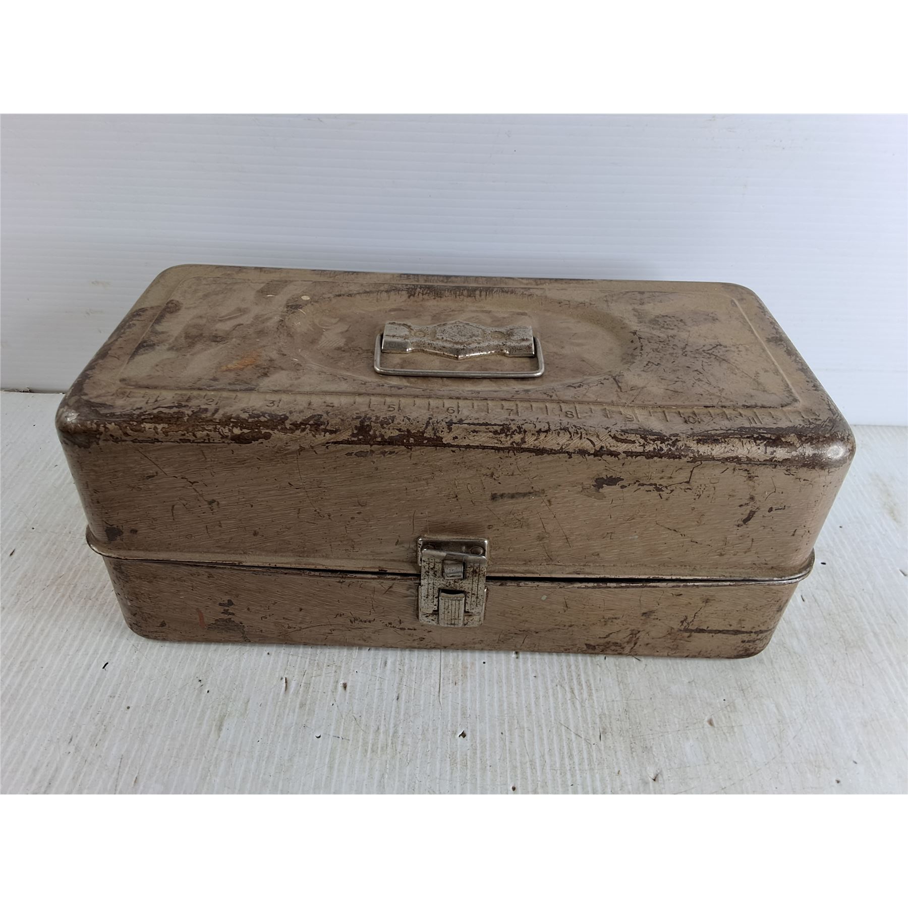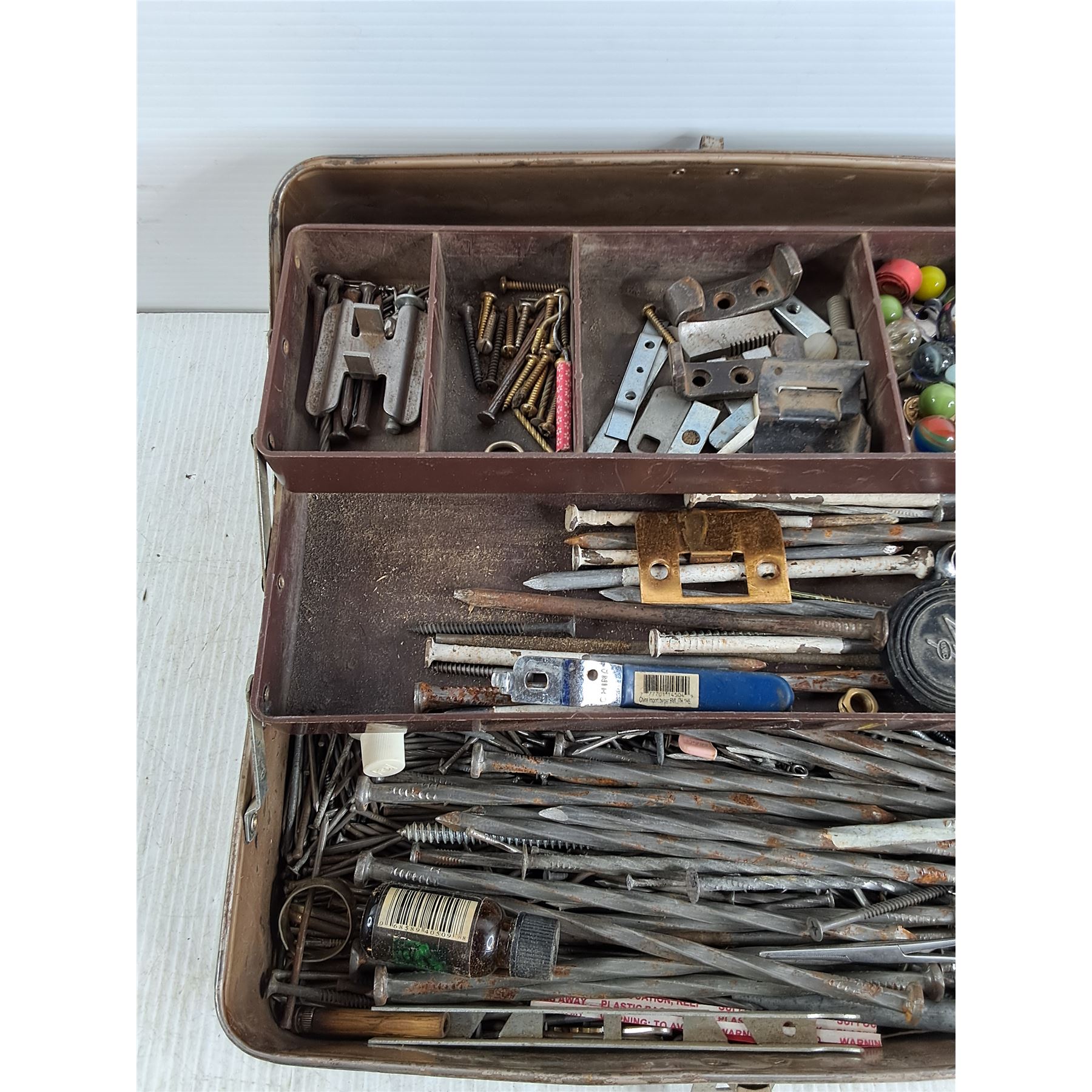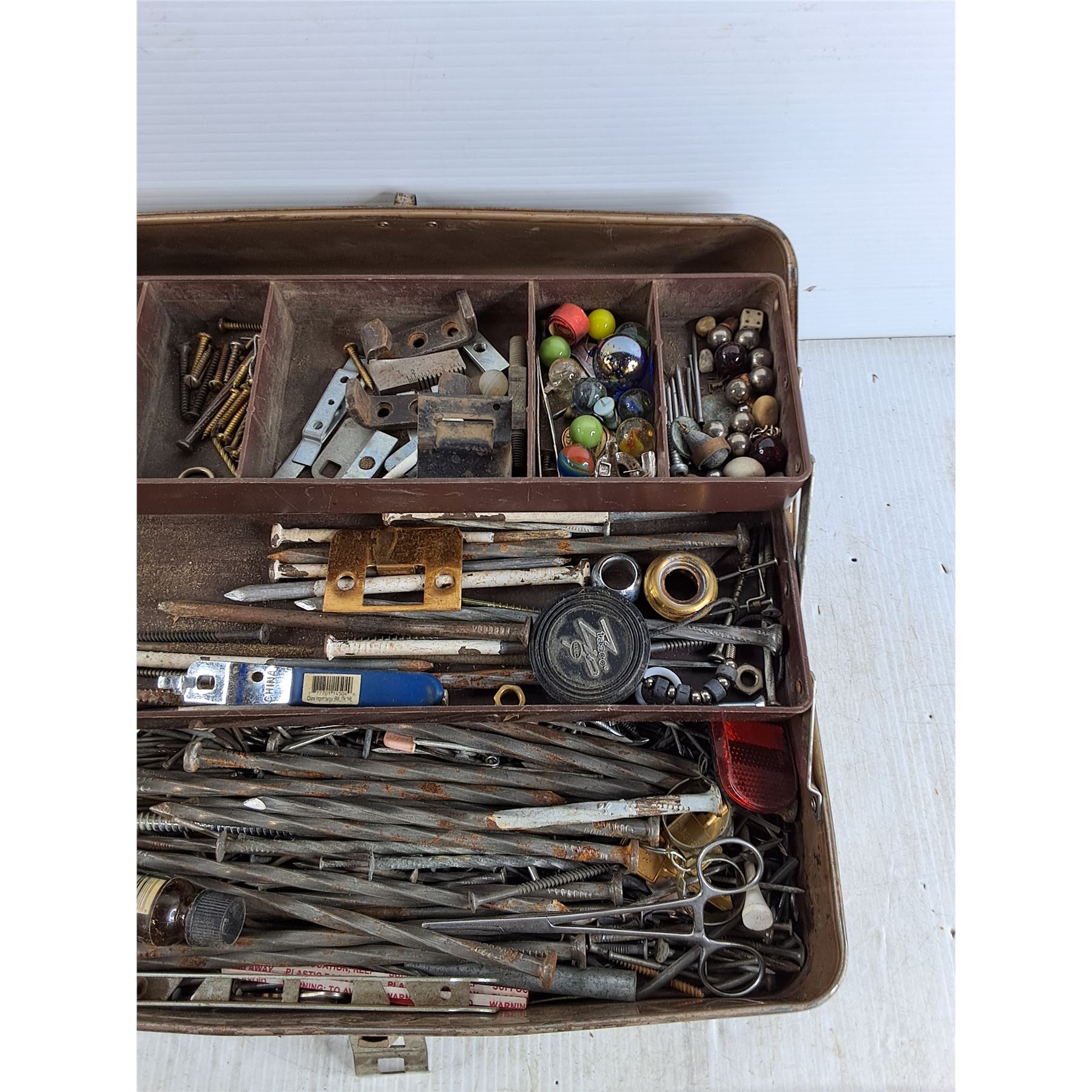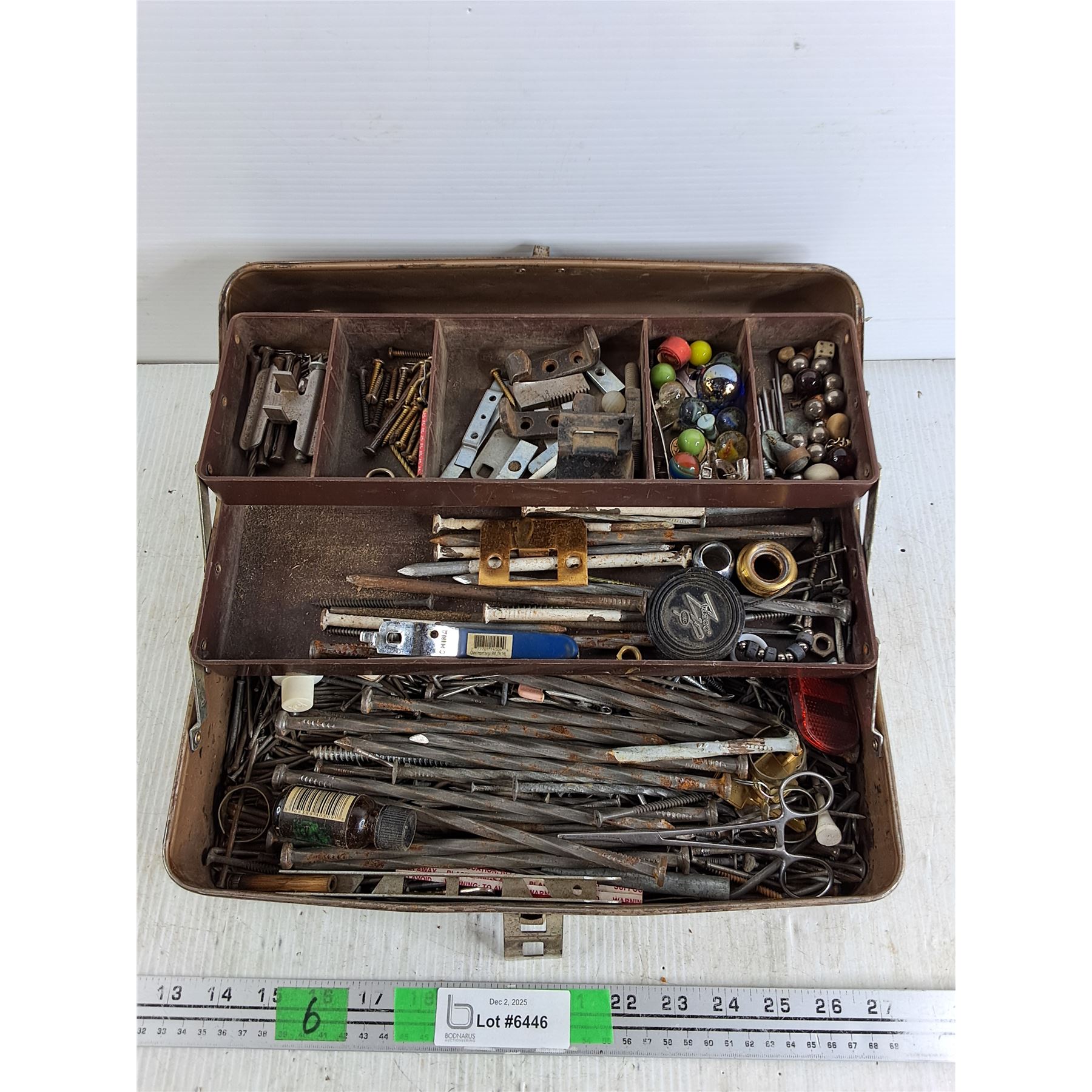 Metal Tackle Box, Various Nails, Marbles, Medical Tongs, Misc Hardware