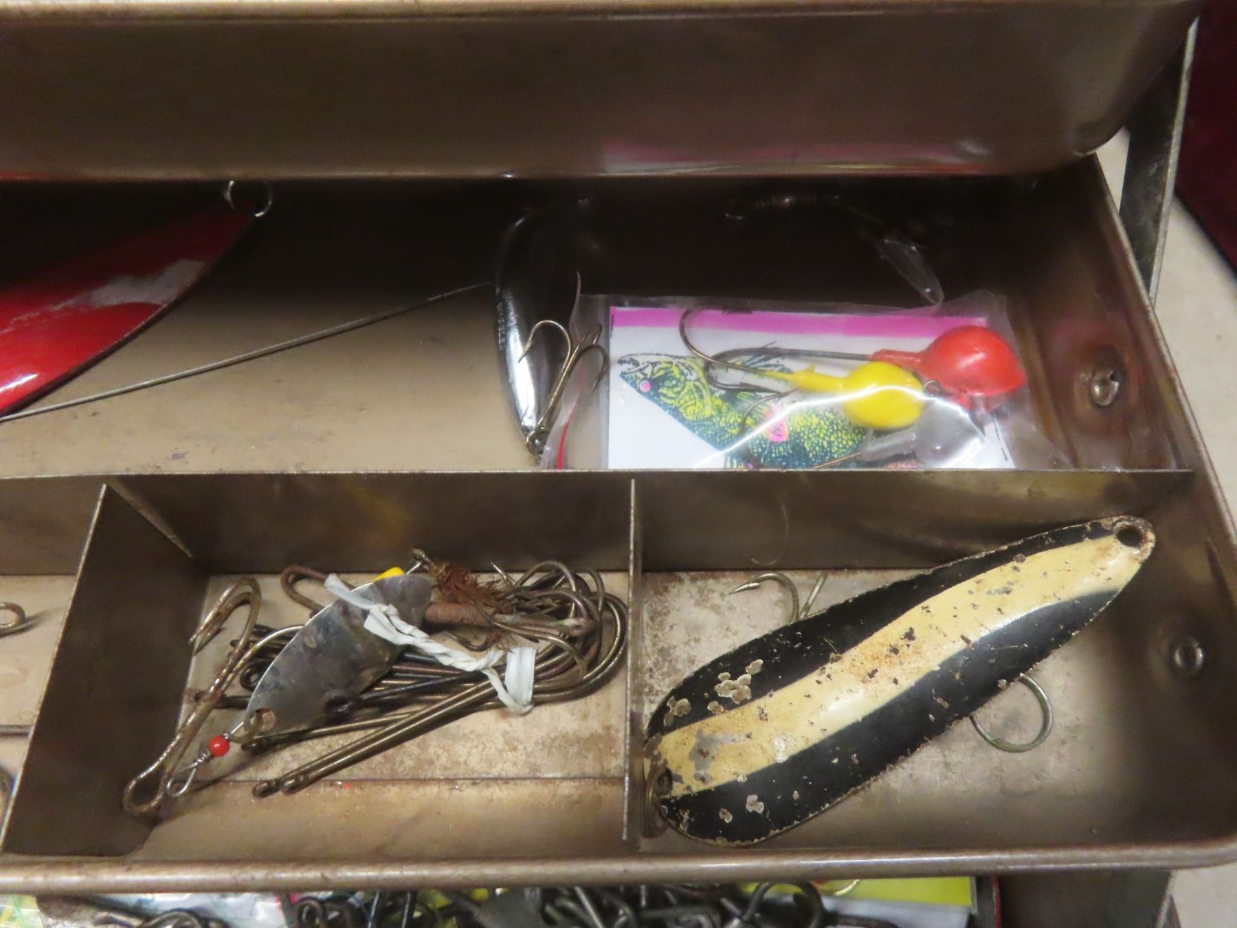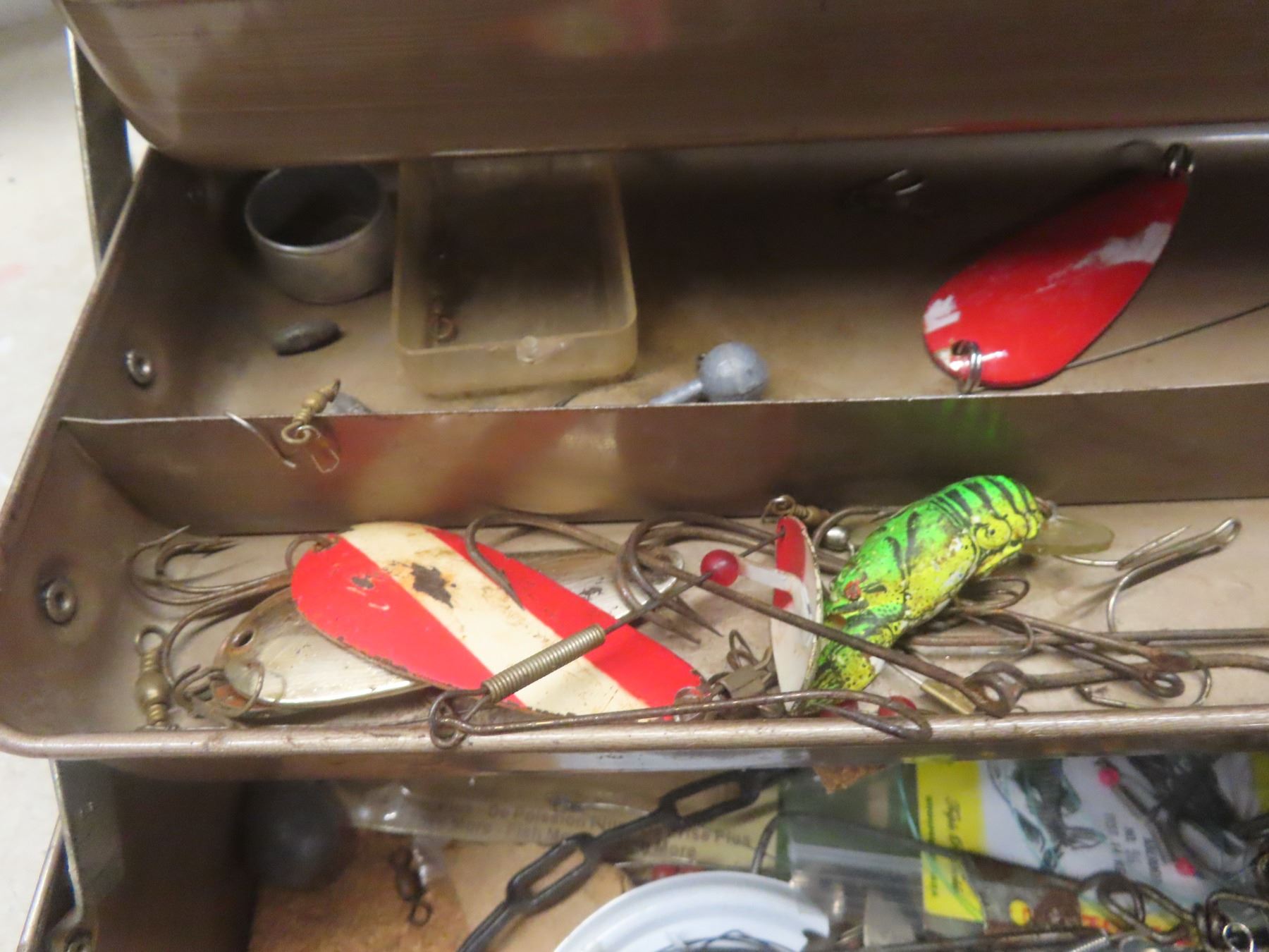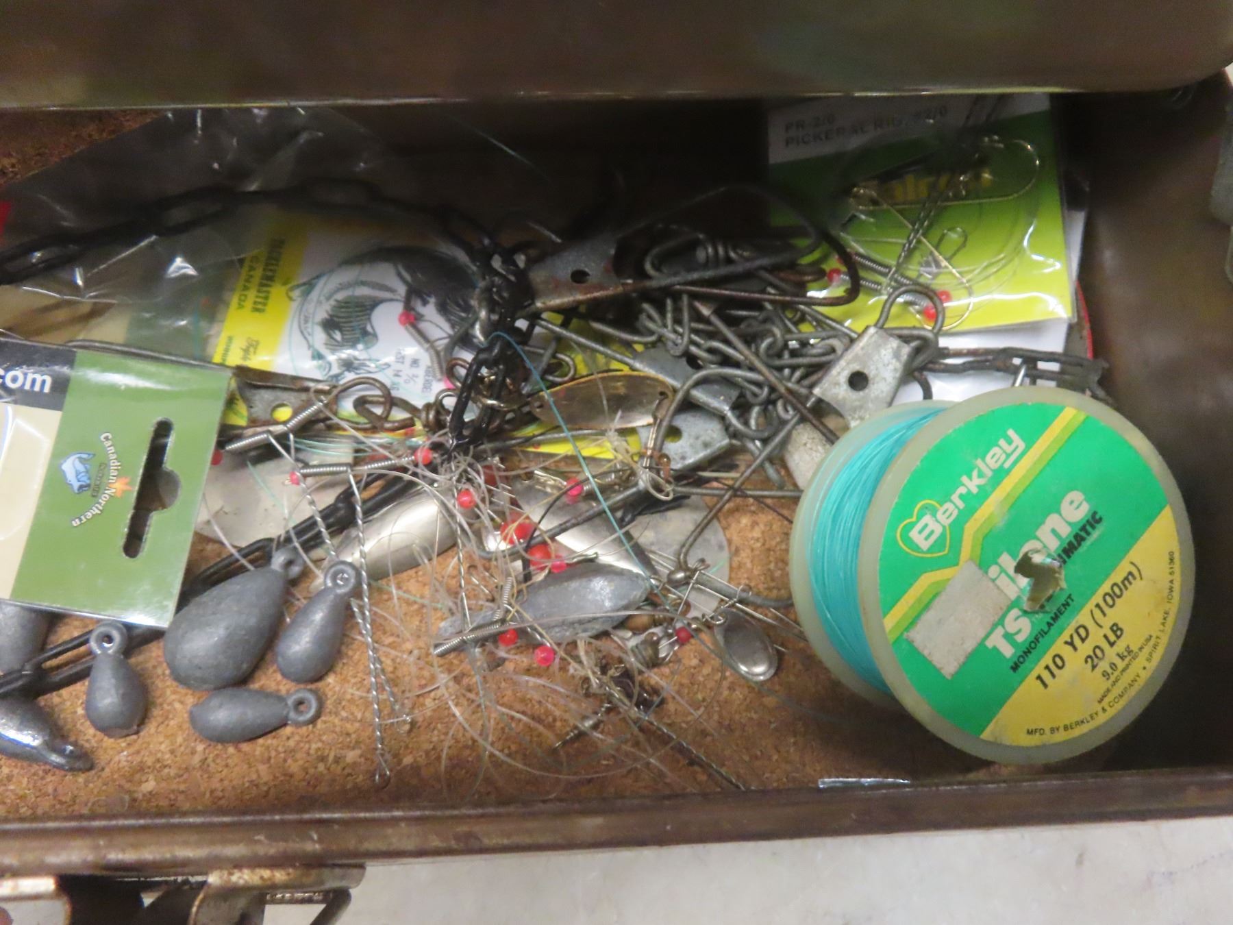Metal Tackle Box with Assorted Fishing Tackle—Lures, Weights, Line, Hooks, and More.