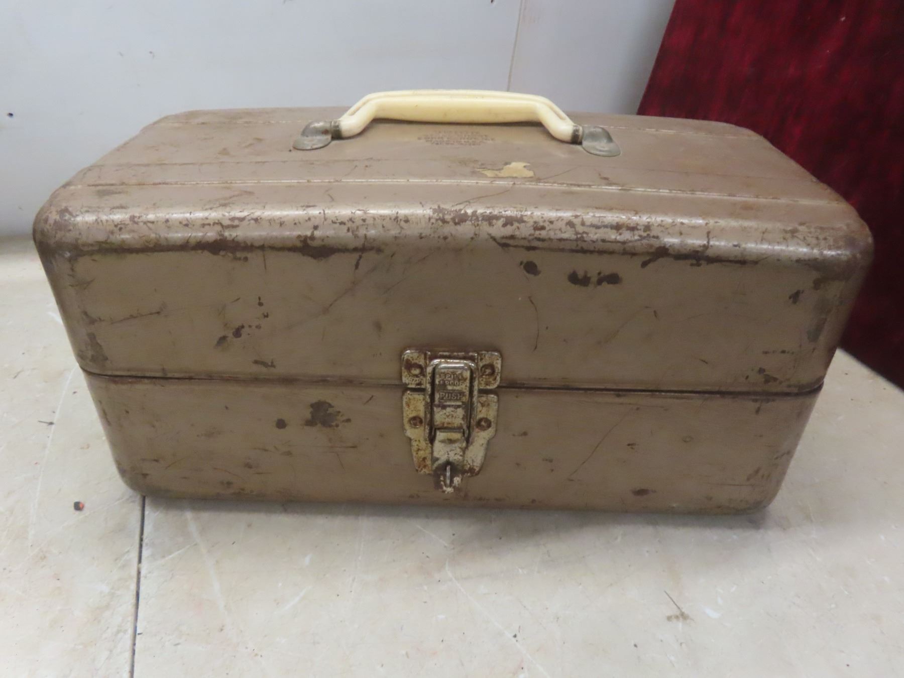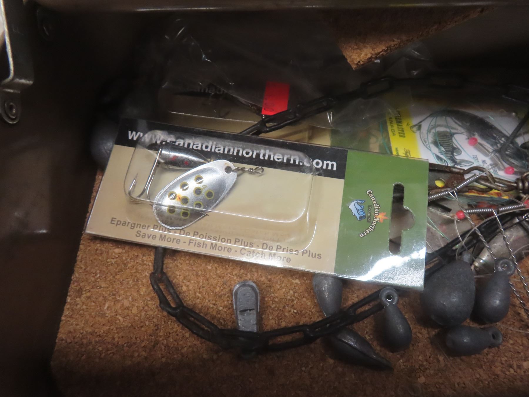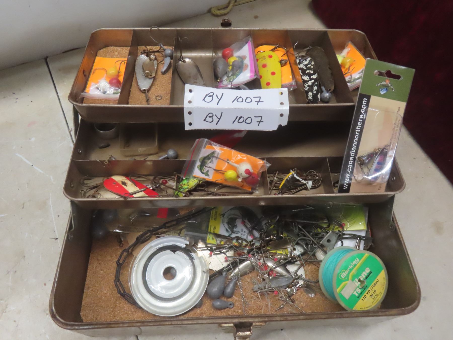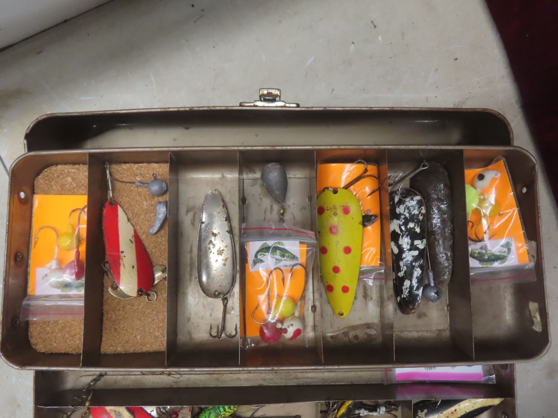 Metal Tackle Box with Assorted Fishing Tackle—Lures, Weights, Line, Hooks, and More.