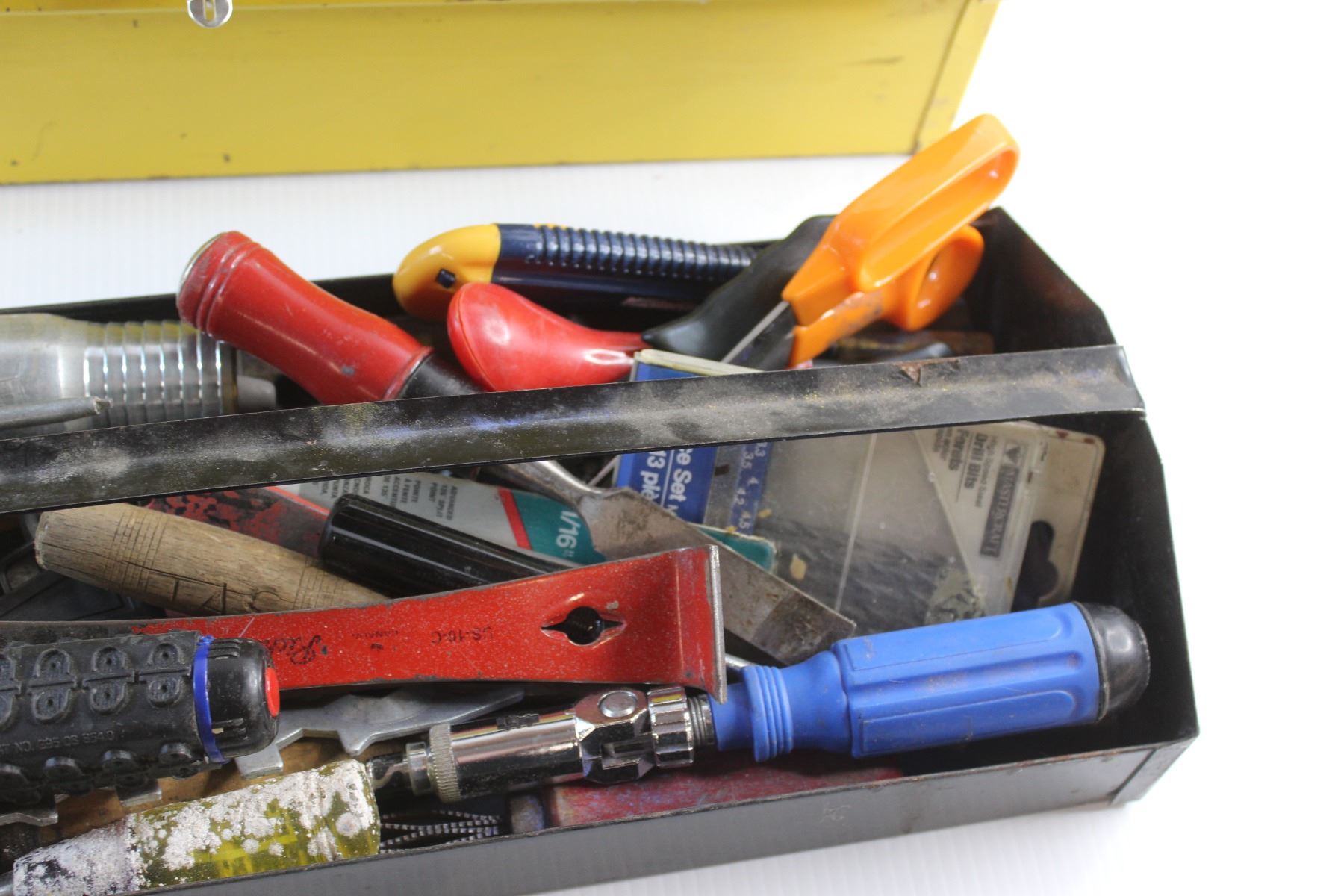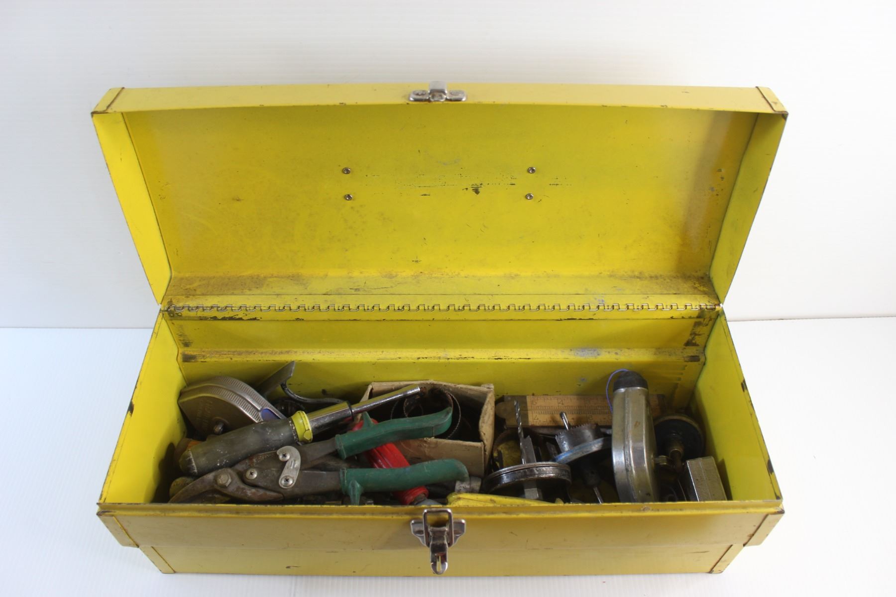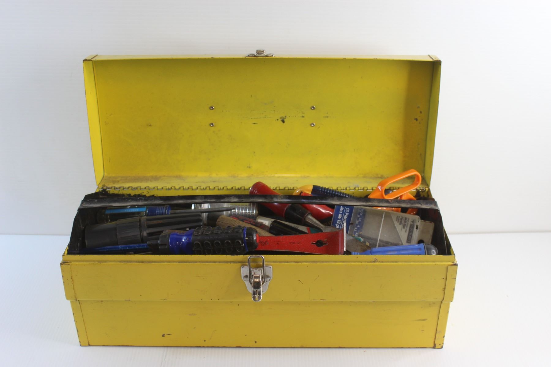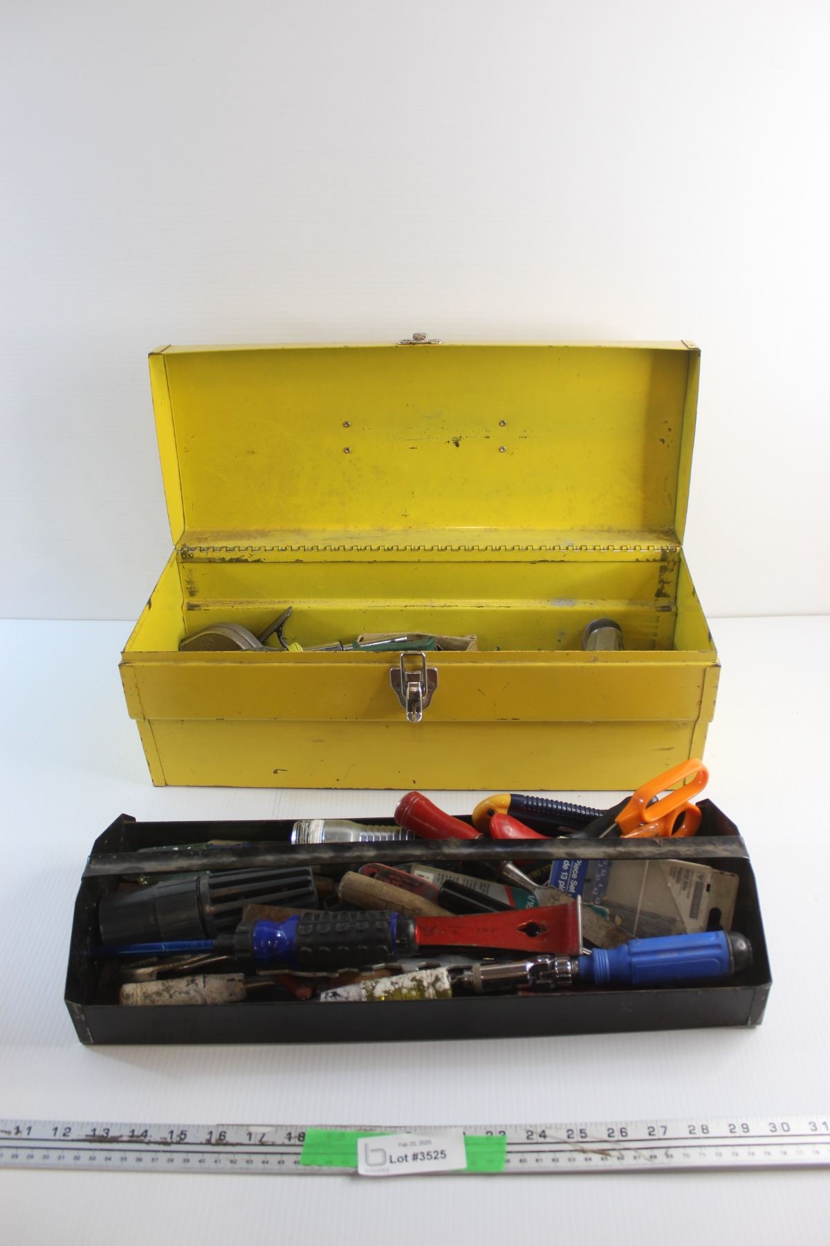 Metal Tool Box 19'' x 7 1/2'' x 7 1/2'' , Screwdrivers, Box Cutters, Chalkline, Wire Strippers and M