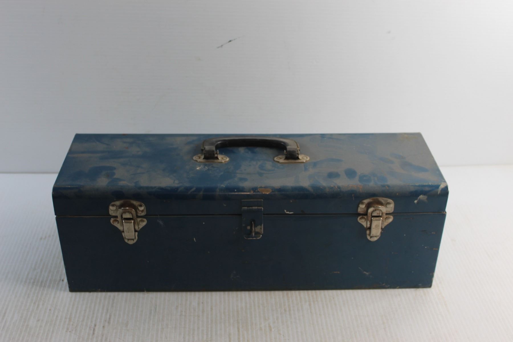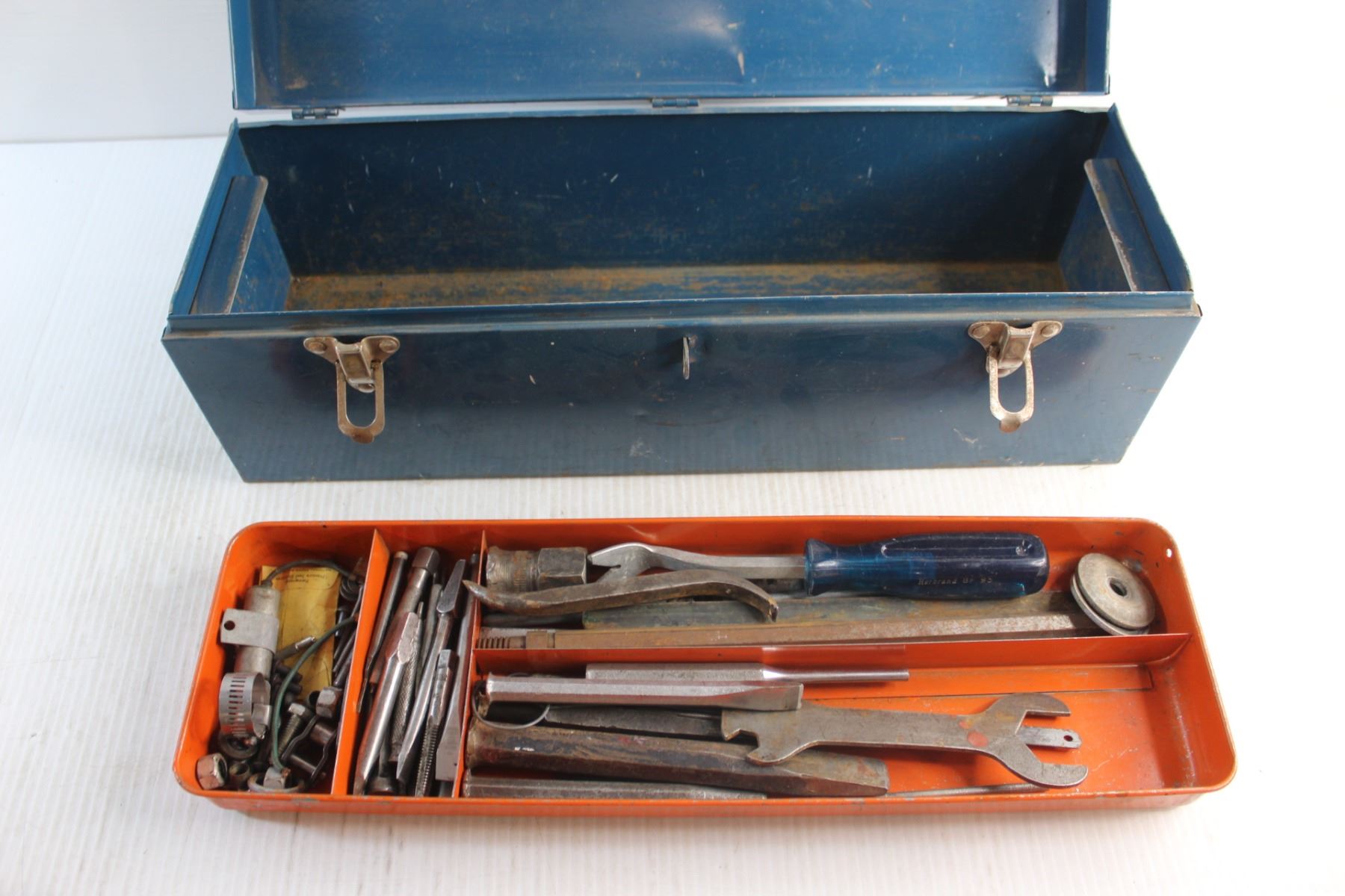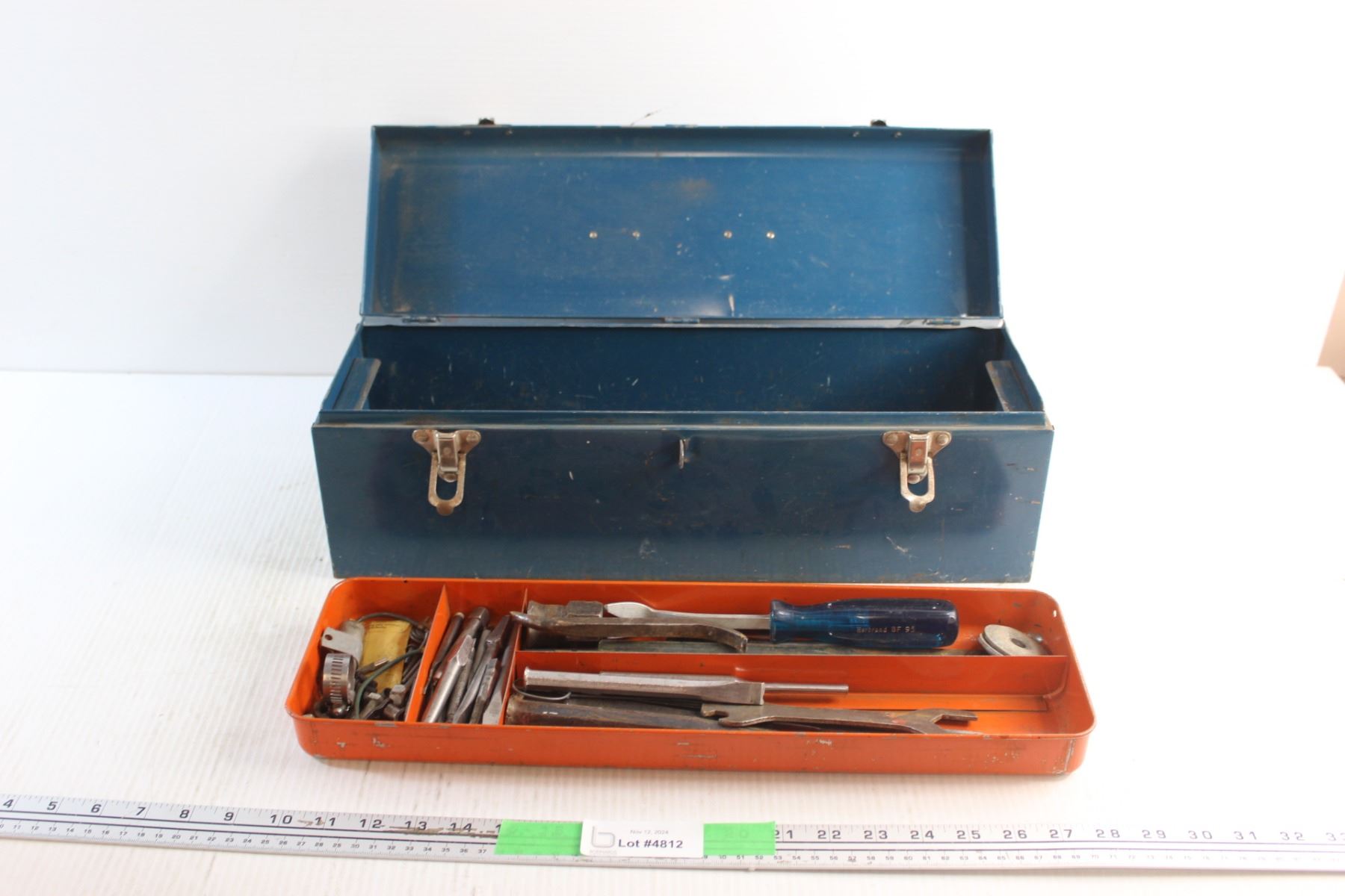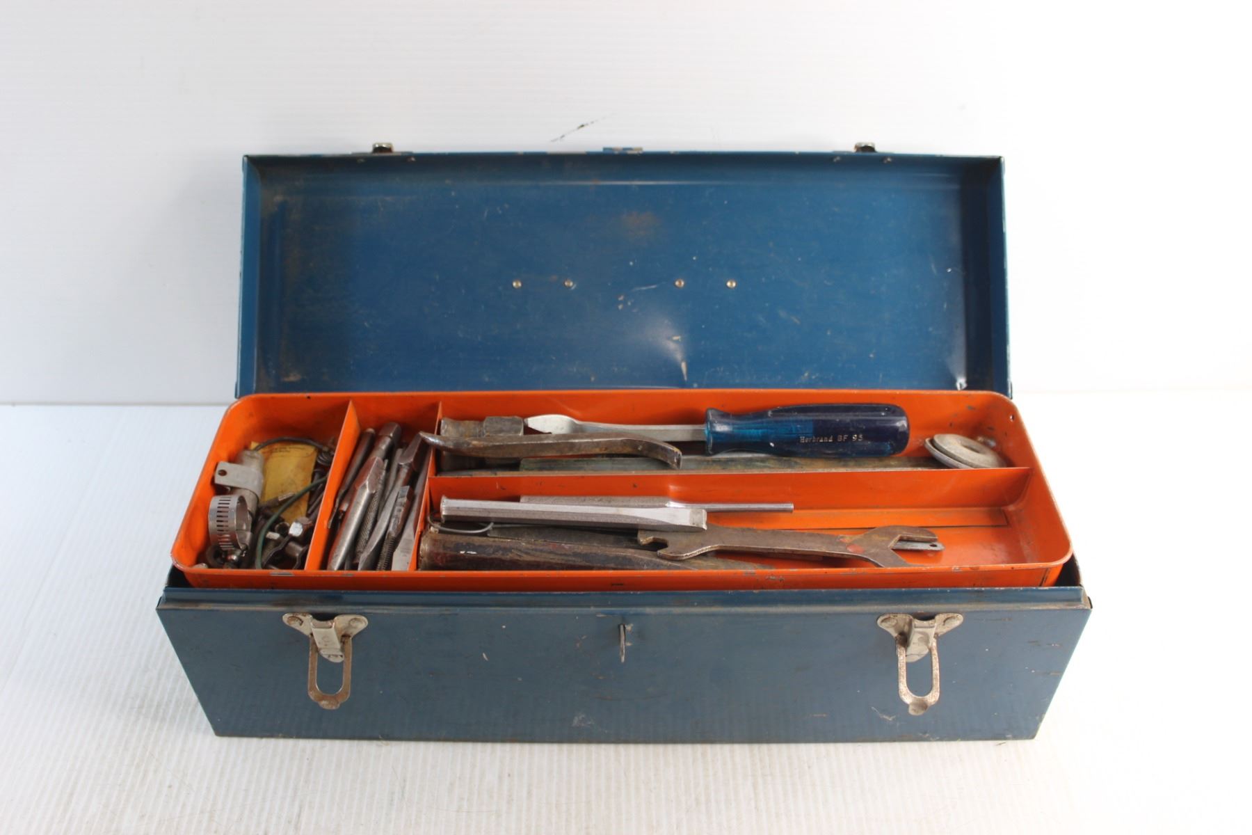 Metal Tool Box and Assorted Tools - Nail Pullers, Chisels and Wrenches