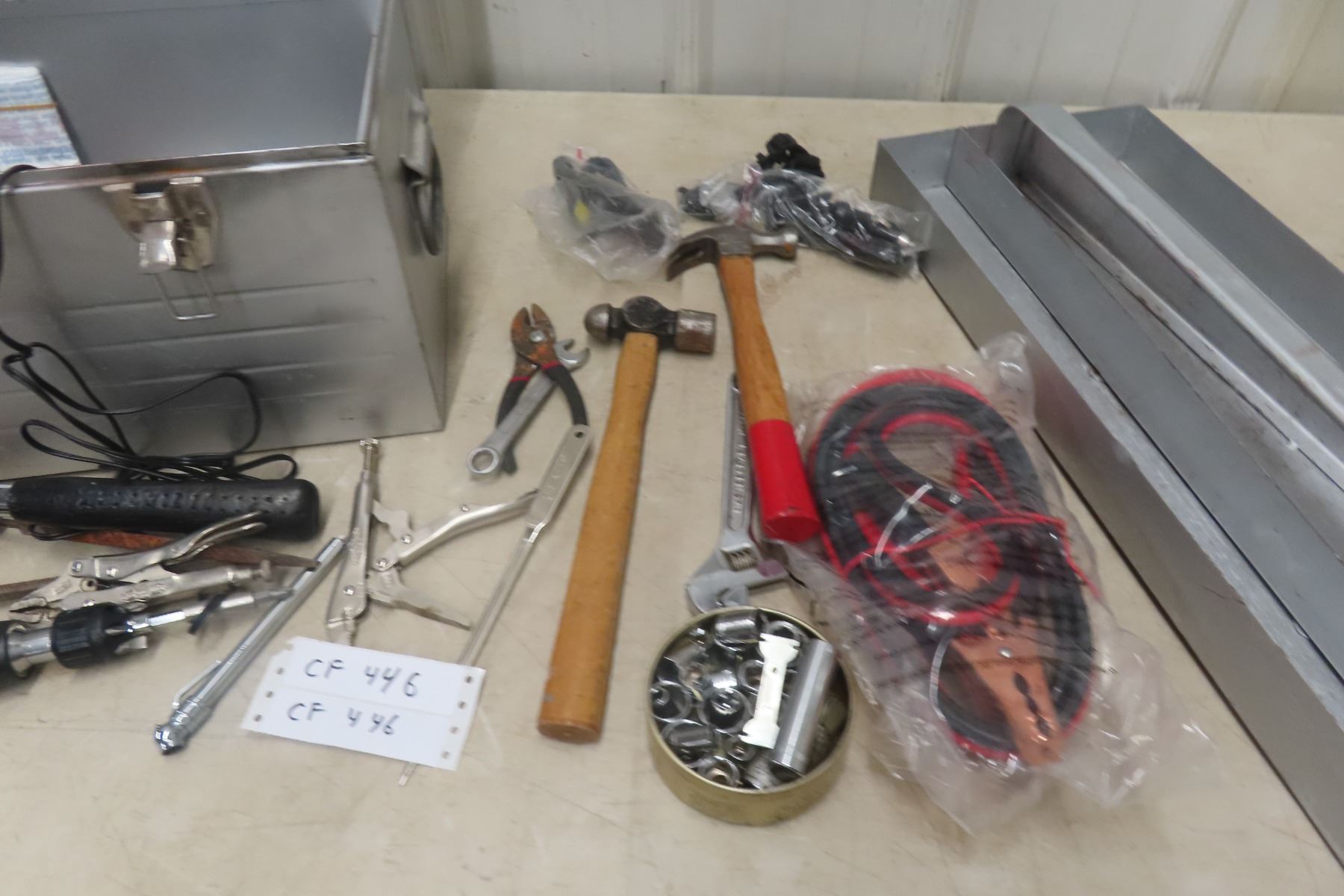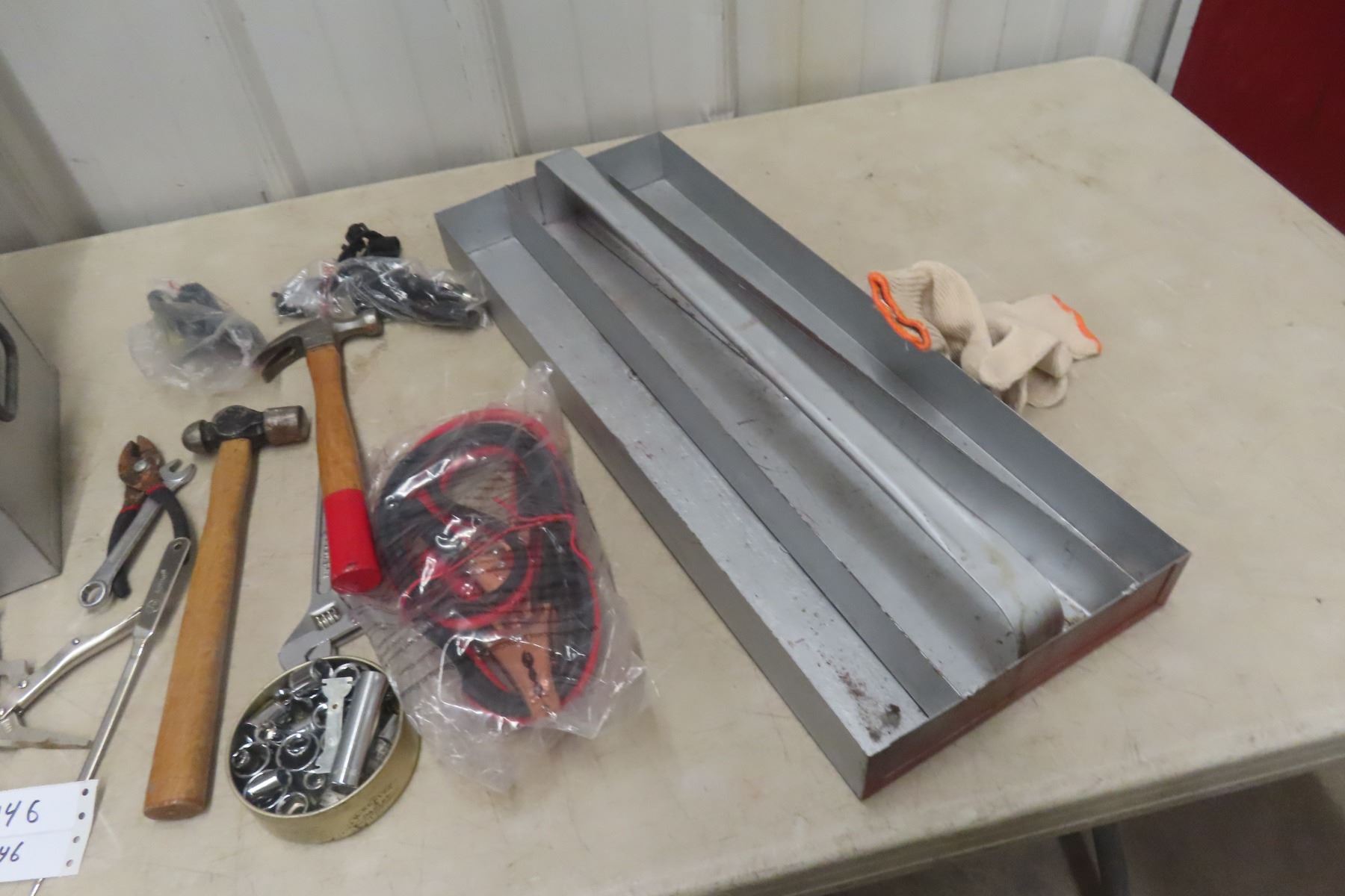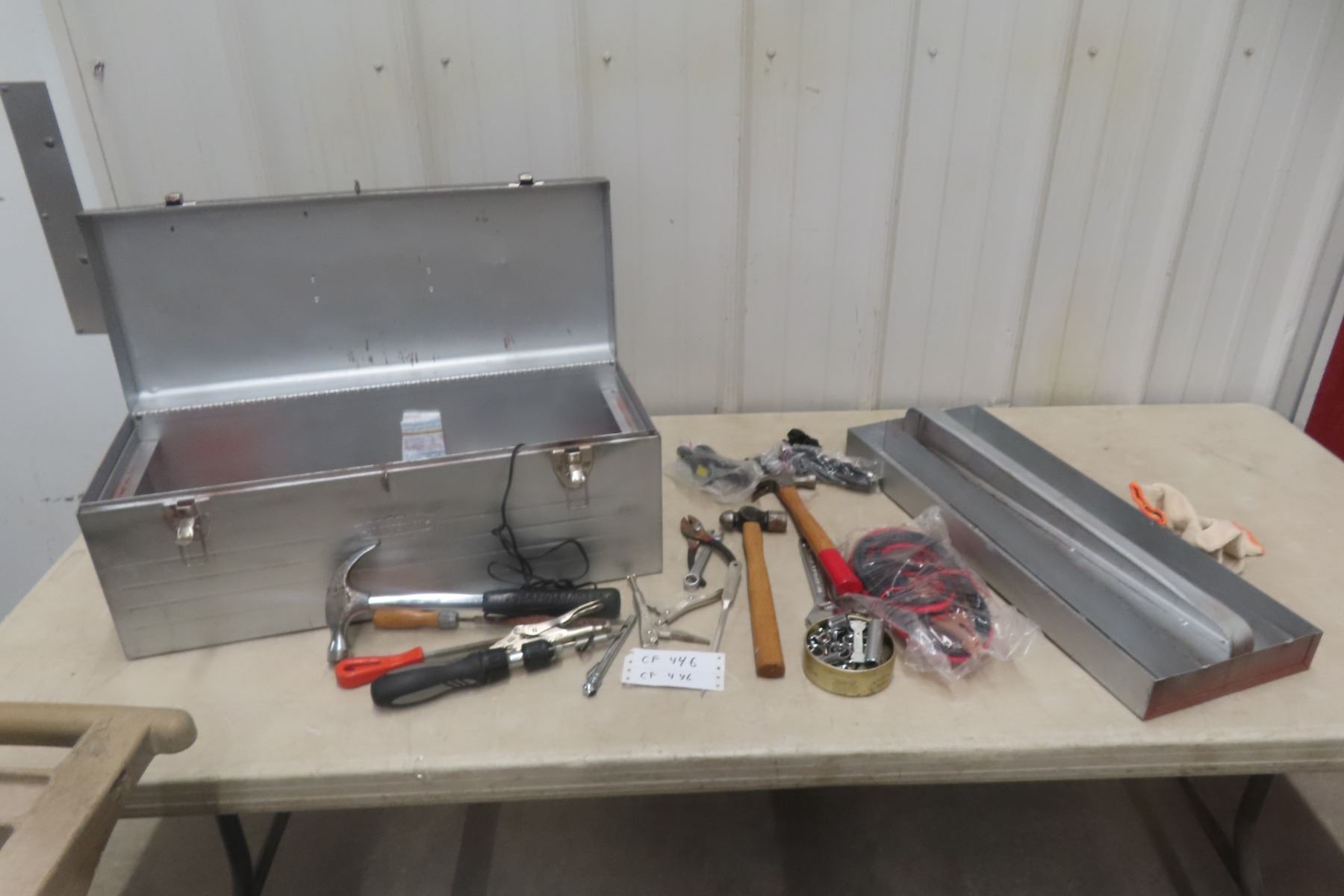 Metal Tool Box with Hammers, Booster Cable, and Assorted Tools