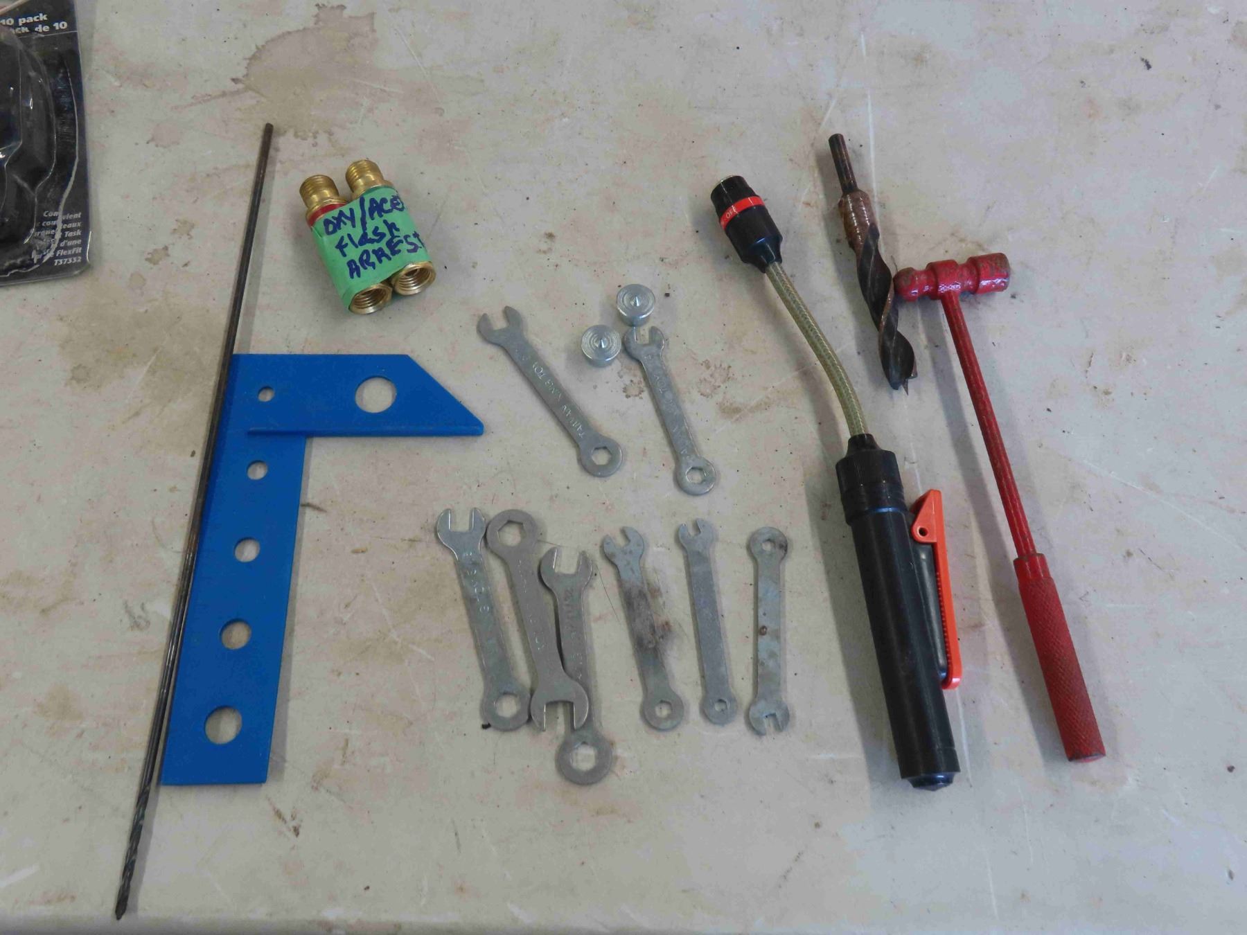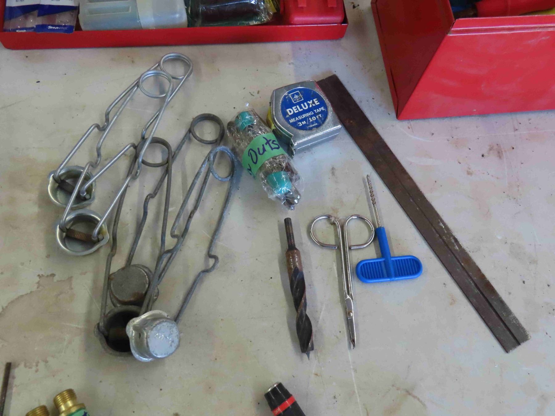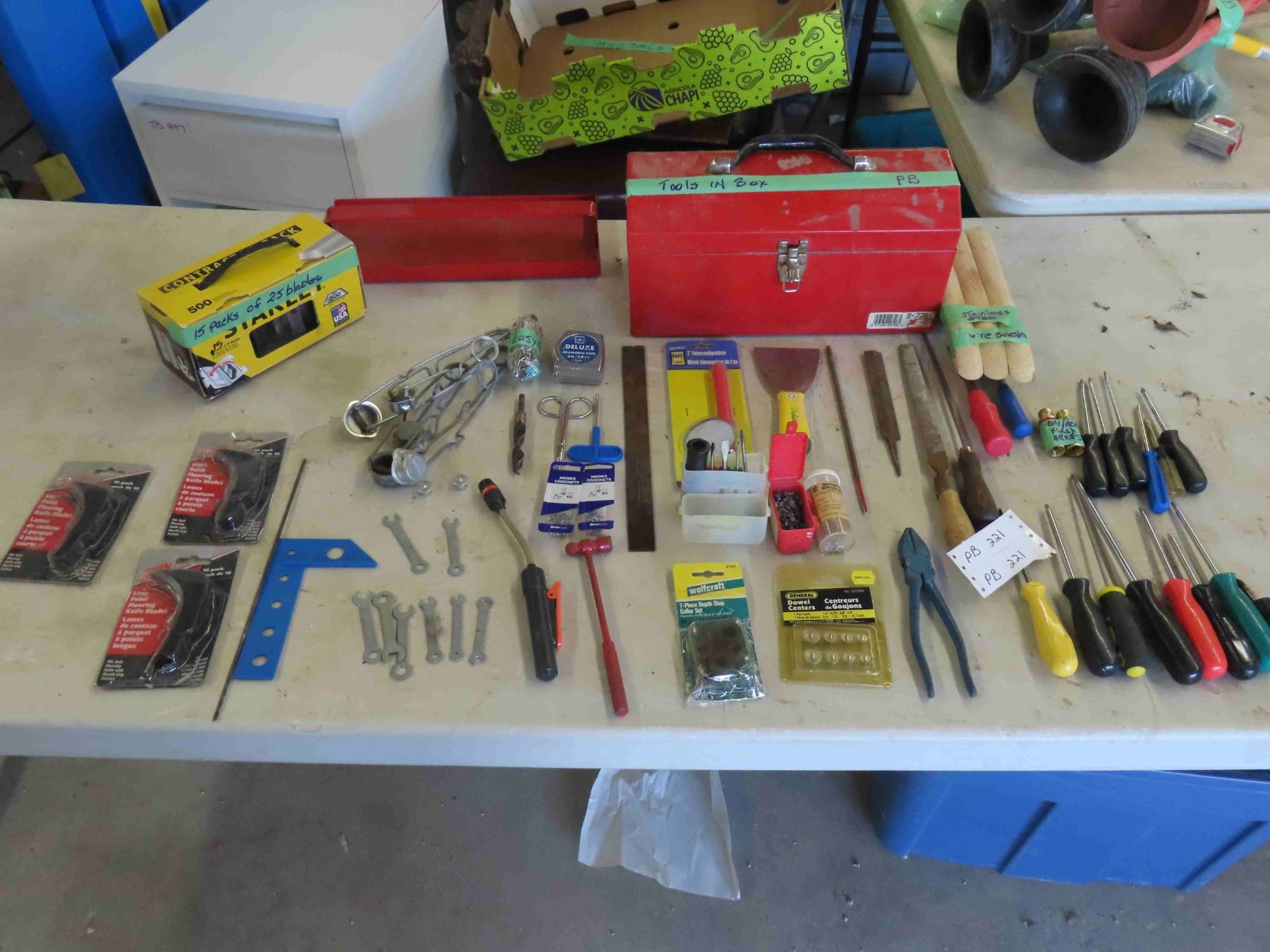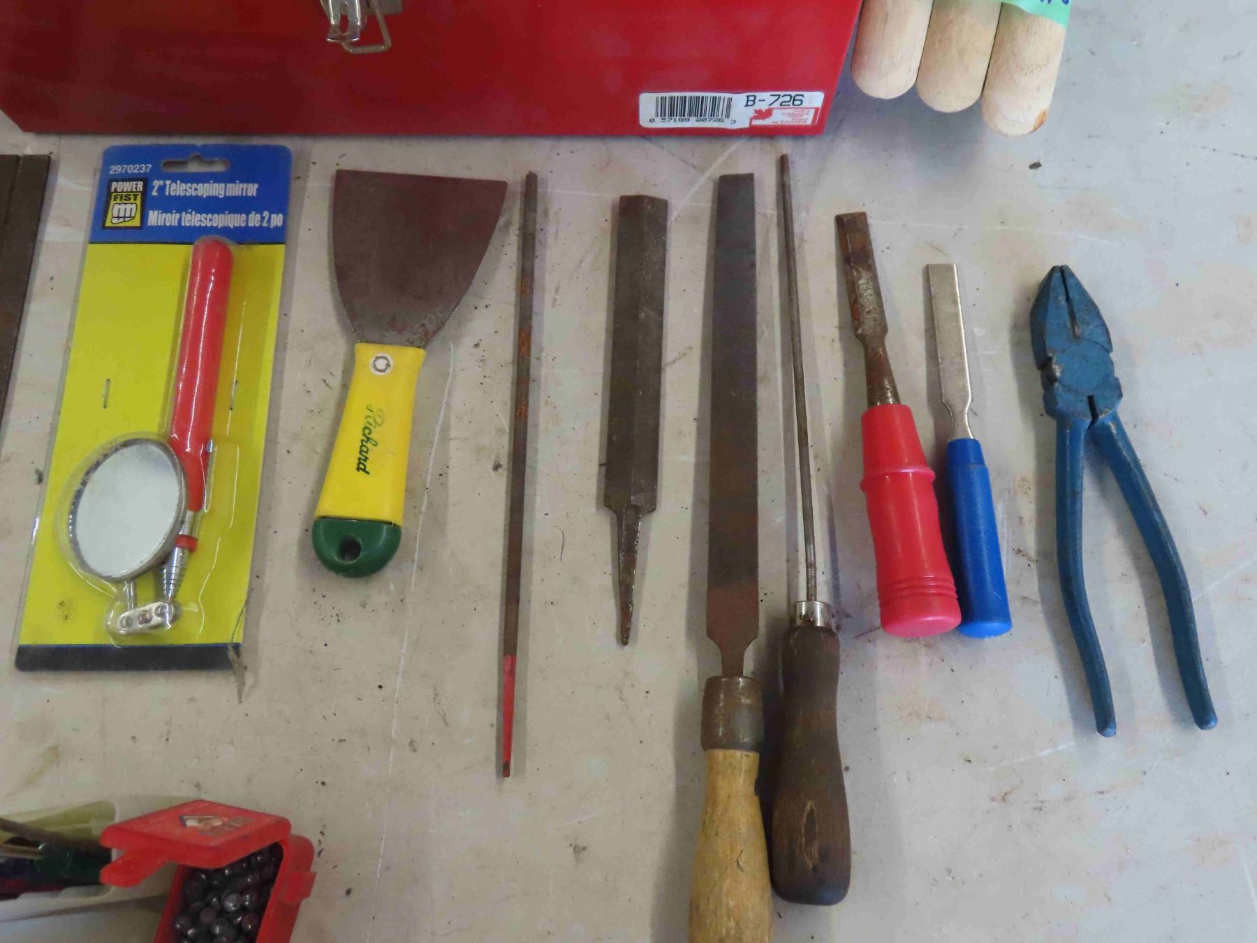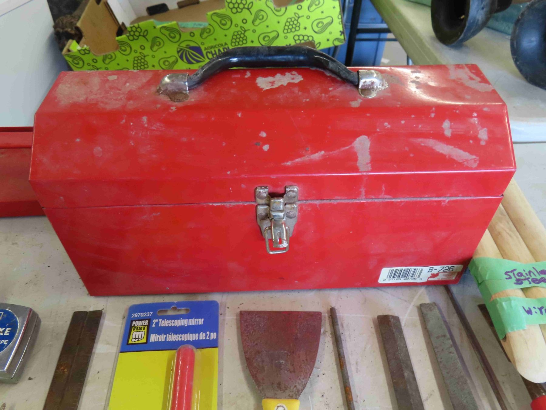 Metal Tool Box with Screwdrivers, Files, Tape Measure, New Blades, Wire Brushes &