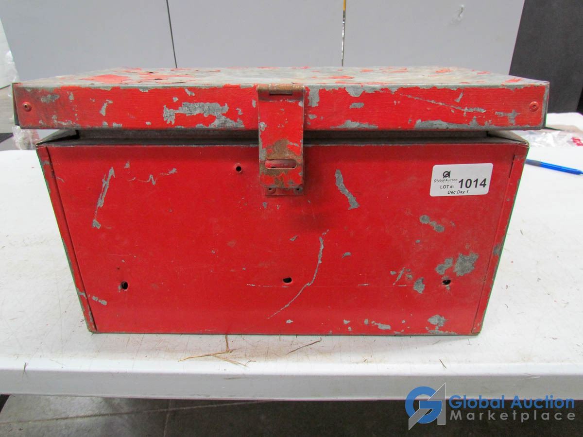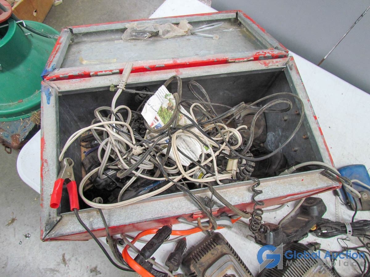 Metal Toolbox w/ Assorted Cords, Battery Charges, & Related