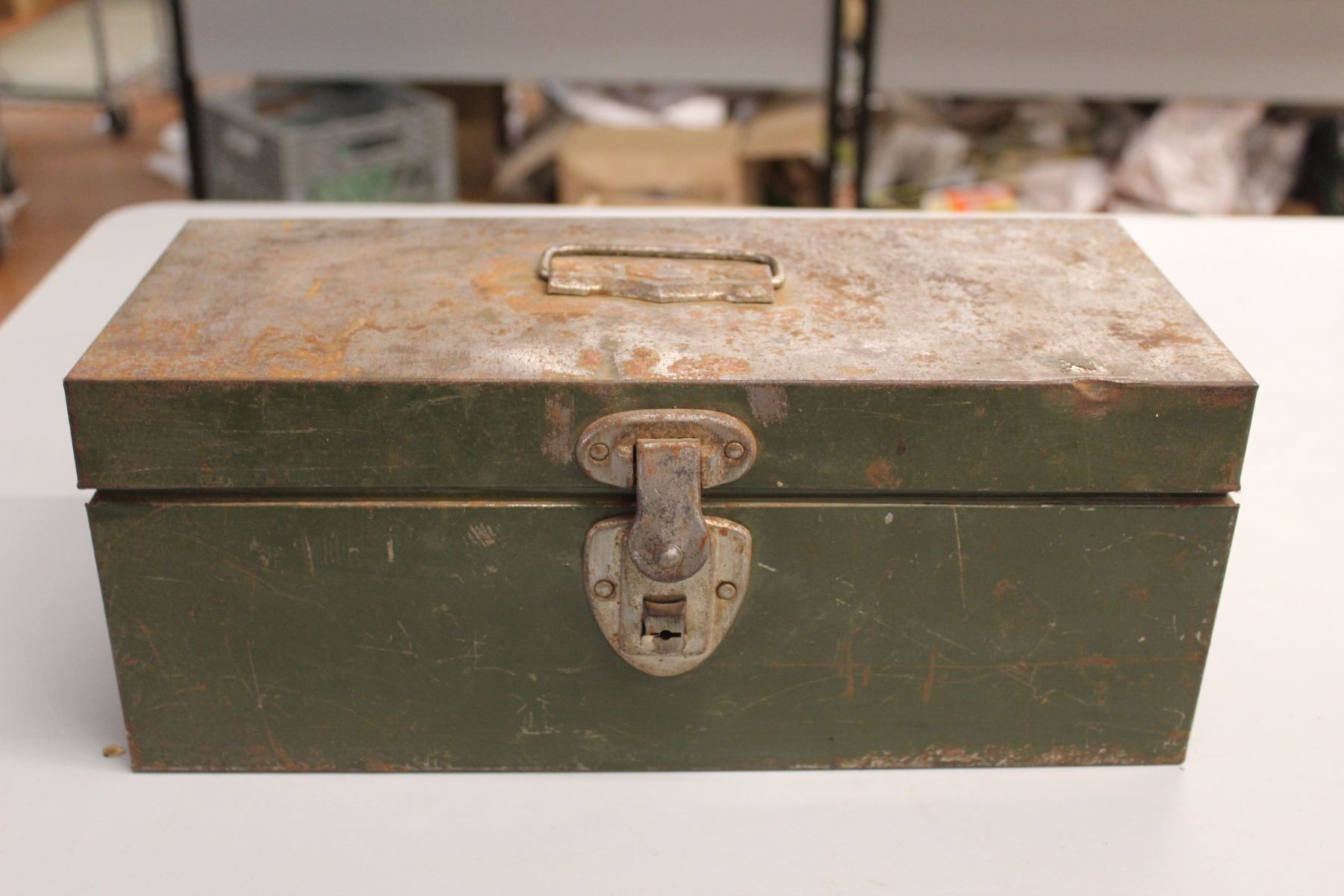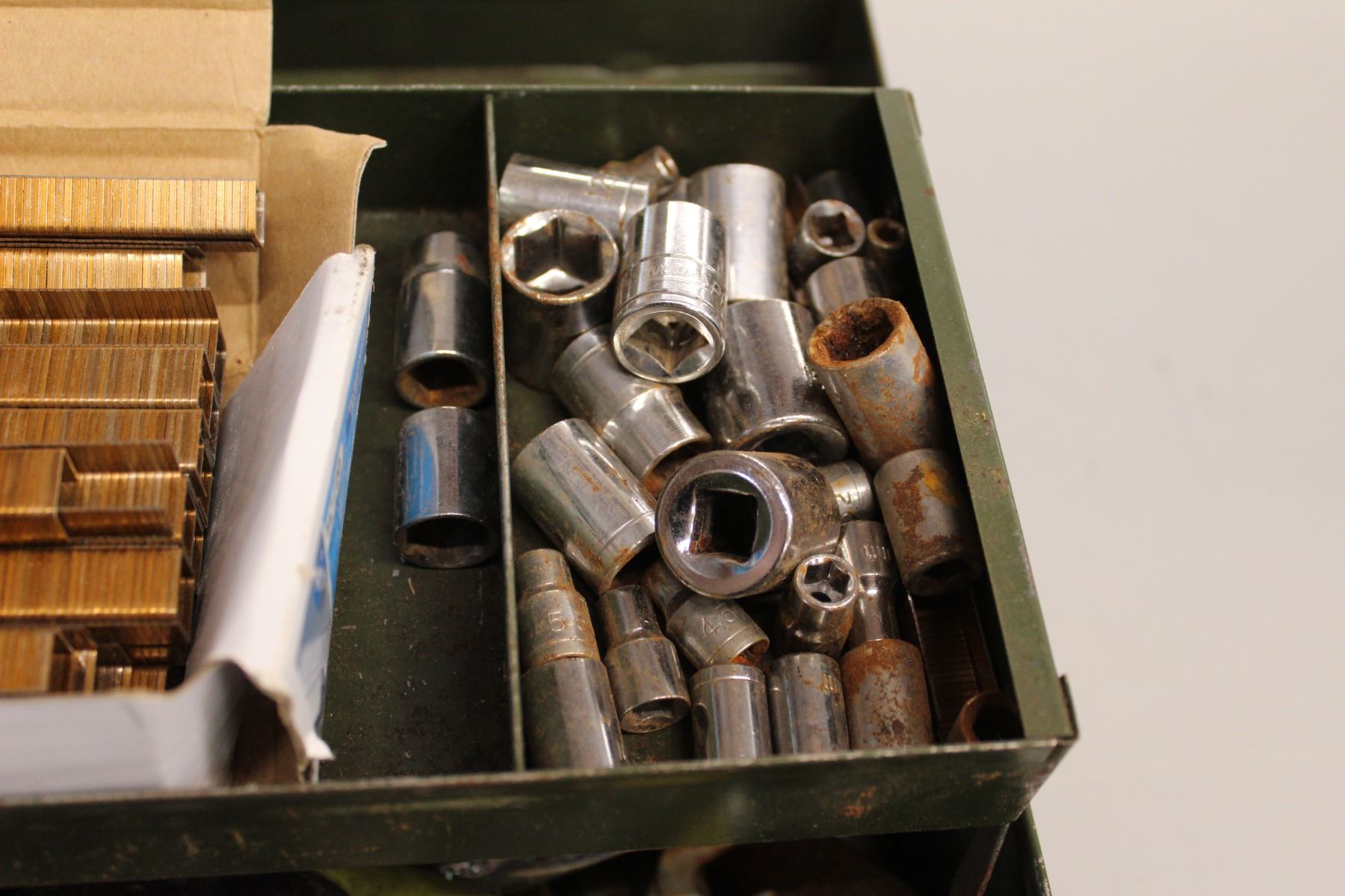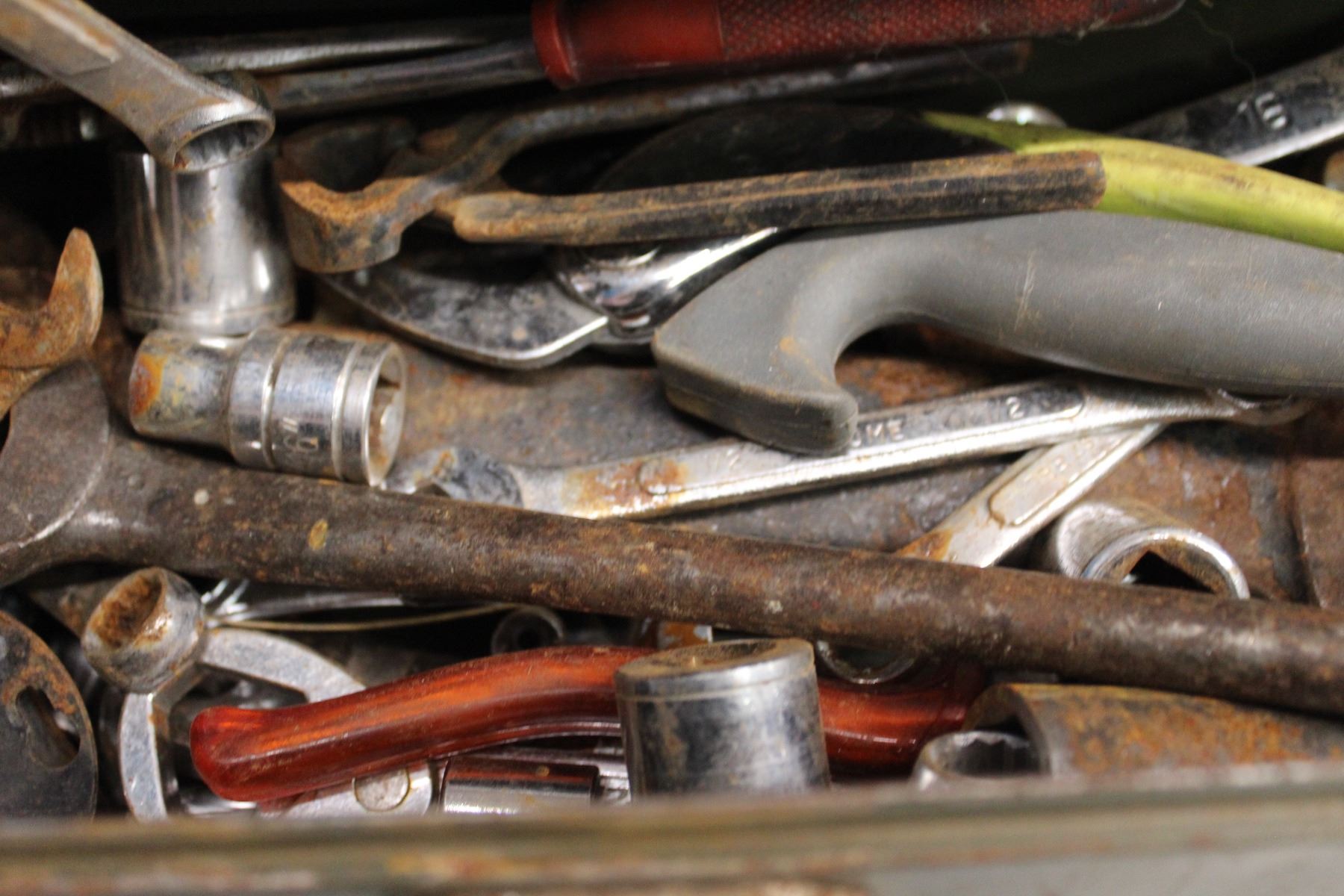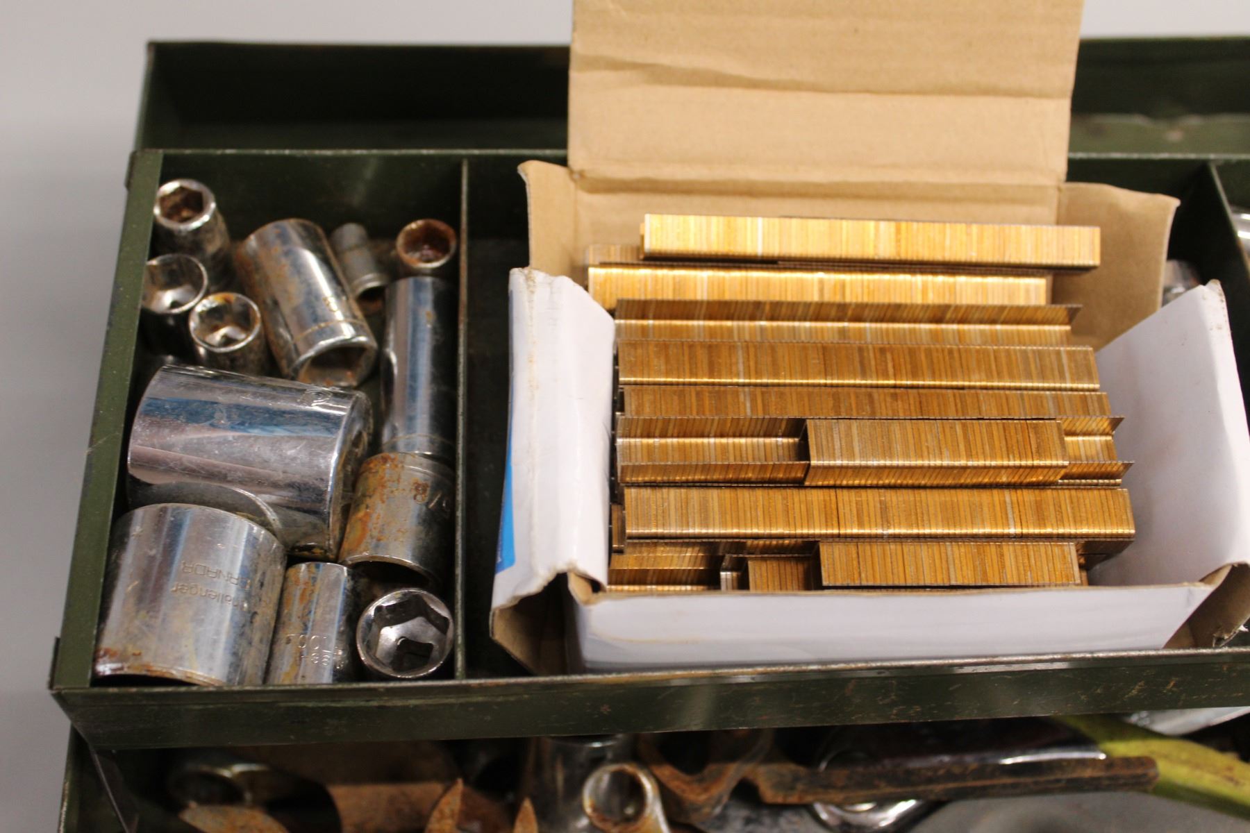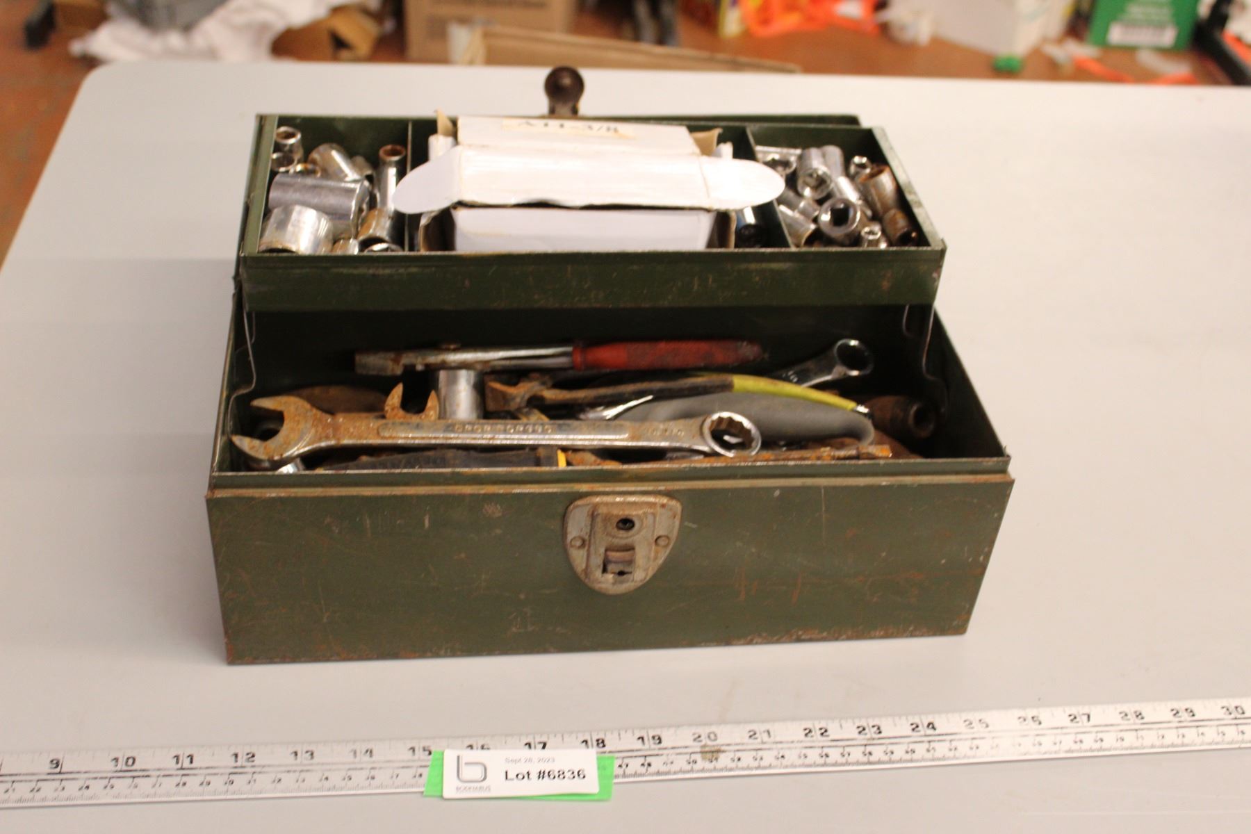 Metal Toolbox with Assorted Sockets, Wrenches, and Tools