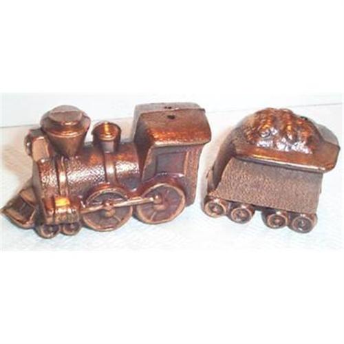 This fantastic Pair of Metal Salt and Pepper Shakers is in SUPERIOR condition with no chips, cracks, dings or hairlines. The pair consists one locomotive and one coal car. The locomotivemeasures 2.25" long and is 1" tall and the coal ccar is 1.50" long and 1" tall. Sorry to say I don't know the manufactuer.