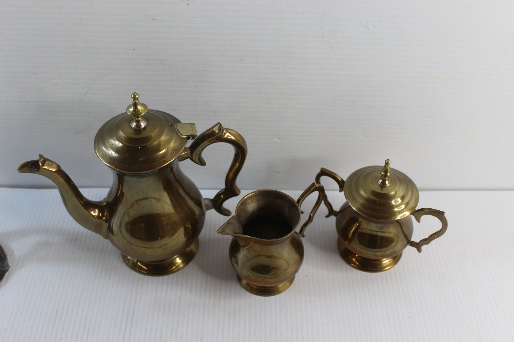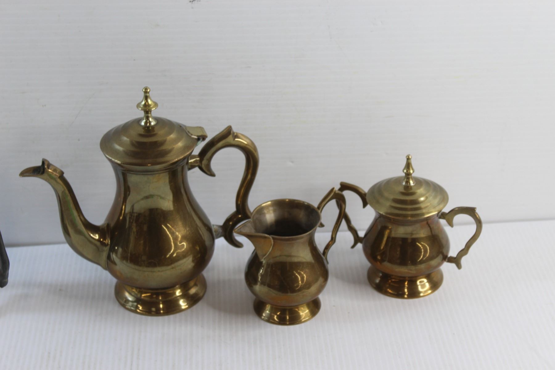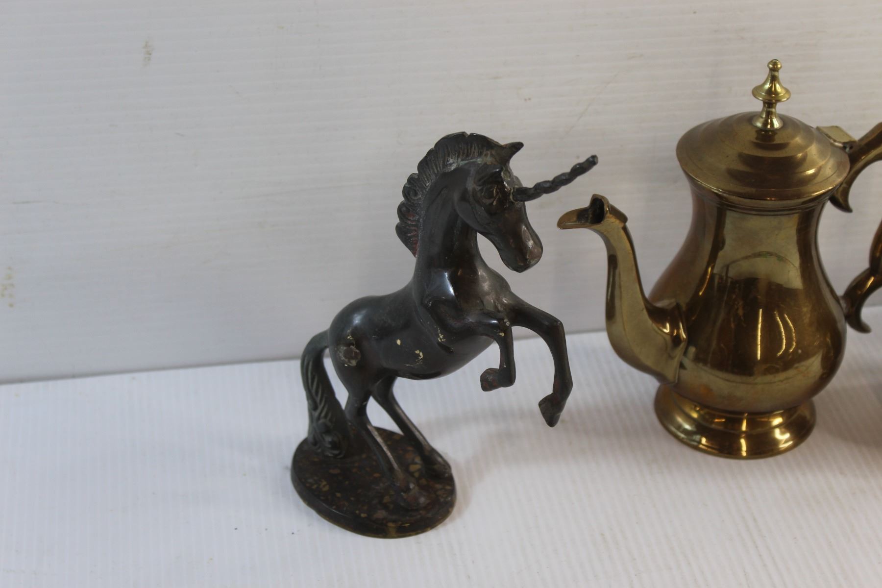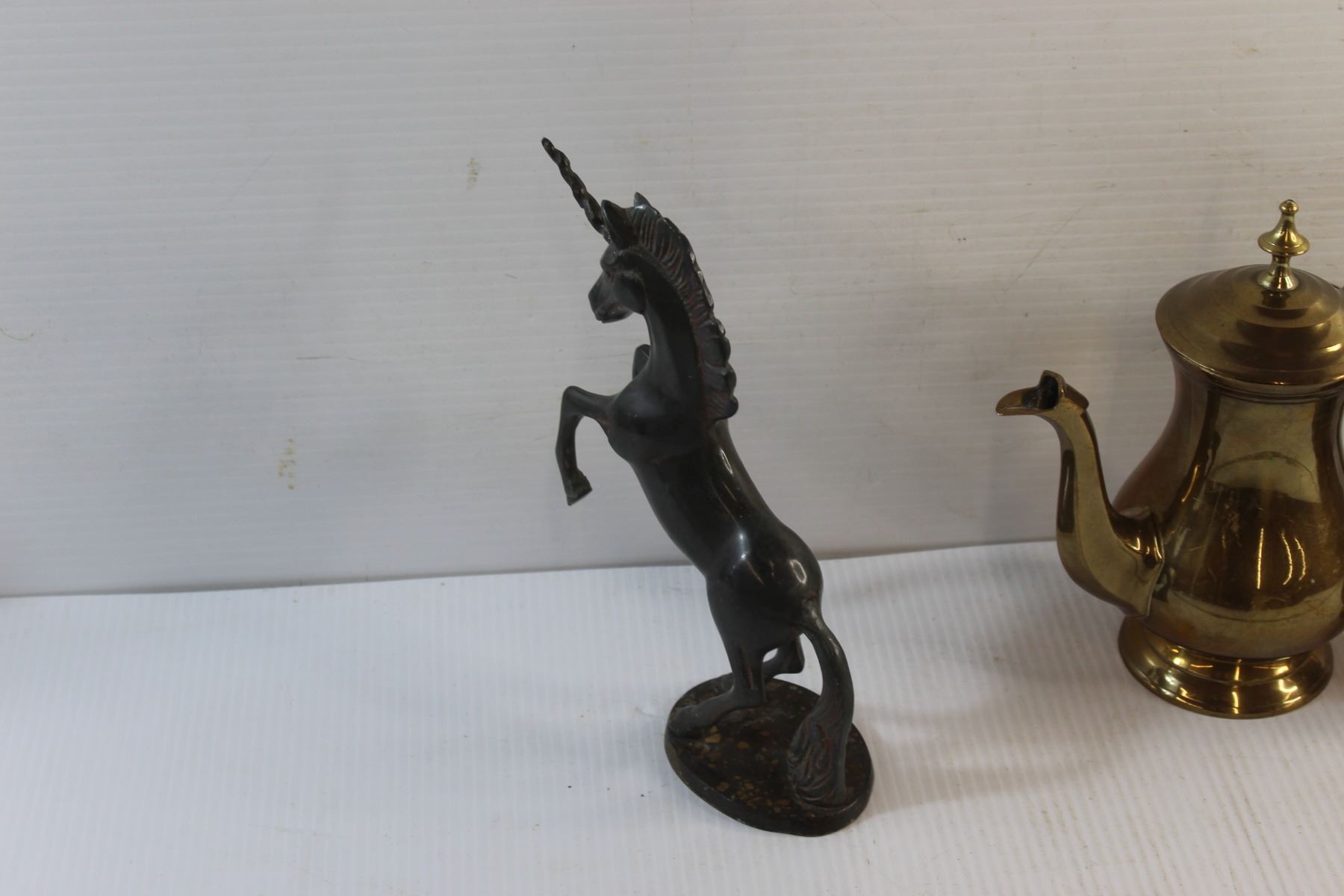 Metal Unicorn Statue and Brass Tea Pot & Cream and Sugar Set