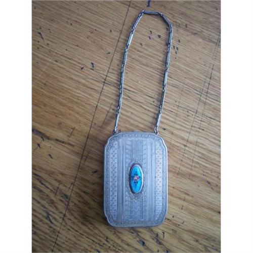 Very pretty silver tone vanity case with enameled flower on front.Inside there is a place for coins,powder and rouge.Small piece of mirror peeled off by rouge.Nice deco chain.Image in mirror I believe is my finger.This case has a very pretty deco design on the front and back both.