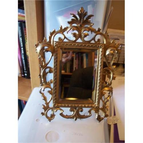 A beautiful metal mirror in a gold tone finish with a wonderful beveled mirror.Table top fold out leg.Could also be hung if you would run a ribbon through the top holes.The frame measures approx 12 x 8 3/4".The opening for the mirror is 4 1/2 x 6".