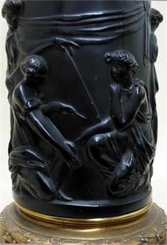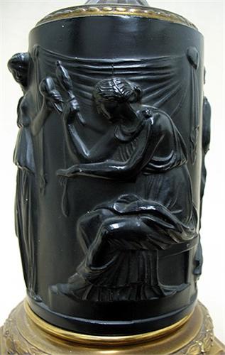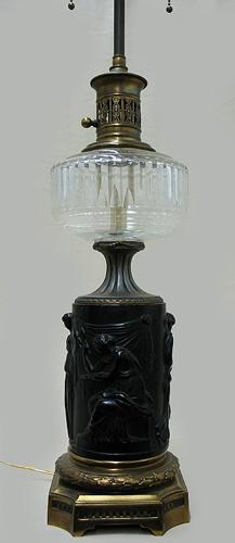 Metal and glass lamp; glass font over metal figural frieze; brass fittings and base; two light; mid 20th C.; measures 29" to socket (no visible defects)