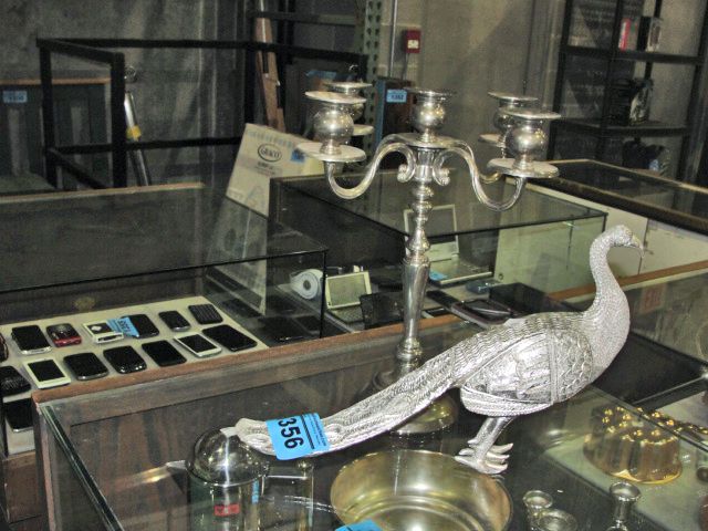 Metal bird ornament and a silver plated candelabra