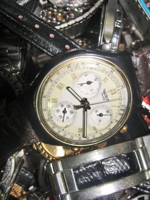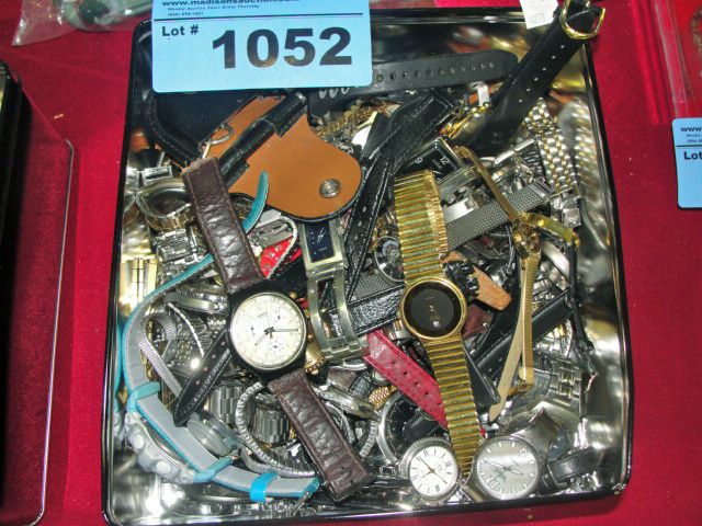 Metal box filled with assorted wrist watches