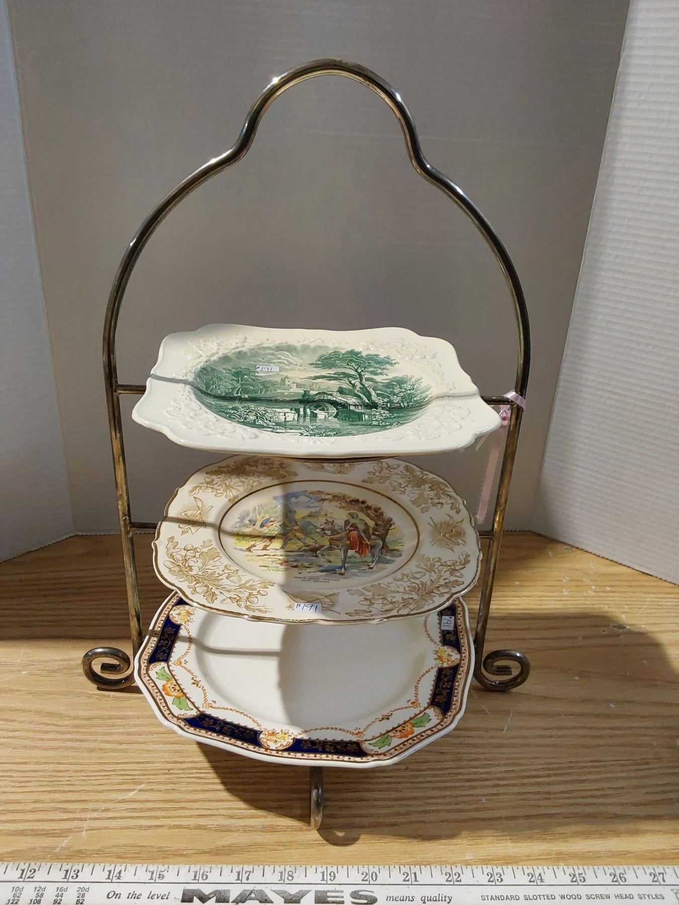 Metal cake stand and 3 cake plates made in England
