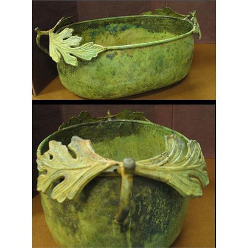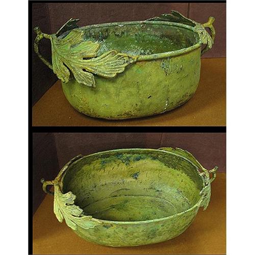 Pair of light weight metal containers adorned with Oak leaf handles, heavy faux patina in greens and brown. Would look good with pinecones in them by the fireplace… Largest one measures 6 1/2" deep, 10 1/2" wide and 18" handle to handle