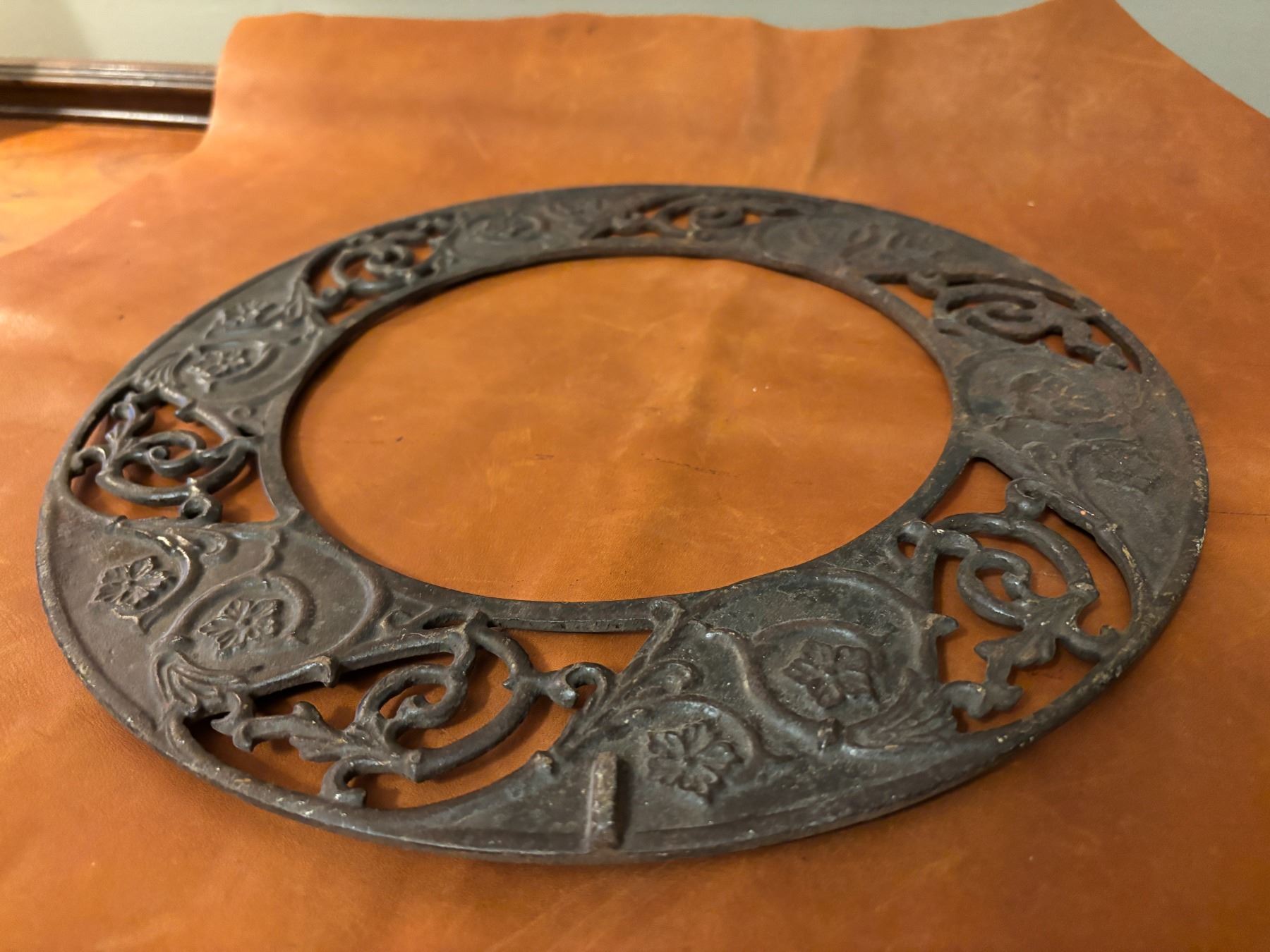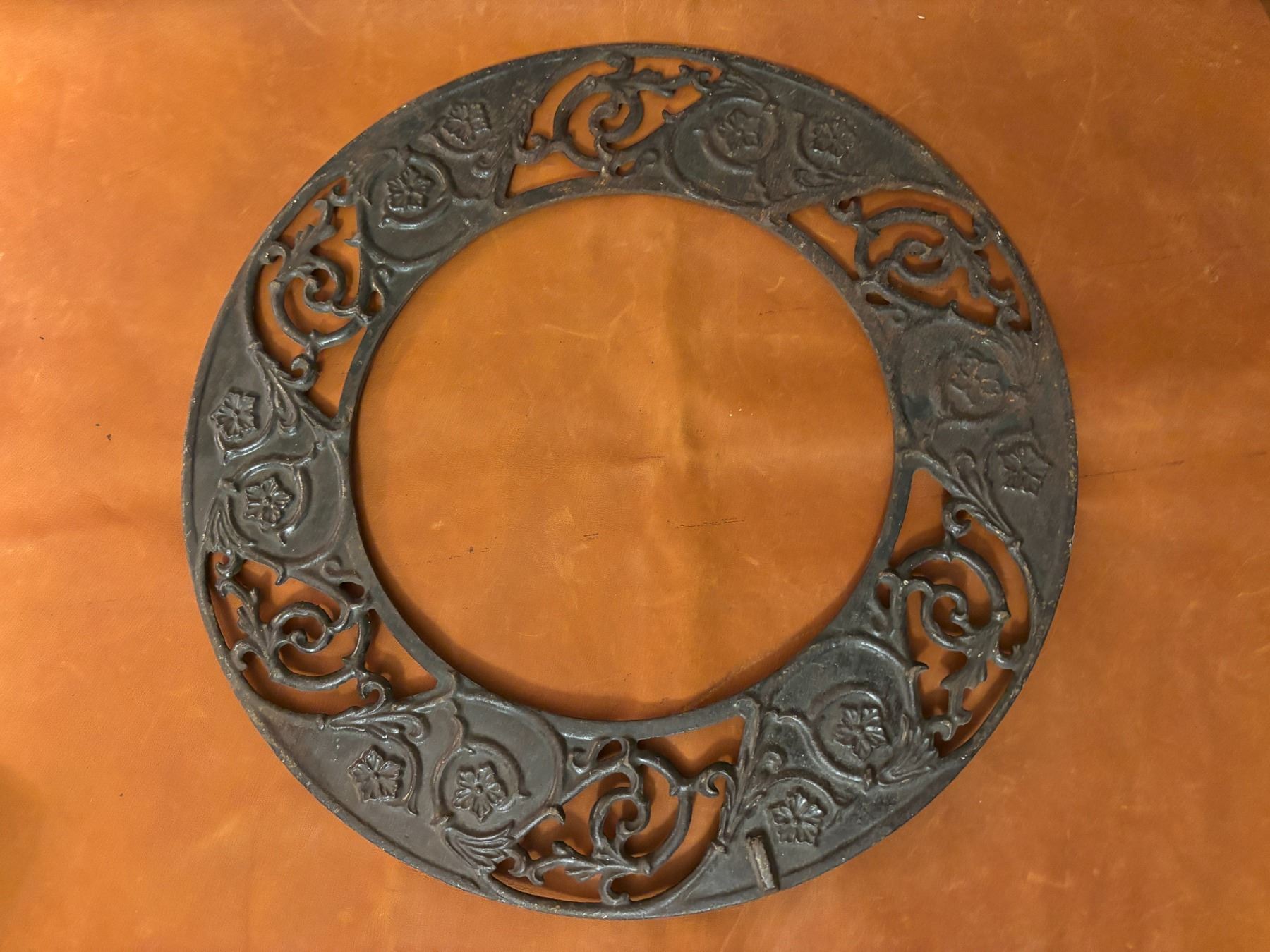 Perhaps a ring from around a stove/fireplace. Heavy metal, scroll design, 13” across, inner circle is 8”