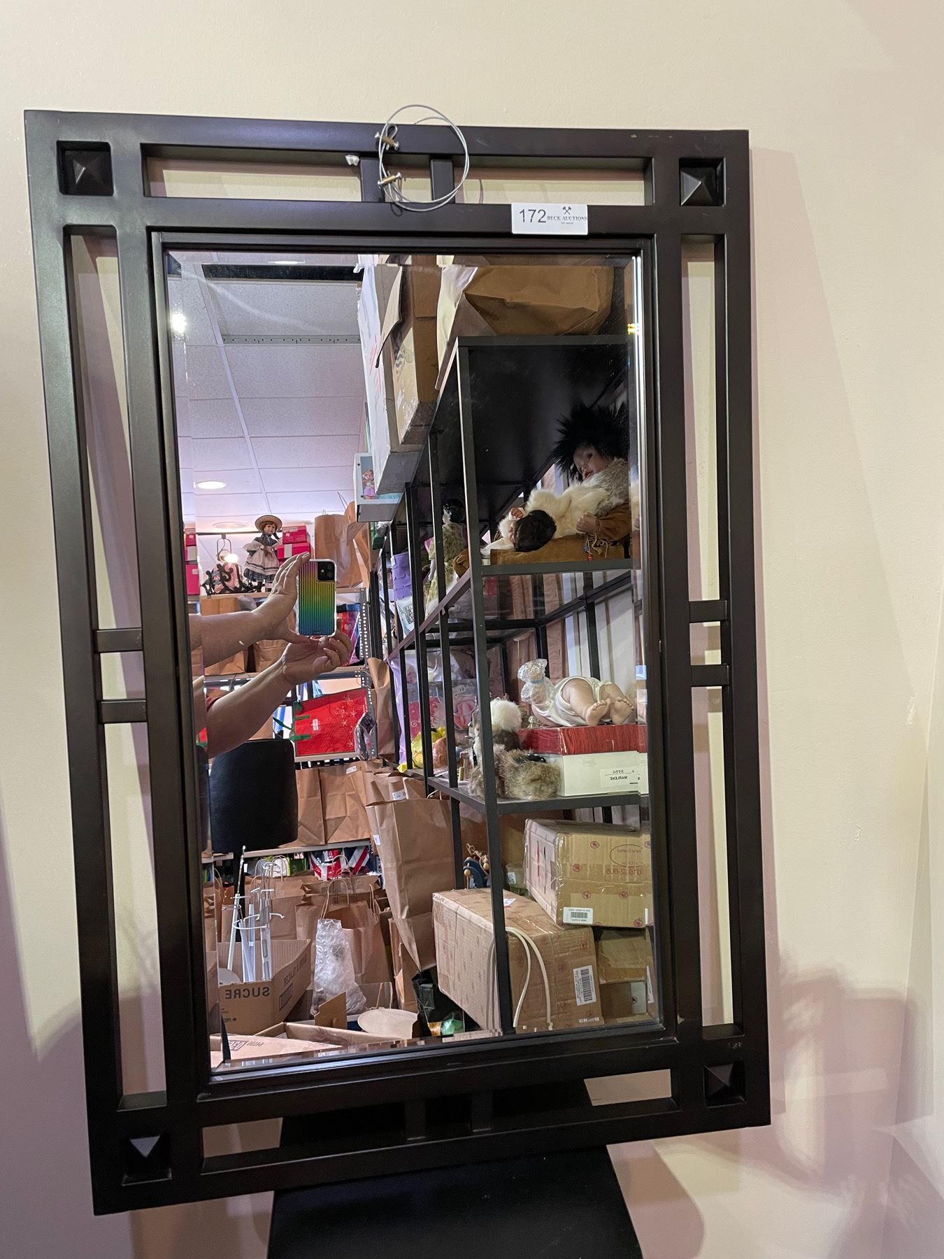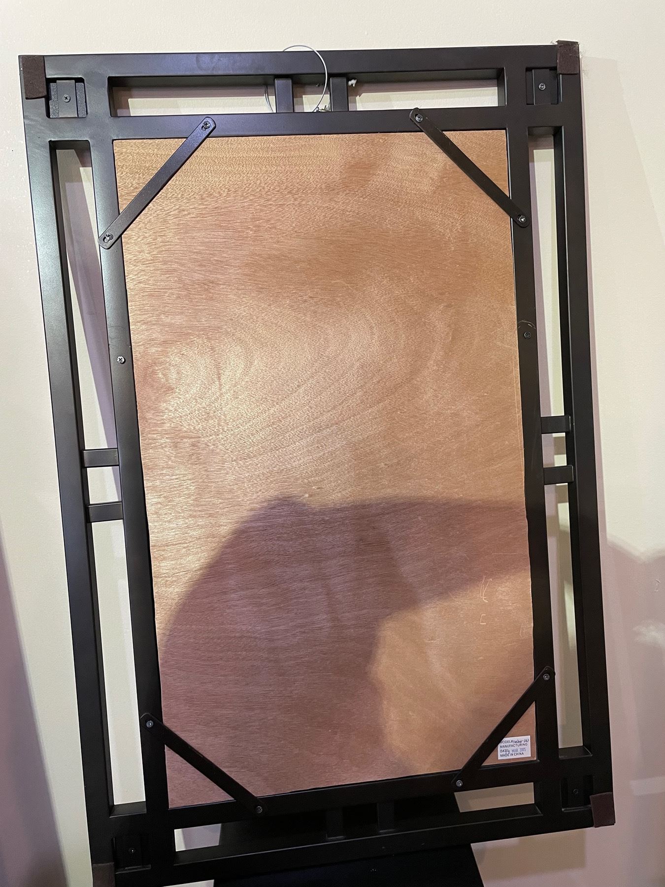 Large metal frame mirror, is heavy and solid. Plywood backing. Some scuffs and scratches on the paint, however with some fresh paint this is a very nice mirror. 36 inches tall x 24 inches wide.