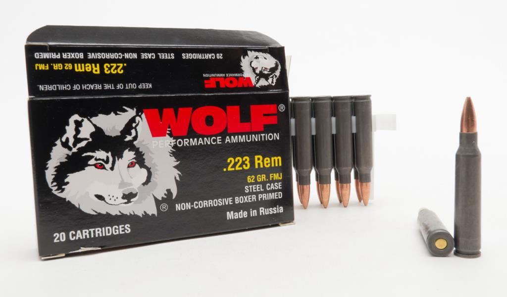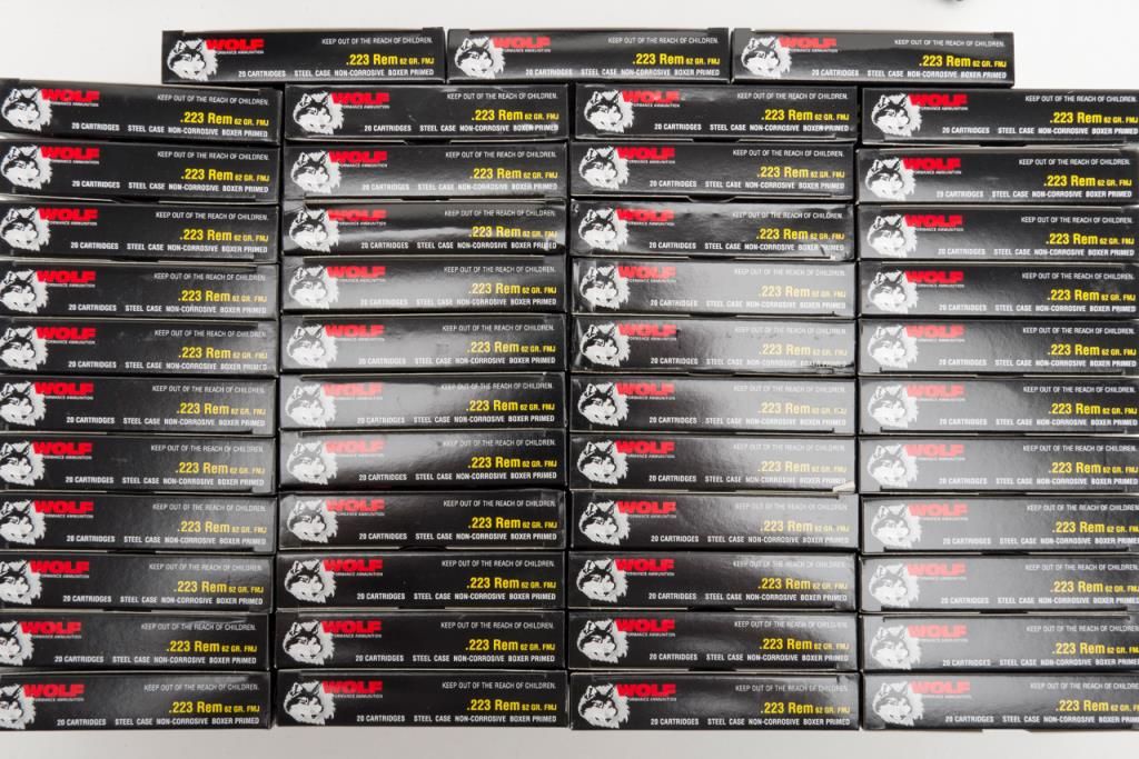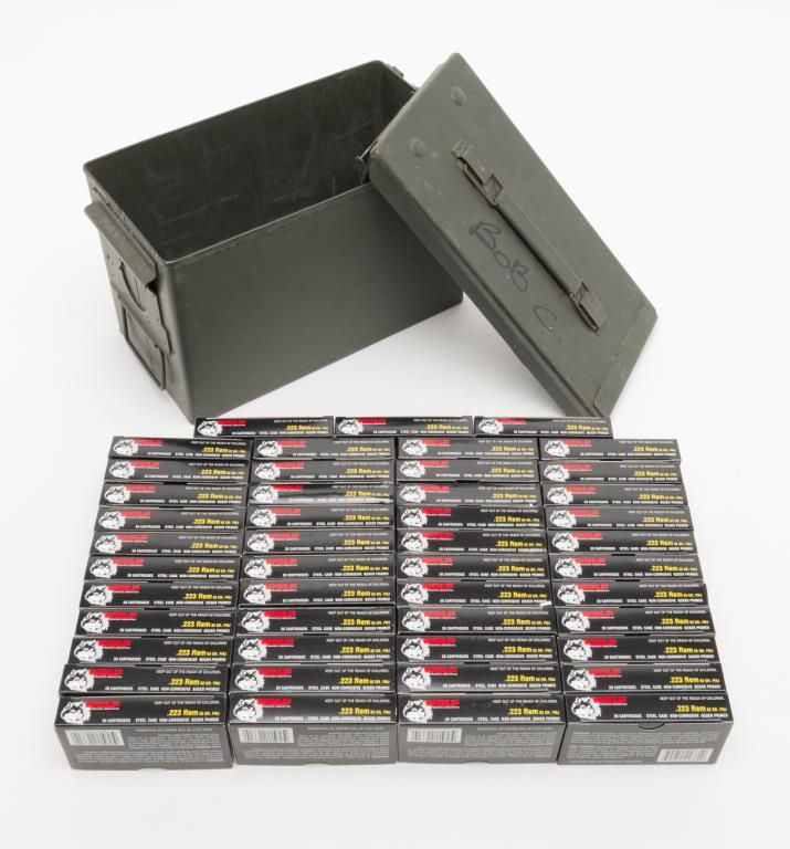Metal military can of 1,000 rounds of Wolf brand .223 Rem. steel case non-corrosive boxer primed 62 gr. FMJ ammo. in 20 cartridge boxes. Est.: $200-$400.