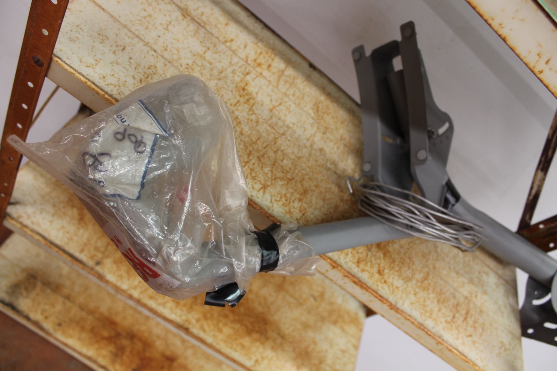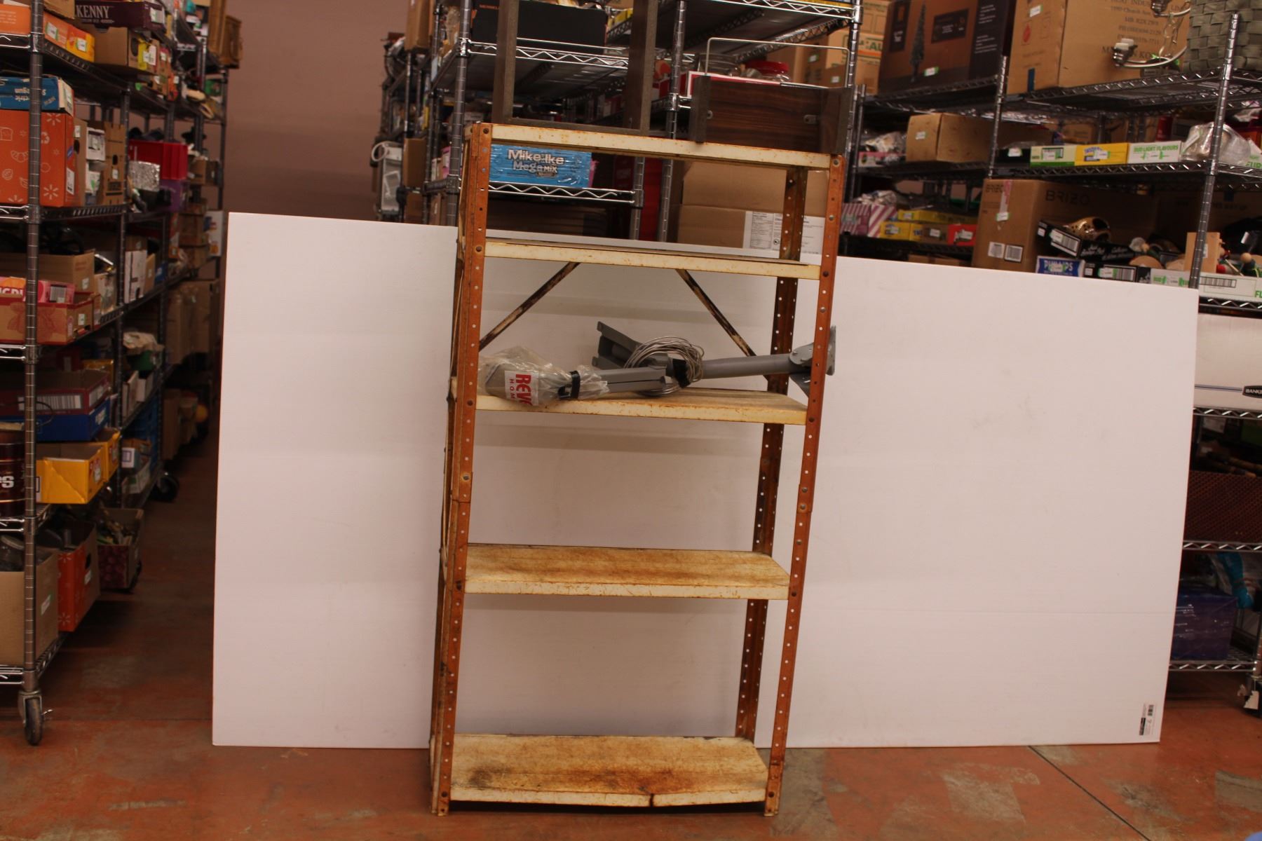 Metal shelving unit 55”x29.5”x12”, satelitte parts, misc. Wooden objects