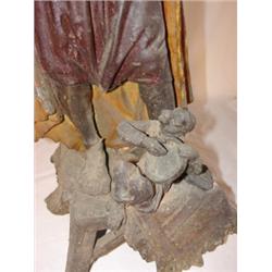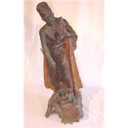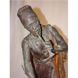 Metal statue of African tribal chieftain playing horn with monkey. 27" tall.