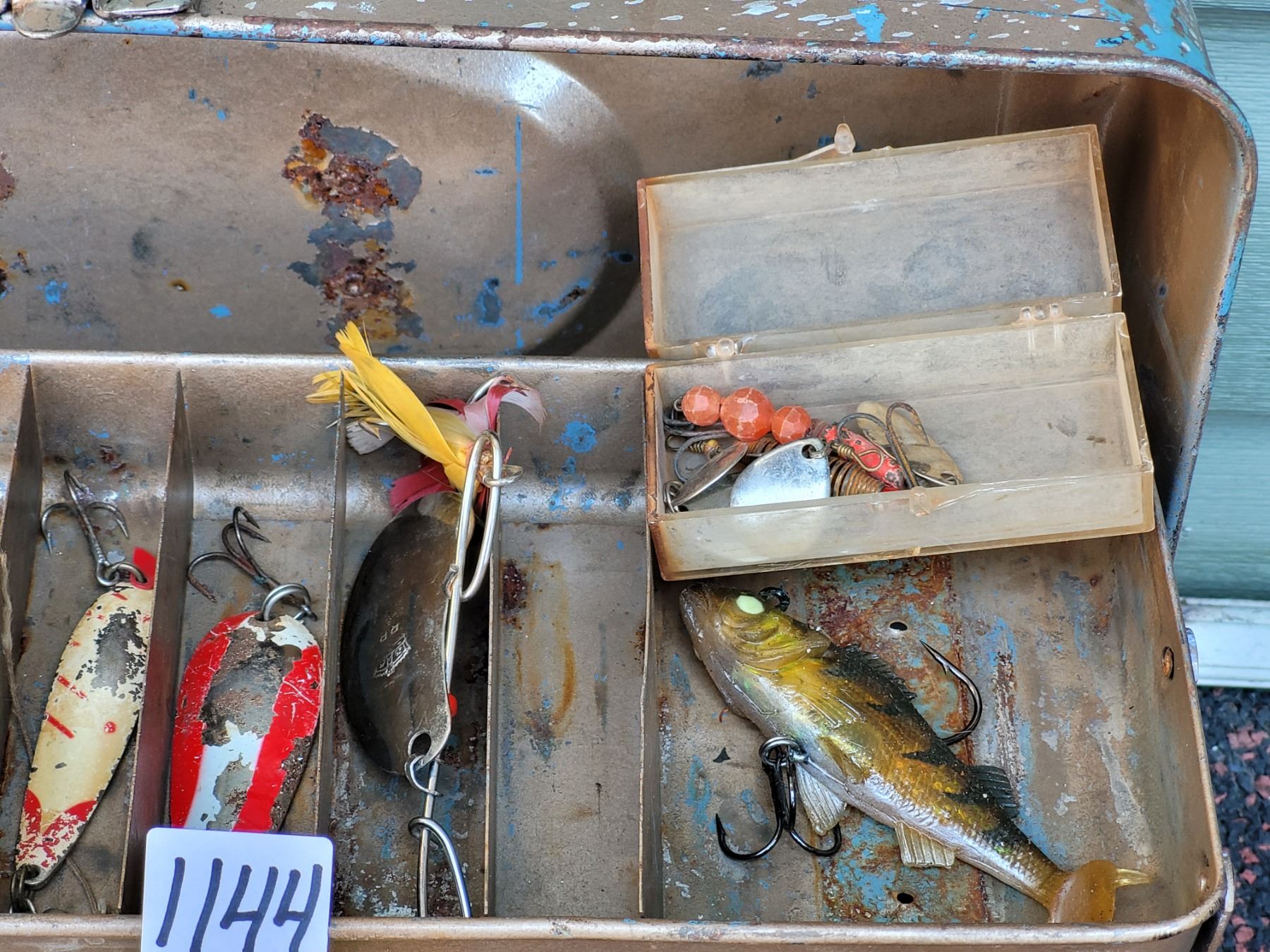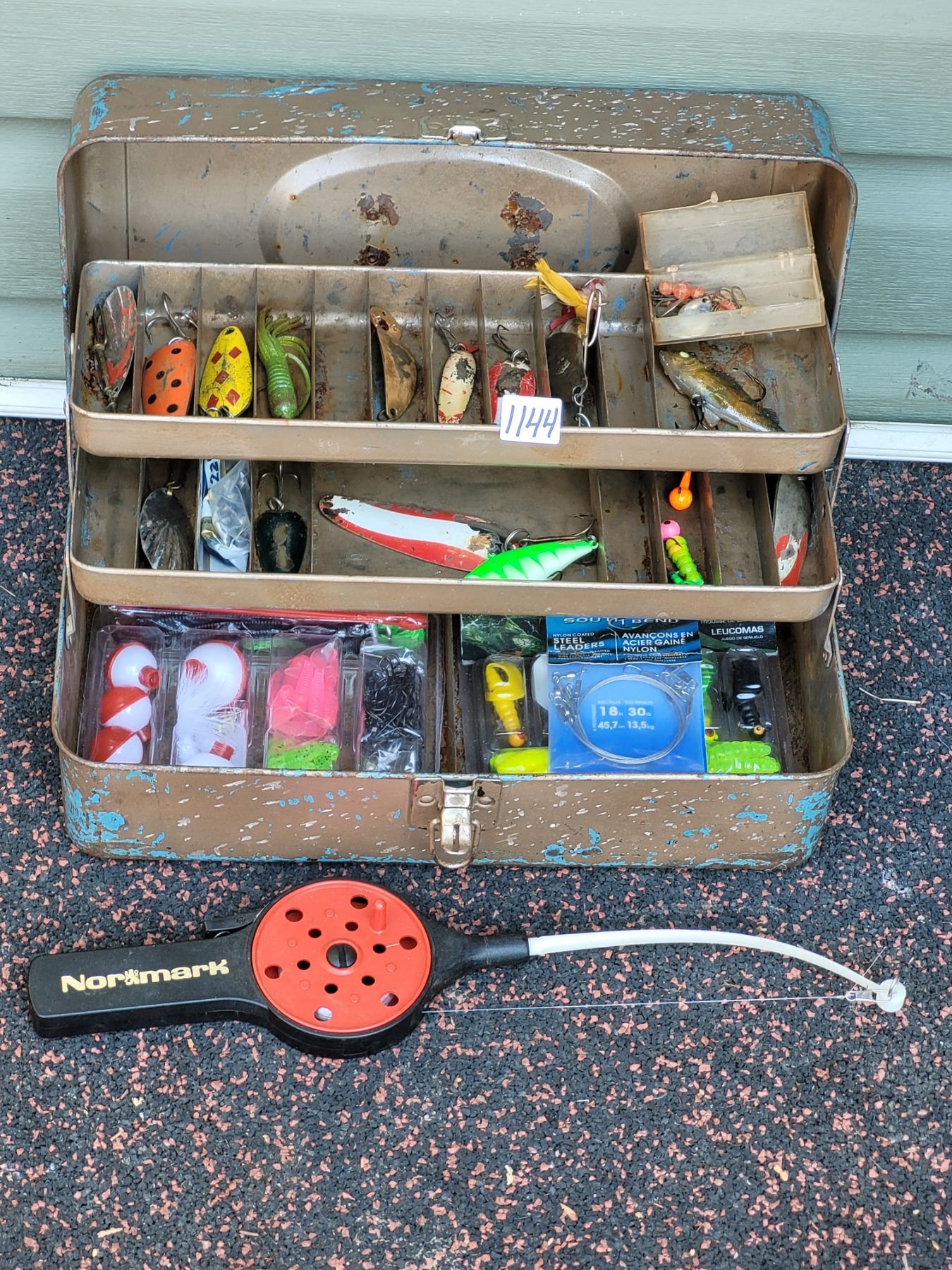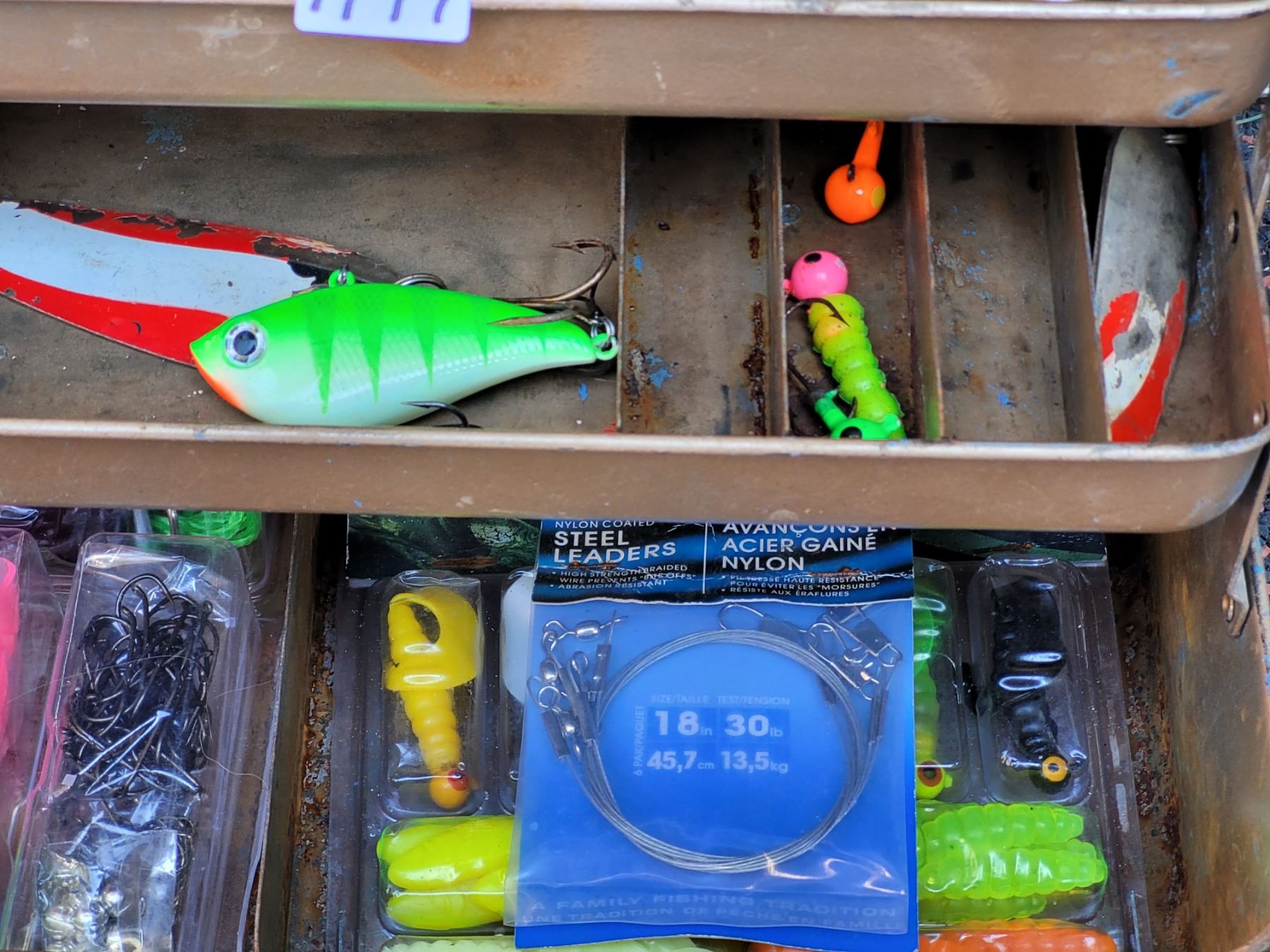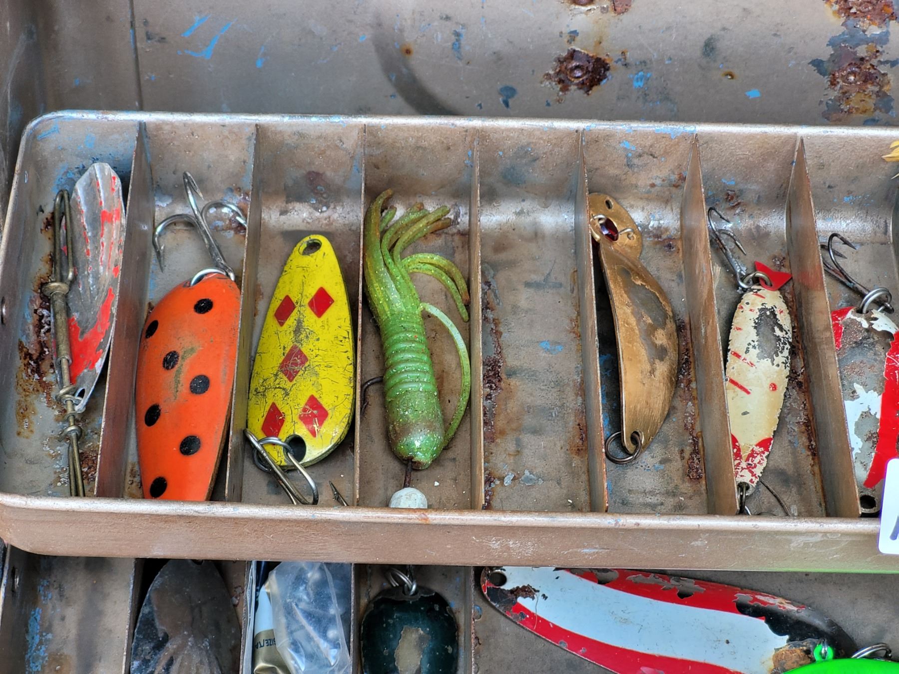 Metal tackle box & contents. Rapala hooks, Teho rod, popular spoons & more.