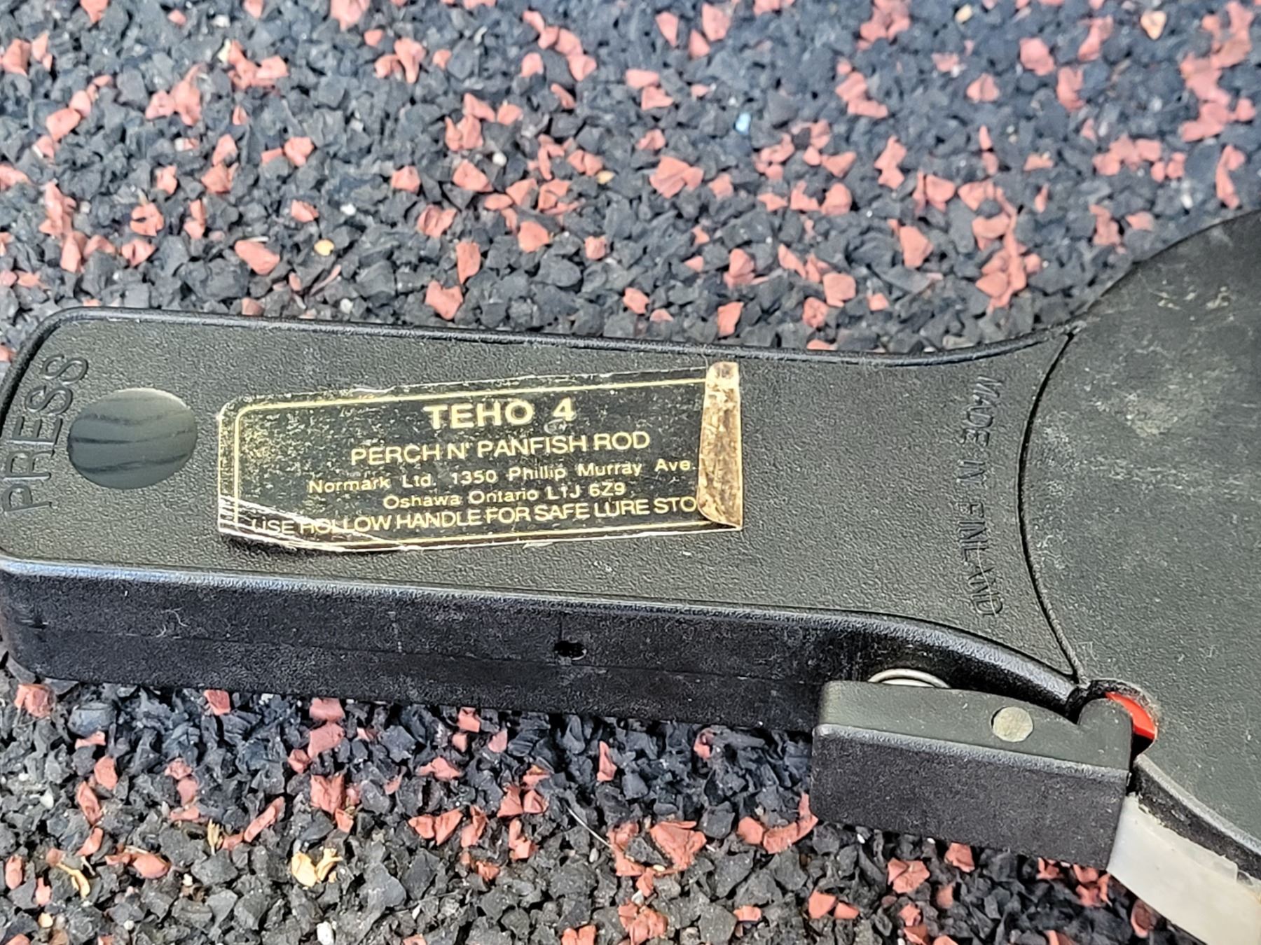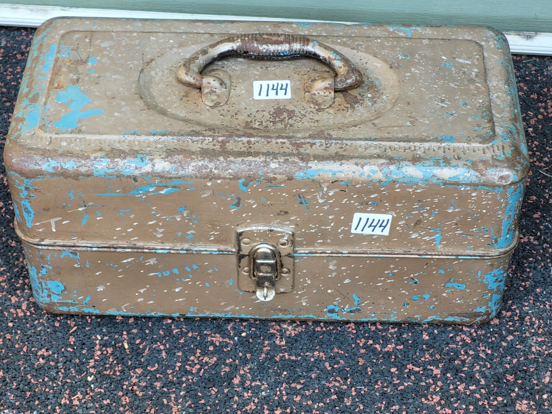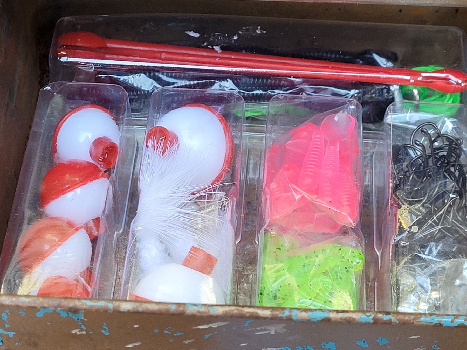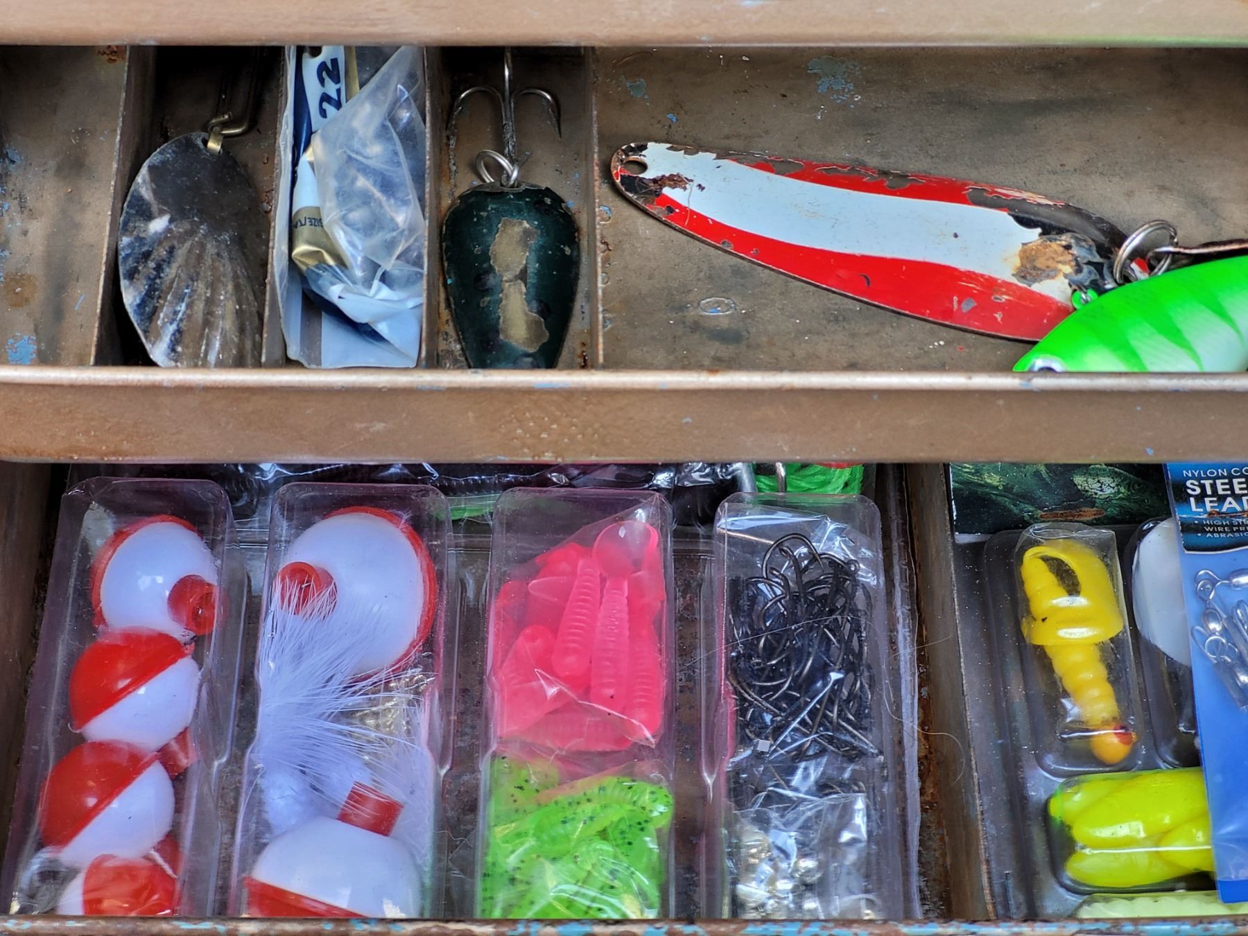 Metal tackle box & contents. Rapala hooks, Teho rod, popular spoons & more.