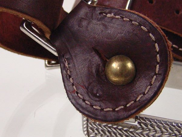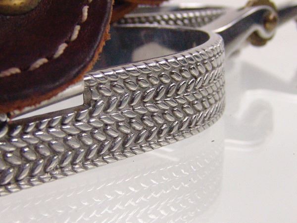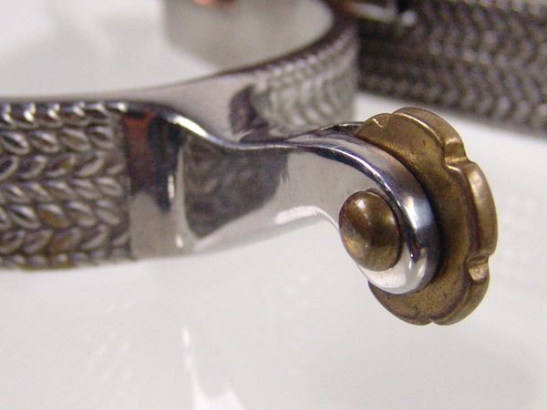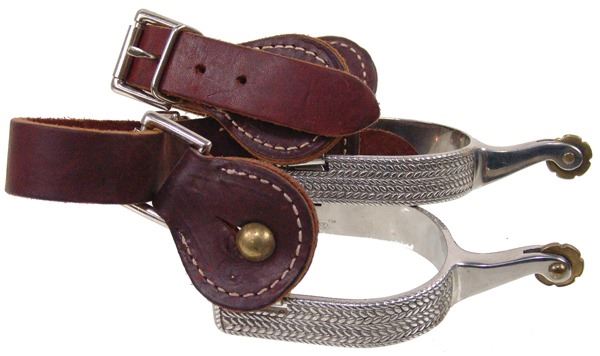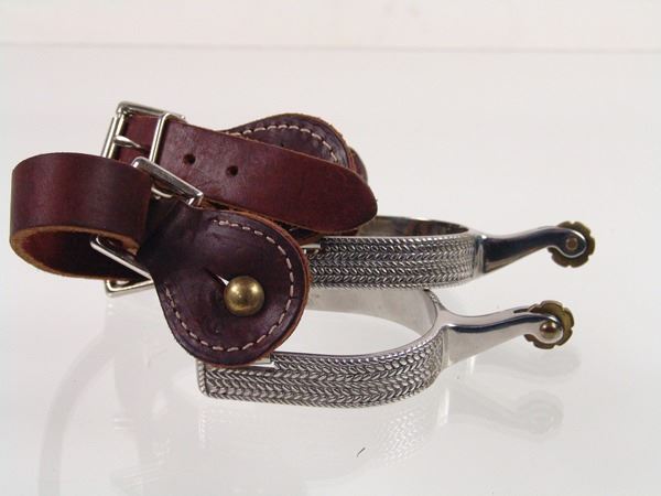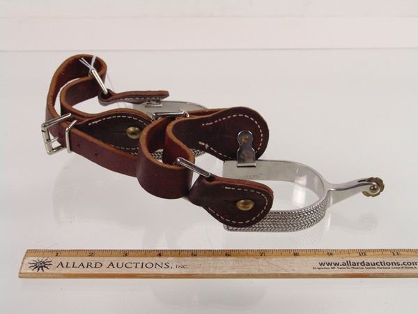 Mid/Late 1900s Standard Metalab cast stainless steel spurs with 3/4" notched brass rowels and new leathers. Good quality, good condition.