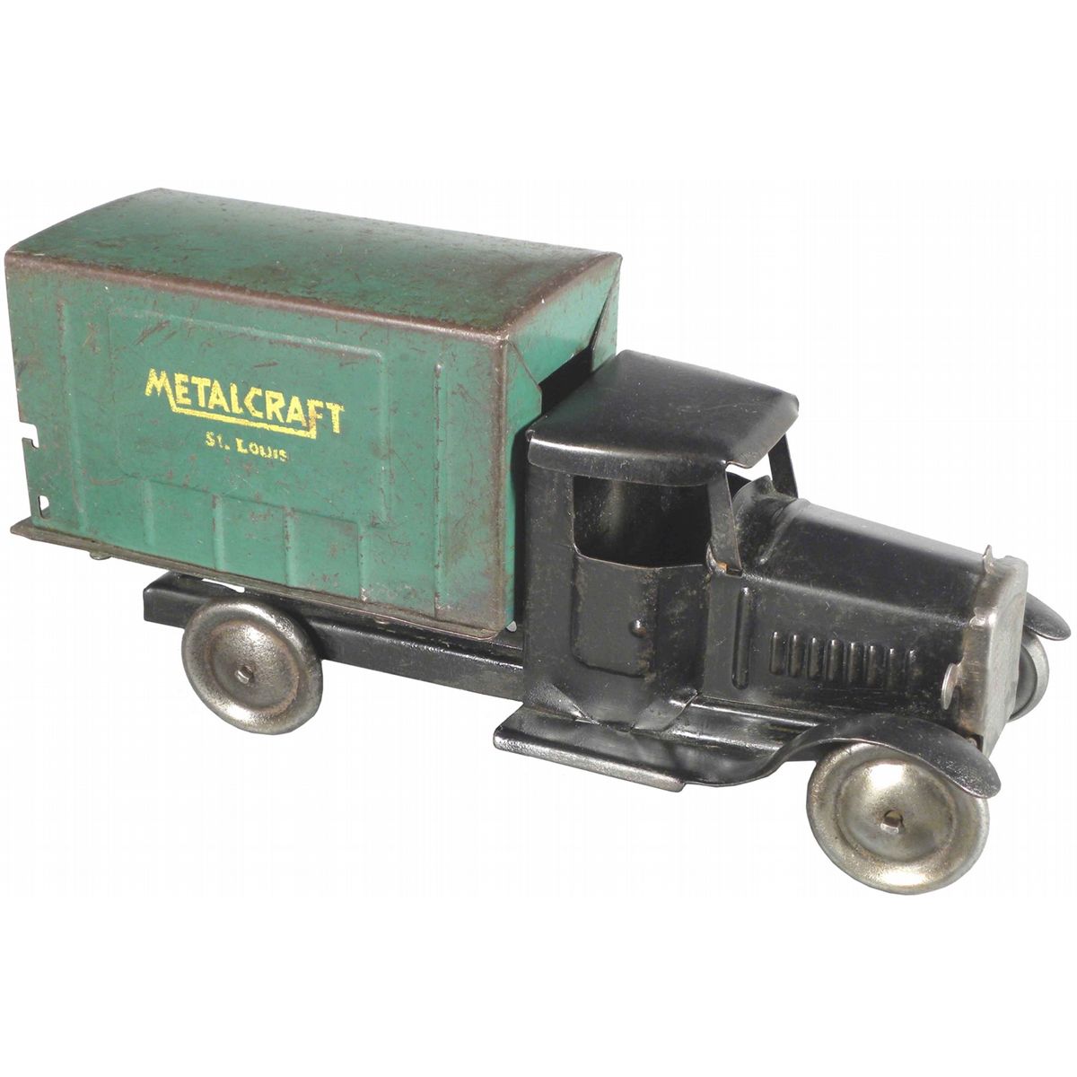 Metalcraft Pressed Steel Delivery Van Toy Truck. Black/Green w/disc wheels. Rear tail gate missing otherwise very good condition. 11 inches long.